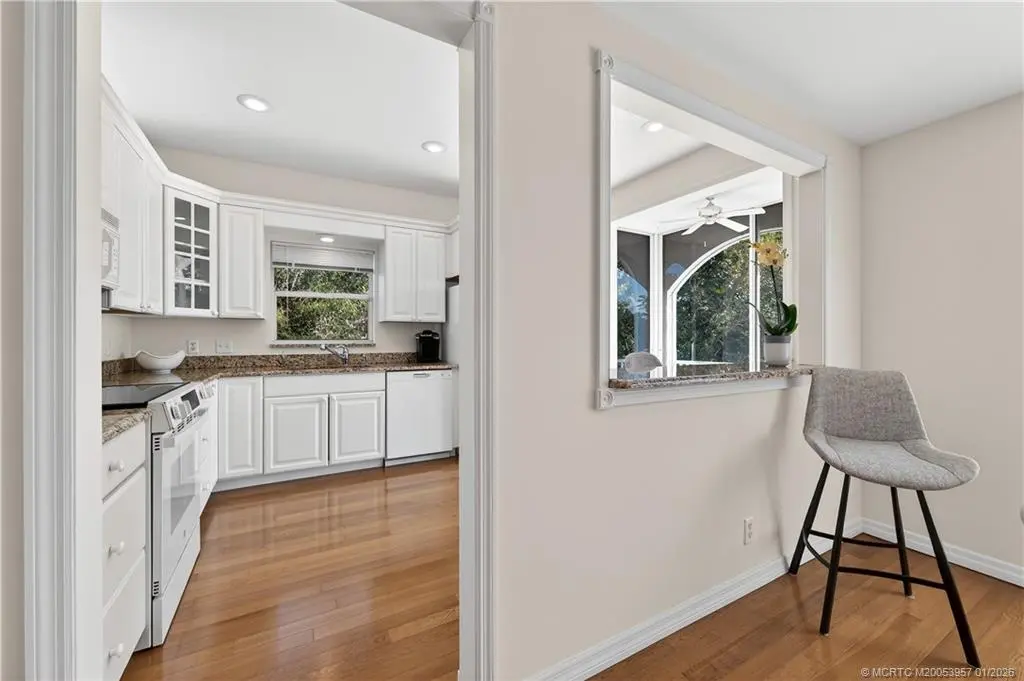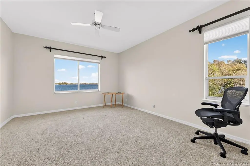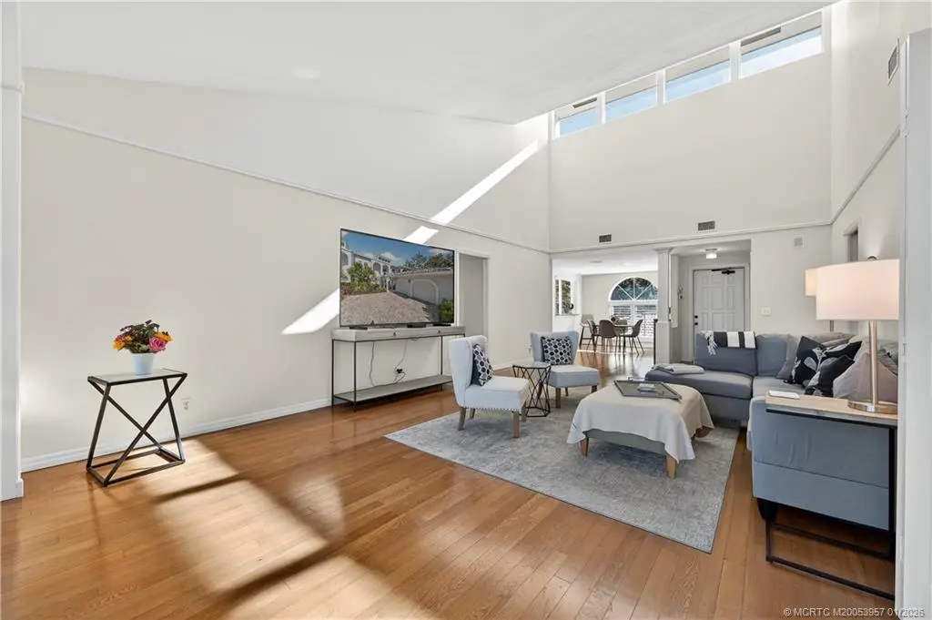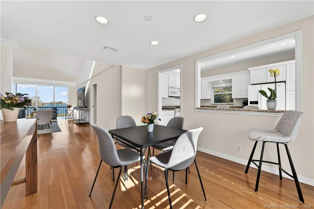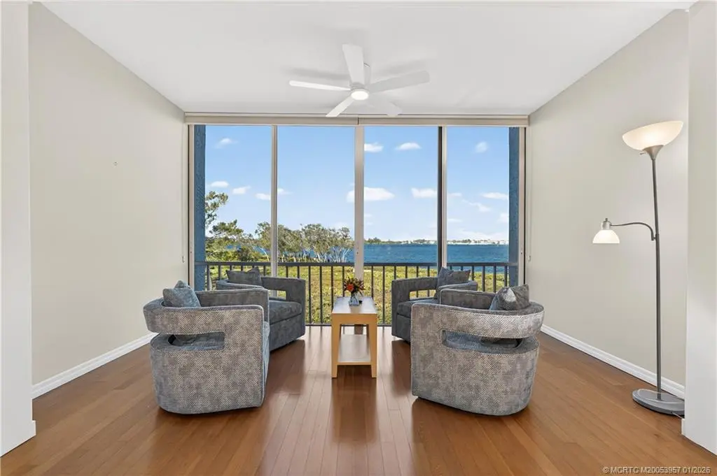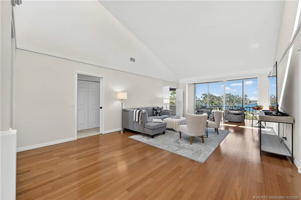 Enjoy panoramic, wide-water views of the St. Lucie River from this desirable 3-bedroom, 2-bath, second-floor corner condominium. Featuring vaulted ceilings, wood floors, and stunning river vistas, this residence offers true Florida living. Updates include a new refrigerator, dishwasher, and oven. The property also includes a one-car garage plus a separate golf cart garage. A rare opportunity to own a riverfront condo with exceptional views—this is a must-see. Harbour Ridge is a private, mandatory membership community featuring 2 beautiful 18-hole championship golf courses, 9 Har-Tru tennis courts, pickle-ball courts, impressive fitness facility w/ pool, sprawling waterfront clubhouse w/ 3 dining rooms, 2-mile riverfront walking path, biking, yacht club, and marina with boat slips available for additional fee. $125,000 Equity ($1,000 Refundable) due at closing. Monthly HOA Fee includes Club Dues, Trail Fees, POA, Village HOA, Capital Funds Fees & appropriate taxes.