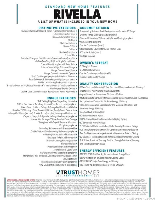 TRUST HOMES NEW construction. This 3/2/2/ home is under construction in the gated community of Rivella. The home comes with an extended covered lanai that overlooks a lake. The gourmet kitchen comes with standard features including 42" cabinetry, granite countertops, gas appliances, kitchen island and much more. Close to the new pioneer park port district, botanical gardens, restaurants and the boardwalk. Additional lots available along with additional home options currently under construction.
