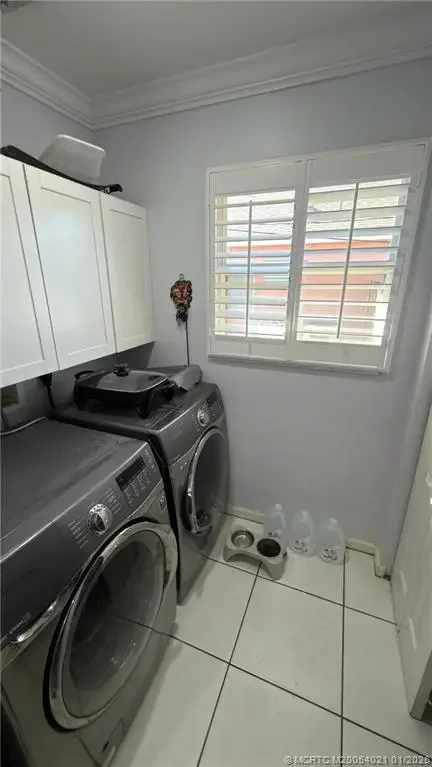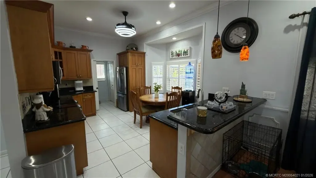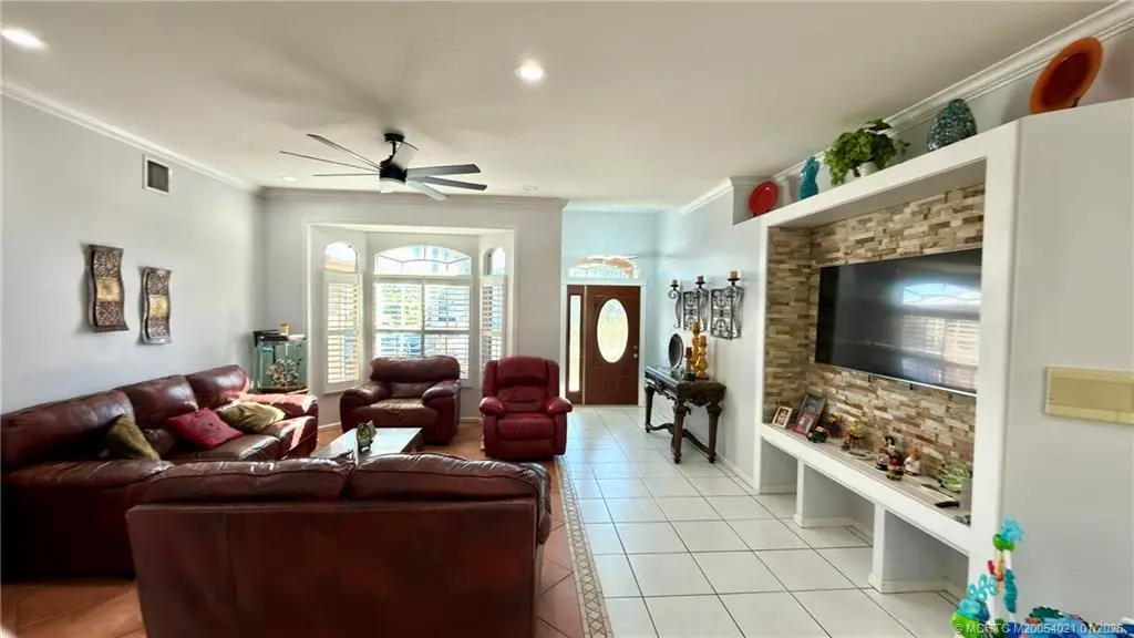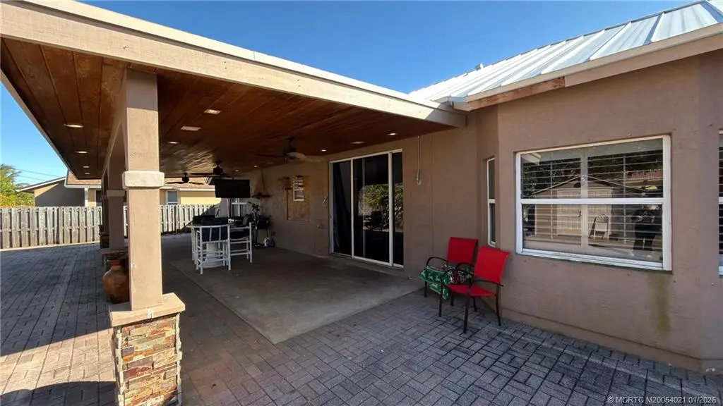 Move-in ready 4 BR/2BA home with 2-car garage in Port St. Lucie, conveniently located near I-95 and the Turnpike. Features include a 1 year old metal roof, 4 month old A/C and a 2 year old water heater. Recently painted inside and out. This home has ceramic tile throughout, crown molding, ceiling fans, and recessed lighting. Kitchen offers wood cabinets, granite countertops and stainless steel appliances. Fully remodeled bathrooms with quartz countertops. Large covered back porch with concrete columns and wood roof, perfect for entertaining. Pavered backyard with sprinkler system on well water and two sheds that convey. Home is fully fenced in for privacy. Hurricane shutters, plantation shutters in select areas, intercom and interior/exterior security camera system included. Washer and dryer convey. Come tour this astonishing home now!