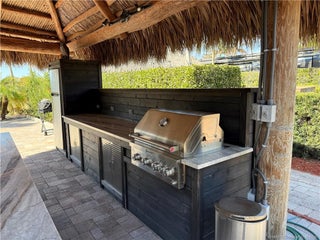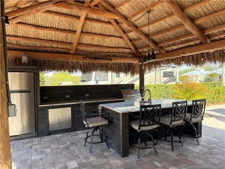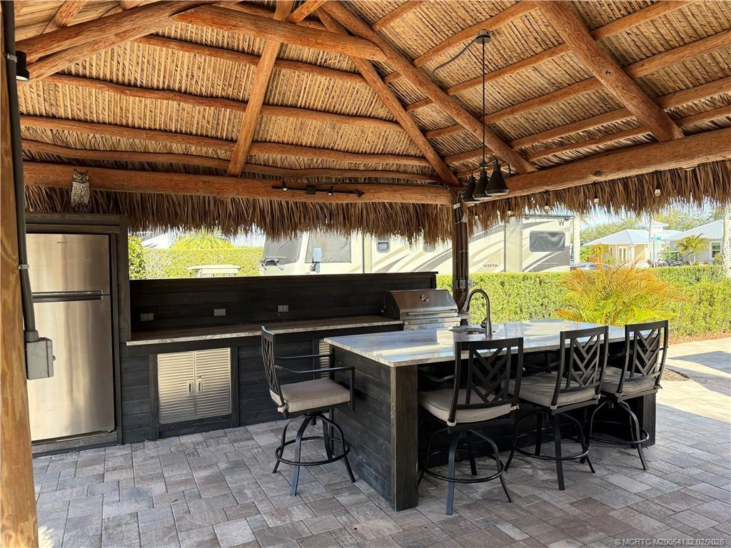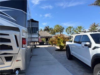 Perfectly positioned within a prestigious Class A–only resort, this exceptional pull-in lot blends convenience with breathtaking scenery. Ideally located near the exit gate for effortless access, it enjoys a premier golf course setting with sweeping views of manicured greens and a sparkling lake beyond. The spacious tiki is designed for upscale outdoor living, featuring a granite-topped island and countertops with a built-in grill—perfect for entertaining in style. Facing the 5th green, the lot captures spectacular sunset vistas, with glowing skies reflecting across long water views to create an ever-changing backdrop. A neighboring common area borders the entertaining side of the coach, enhancing the sense of openness while maintaining comfortable privacy. This rare offering delivers expansive golf and water views, easy accessibility, and an inviting, airy ambiance within a sought-after luxury motorcoach community.