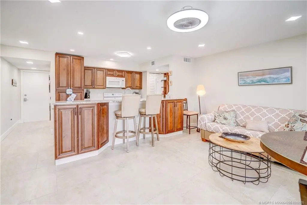 Escape the cold and live in paradise! Just a short walk to the beach, this first-floor, completely renovated condo offers easy coastal living with no stairs and true move-in-ready condition. Features include impact glass throughout, LED lighting, and a spa-style custom tile shower with sea-glass niche and dual shower heads. The updated kitchen provides abundant storage with an oversized pantry and added cabinetry on both sides. Enjoy extra living space in the glass-enclosed patio overlooking the peaceful lake — perfect for morning coffee or evening sunsets. Optional Ocean Club membership provides private beach access, three additional pools, two hot tubs, fitness centers, tiki bars, café, bowling alley, and dining at the golf clubhouse and main hotel. Pet friendly!