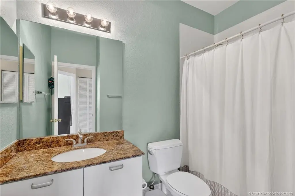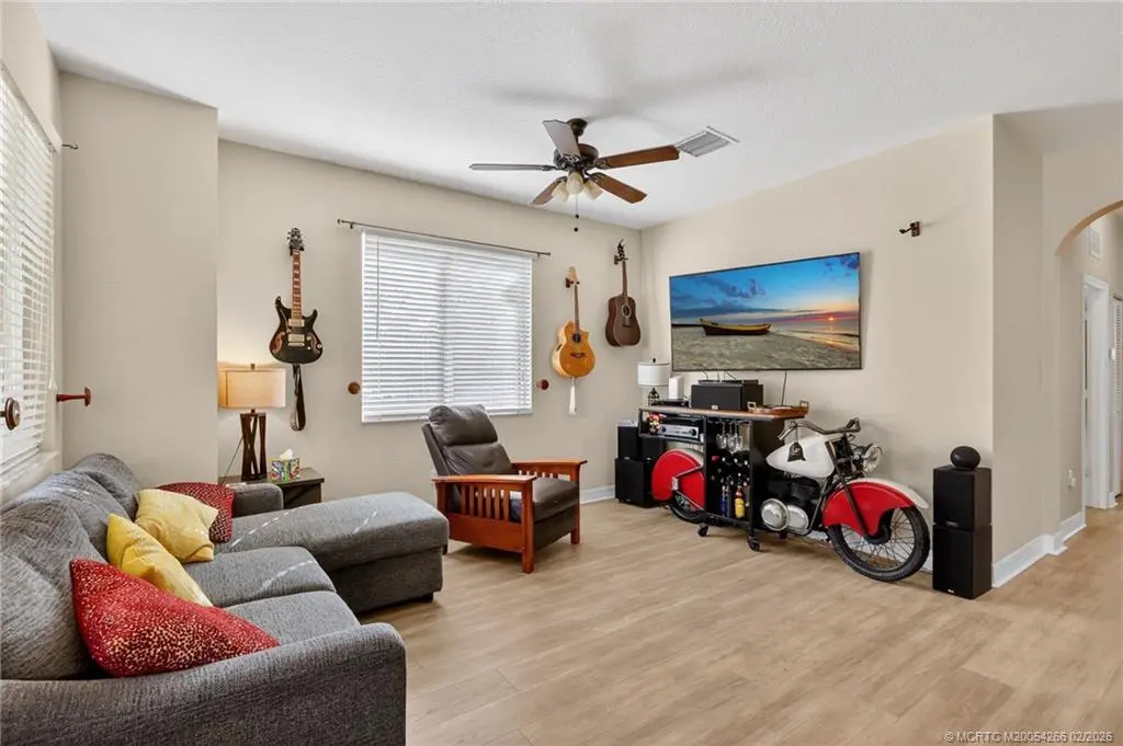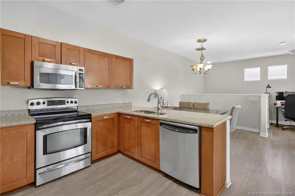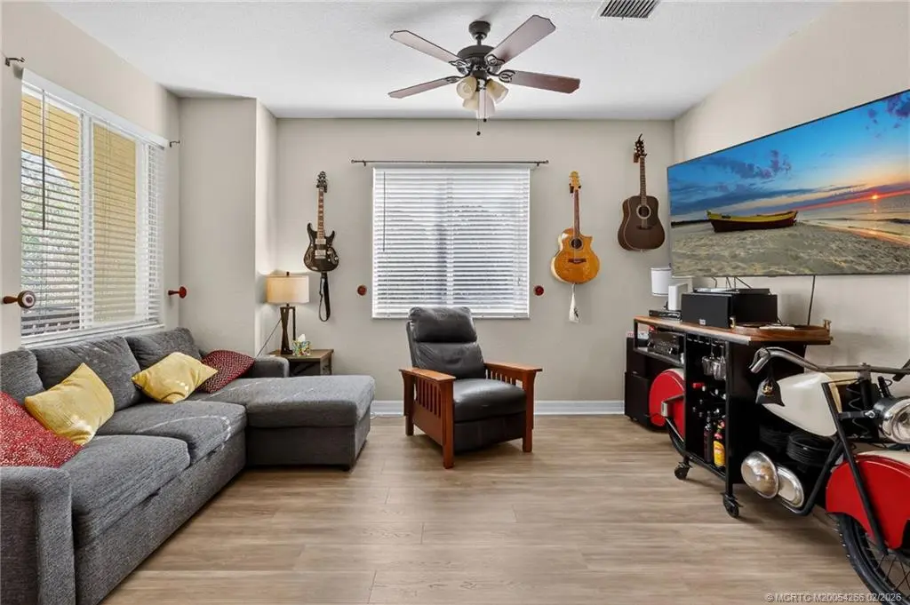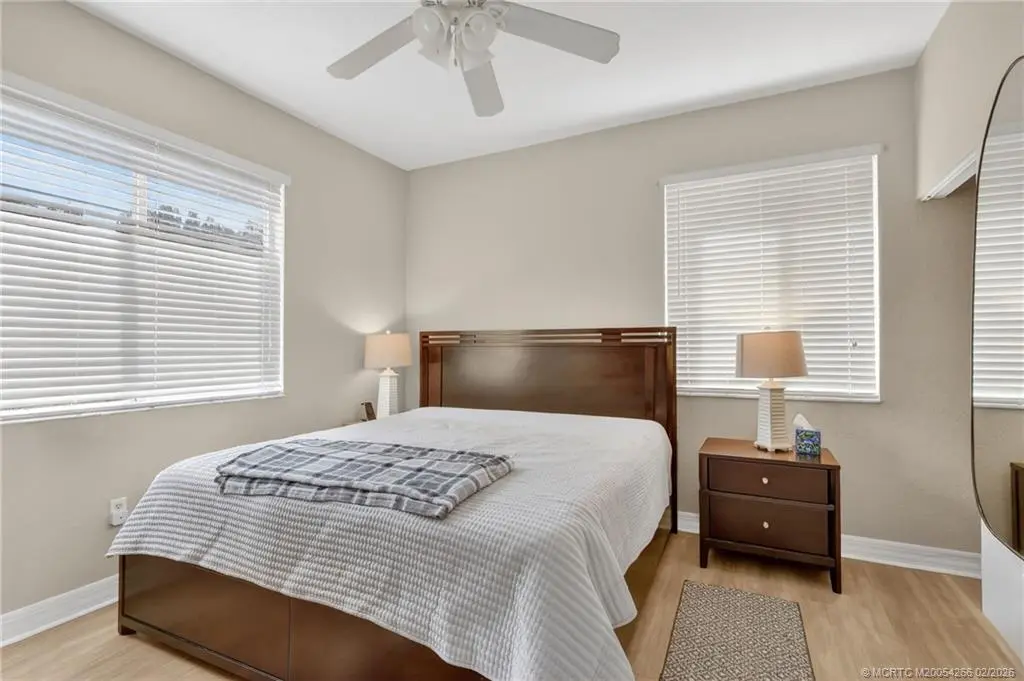 Discover this spacious corner home with two bedrooms, two full bathrooms and an attached garage. Located in desirable VILABELLA, just minutes to charming downtown of historic waterfront Stuart. The open living space is filled with natural light, shaker-style wood kitchen cabinetry, granite countertops, and stainless steel appliances. Updated with wood tone luxury vinyl flooring and a modern step in shower with stylish tiles. Enjoy volume ceilings, private balcony and in unit washer and dryer. Just minutes from downtown Stuart, enjoy easy access to dining, shopping, golf, beaches, and I-95. On site pond with tranquil fountain, pool, clubhouse with fitness room, playground, picnic area, gated entry, & basic cable. Pets, trucks and motorcycles are welcome. Rentals are acceptable with a three-month minimum immediately after purchase.