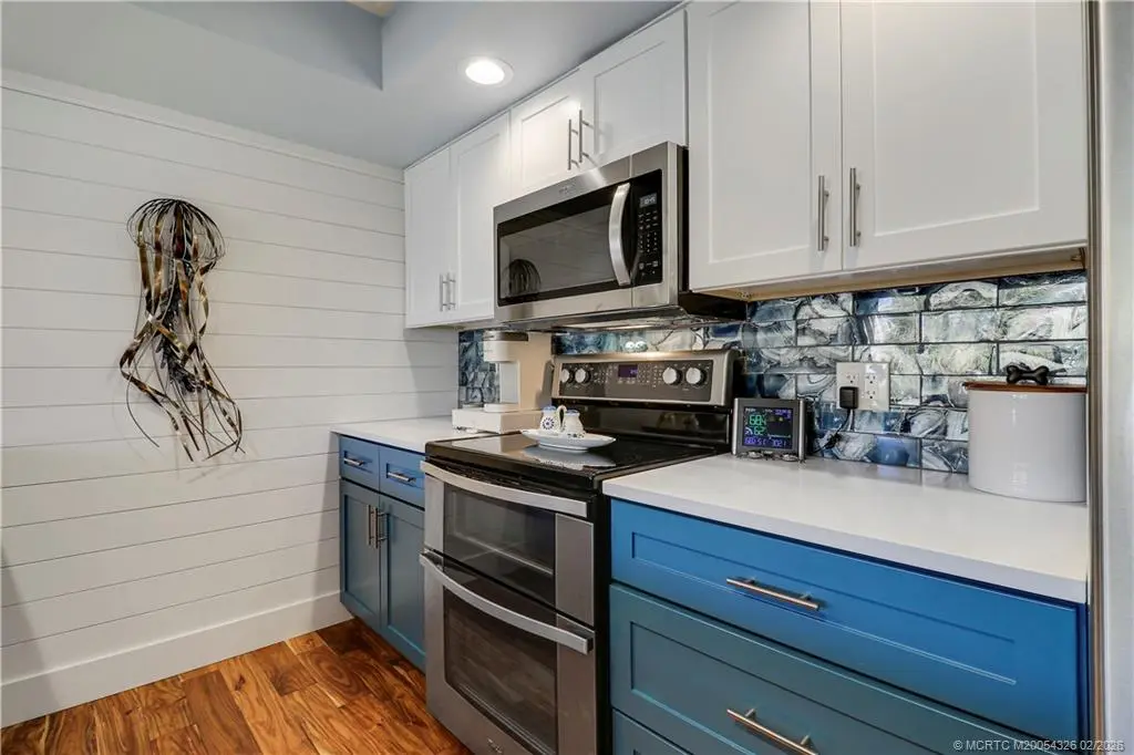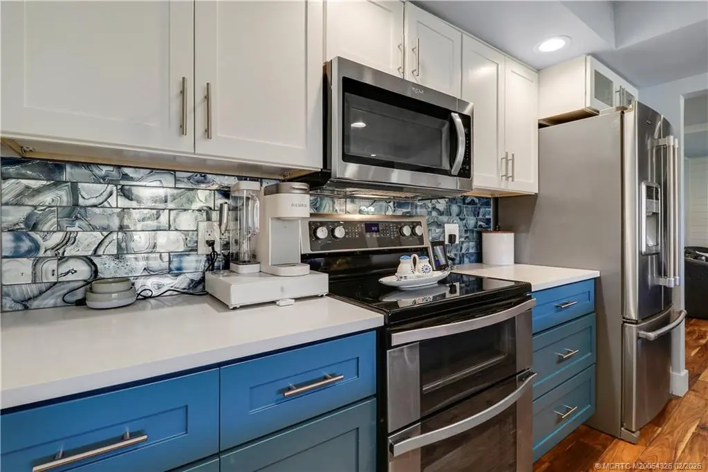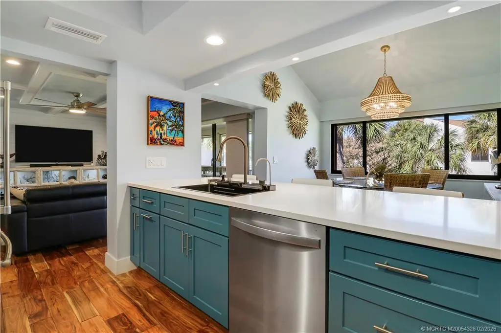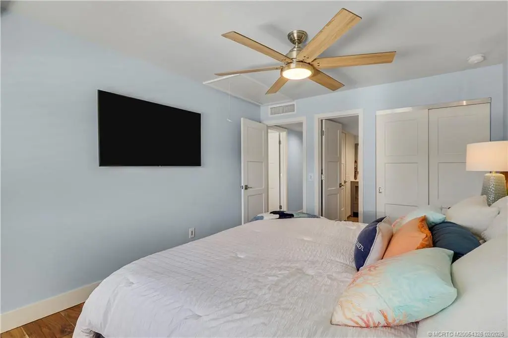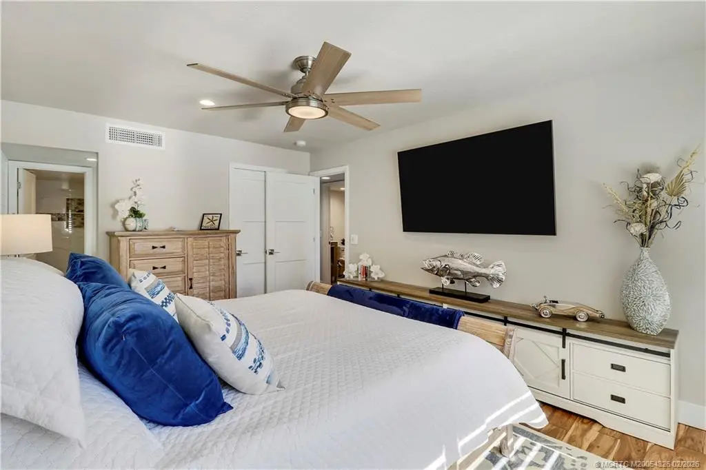 Experience refined Florida waterfront living in this GORGEOUS, fully renovated River Club residence featuring quality 2024 upgrades and an exceptional location just steps from the marina and scenic St. Lucie Riverfront. Larger than most River Club condos at approximately 1,220 sq ft, this home features vaulted ceilings, expansive windows, and rich authentic hardwood flooring throughout -a rare upgrade in this community. The screened balcony offers a serene garden setting, creating a private outdoor retreat. The updated kitchen features granite countertops, stainless steel appliances, double oven, oversized deep sink, and bar seating. The primary suite features a custom glass walk-in shower, dual sink vanities, and updated fixtures. Additional features include in-unit Maytag washer and dryer and quality interior finishes throughout. River Club offers riverfront walkway access, marina, and dockage along the scenic St. Lucie River. Boat slips may be available for purchase.