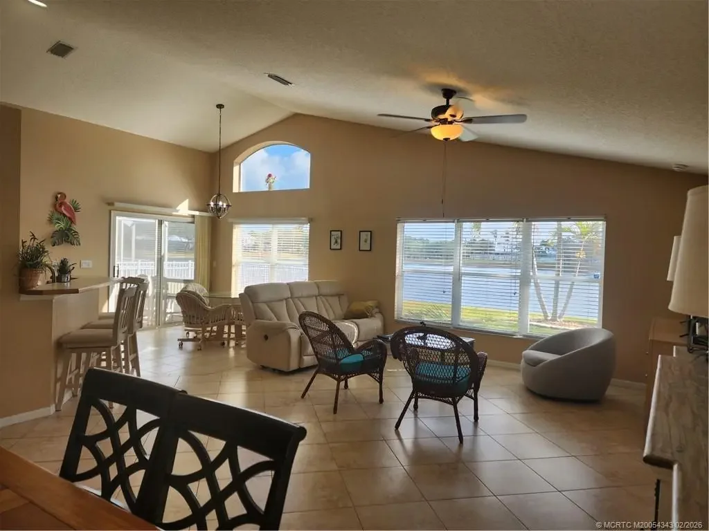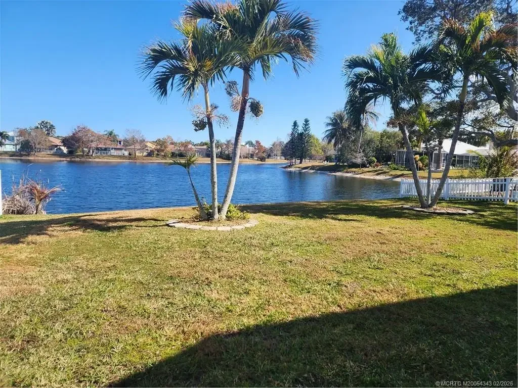Stunning Lakefront Living in Jensen Beach-Enjoy breathtaking full lake views from this beautifully maintained concrete block home offering 1,814 sq. ft. under air. Designed with a true split-bedroom floor plan, all three bedrooms feature spacious walk-in closets. The bright, open great room boasts soaring ceilings, expansive windows & abundant natural light with serene water views from nearly every room. Elegant tile flooring enhances the clean, modern feel. The versatile third bedroom with double doors is ideal as a home office or den. The spacious kitchen features stainless steel appliances, breakfast bar, and an eat-in area overlooking the lake. Relax in the generous primary suite with dual sinks, Roman tub, large walk-in shower & cabana bath access. Enjoy the covered, screened porch with room for a pool or patio. Roof 2020, A/C 2018, low HOA fees, 2-car garage. Minutes to shopping, dining & beaches.