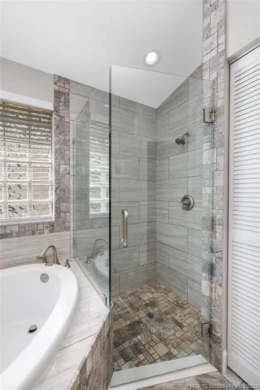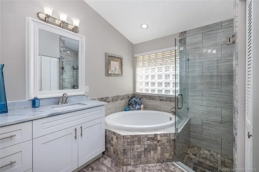 Bathtub, Cathedral Ceiling(s), Dual Sinks, Fireplace, Garden Tub/Roman Tub, Kitchen Island, Kitchen/Dining Combo, Primary Downstairs, Living/Dining Room, Split Bedrooms, Separate Shower, Walk-In Closet(s)