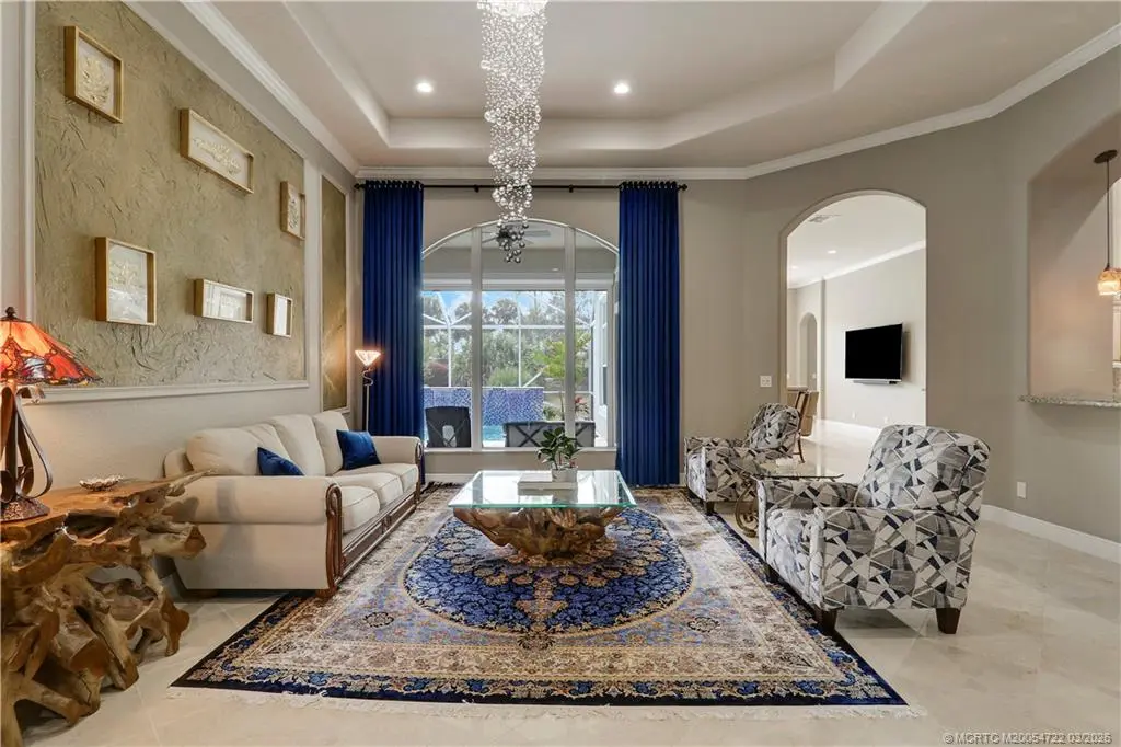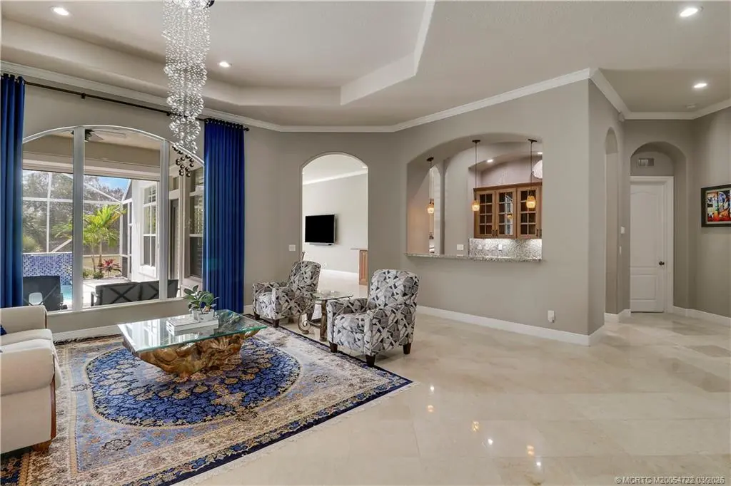 Elegance abounds in this former model home! Presenting this 4BR 3BA 3-car garage residence featuring formal LR, DR, FR, and den/5th BR. Fabulous floor plan w/ large open rooms, including a grand living room w/ wet bar. Chef's dream kitchen w/ custom cabinets, granite countertops, soft-close drawers, a breakfast bar, a farmhouse sink, and high-end SS appliances. Magnificent MBR suite w/ two walk-in custom closets. Brand new remodeled spa-like MBA with huge walk-in shower, double sinks & vanities, and luxurious soaking tub. Enjoy outdoor entertaining on your spacious screened-in patio w/ in ground salt water pool and outdoor kitchen. Designer upgrades & features include: Impact glass, 12-foot ceilings, custom window treatments, marble and wood flooring, plantation shutters, remote screens, and epoxy garage floor. Perfectly located on a private cul-de-sac and a short drive or bike ride to clubhouse, pool, and amenities! Ideal location close to A+ rated schools, dining, shopping, and I-95.