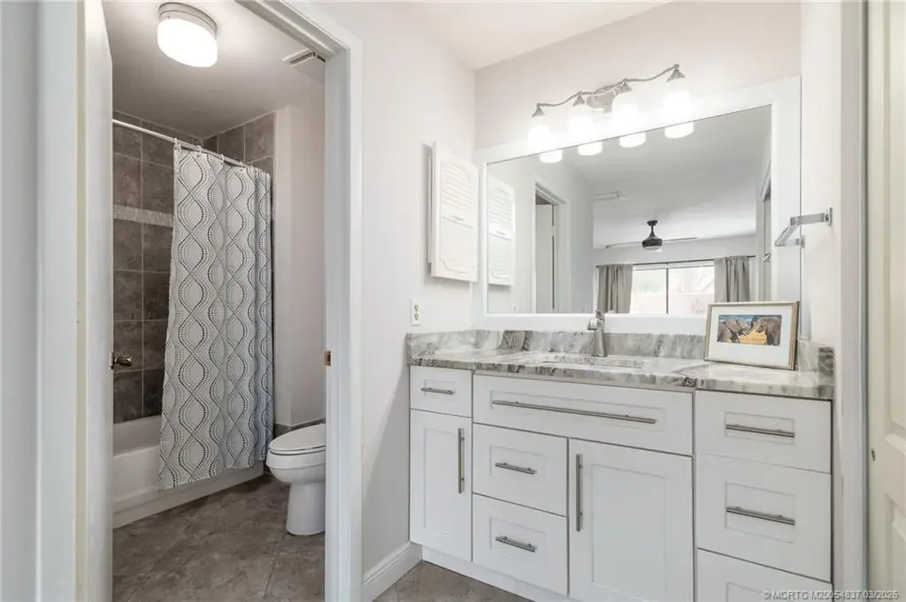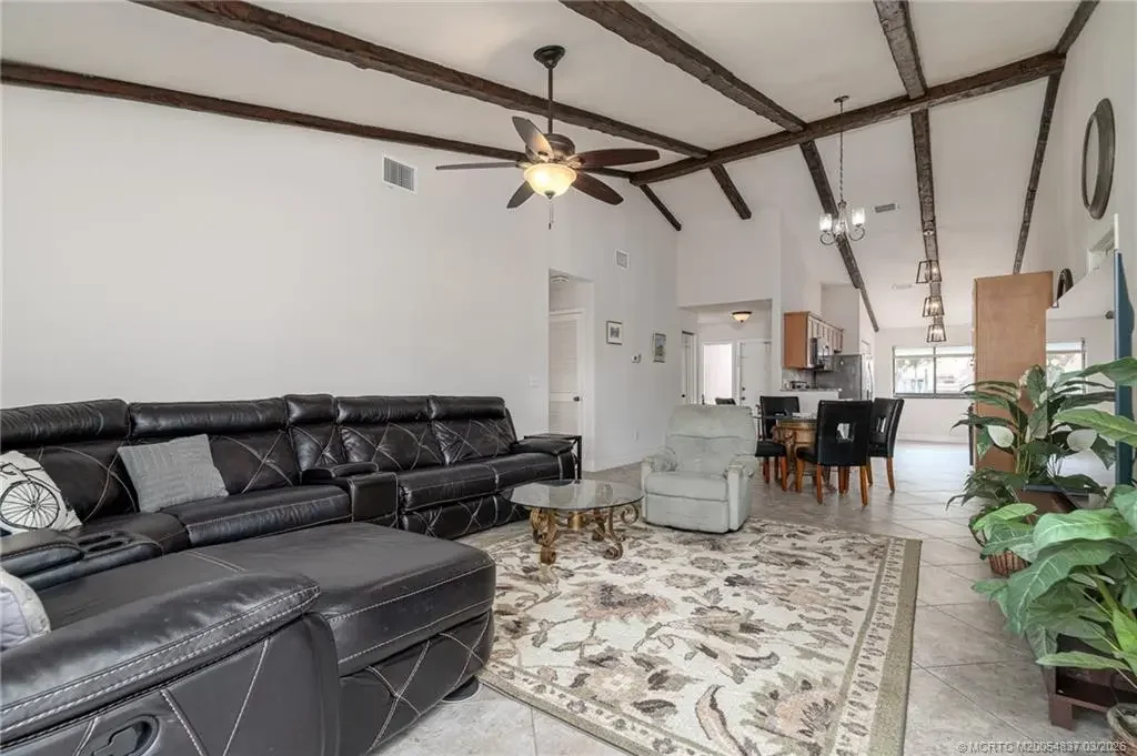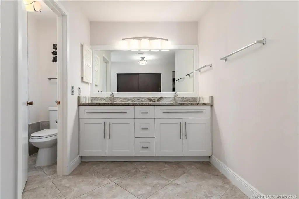 Rarely available furnished 3BR/3BA villa in the gated Villas of Sandpiper Bay, beautifully updated and tiled throughout. This first-floor villa features 1,722 sq ft of living space with an updated kitchen and bathrooms. The well-appointed guest suite includes its own en suite bathroom, ideal for guests or multigenerational living. Relax on the screened patio steps from the community pool and spa, or enjoy sunsets from the community gazebo on the North Fork of the St Lucie River. Close to shopping, dining, and beaches!