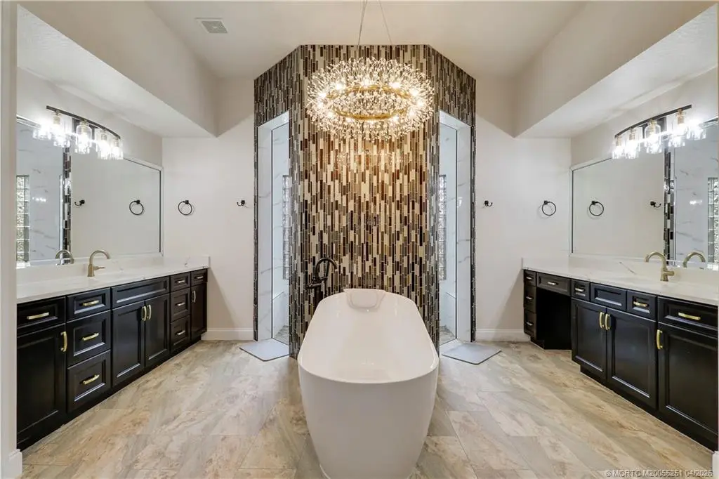 Elegance abounds in this former model home! Presenting this 4BR 3BA 3-car garage residence featuring formal LR, DR, FR, and den/5th BR. Fabulous floor plan w/ large open rooms, including a grand living room w/ wet bar. Chef's dream kitchen w/ custom cabinets, granite countertops, soft-close drawers, a breakfast bar, a farmhouse sink, and high-end SS appliances. Magnificent MBR suite w/ two walk-in custom closets. Brand new remodeled spa-like MBA with huge walk-in shower, double sinks & vanities, and luxurious soaking tub. Enjoy outdoor entertaining on your spacious screened-in patio w/ in ground salt water pool and outdoor kitchen. Designer upgrades & features include: Impact glass, 12-foot ceilings, custom window treatments, marble and wood flooring, plantation shutters, remote screens, and epoxy garage floor. Perfectly located on a private cul-de-sac and a short drive or bike ride to clubhouse, pool, and amenities! Ideal location close to A+ rated schools, dining, shopping, and I-95.