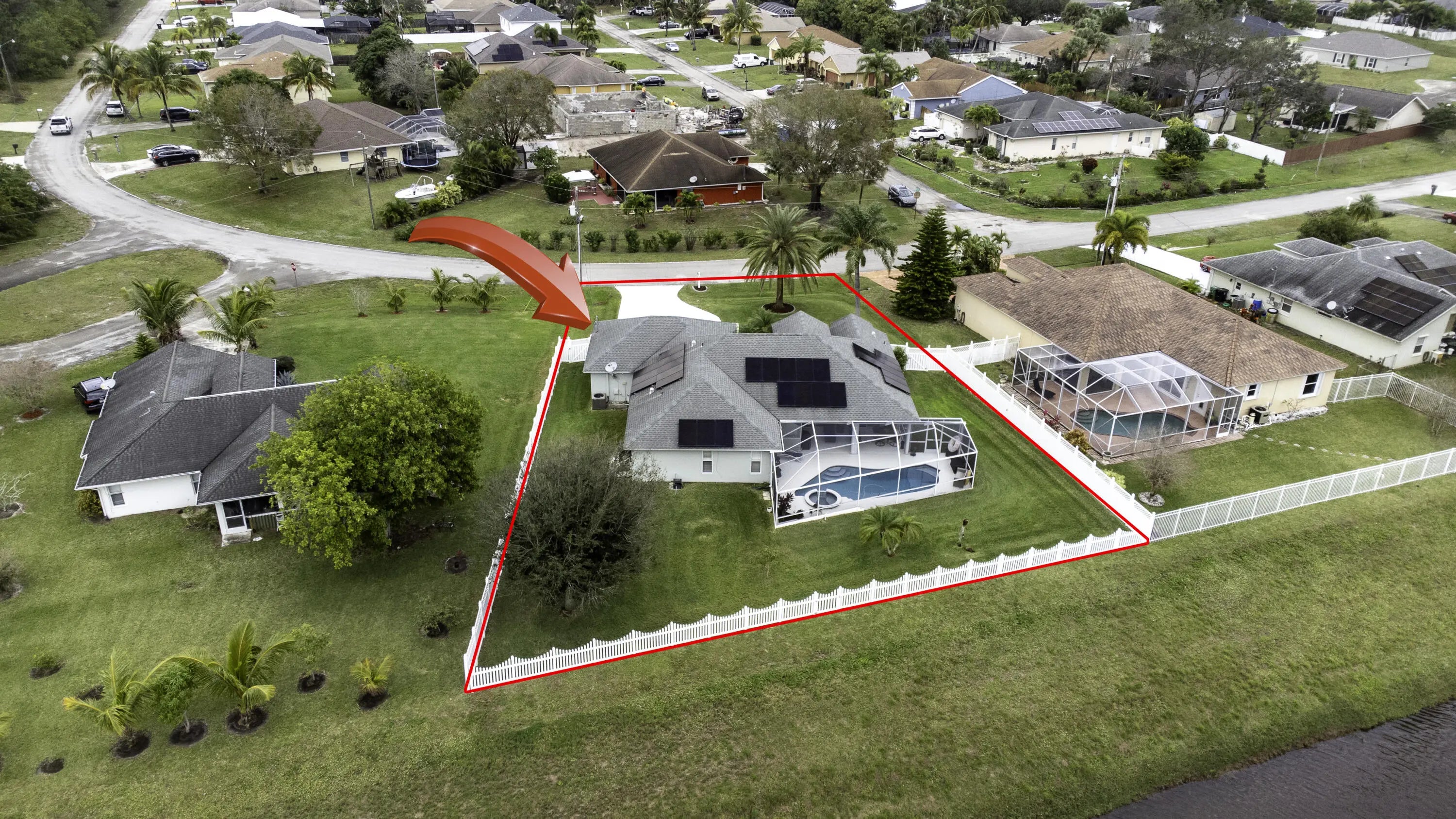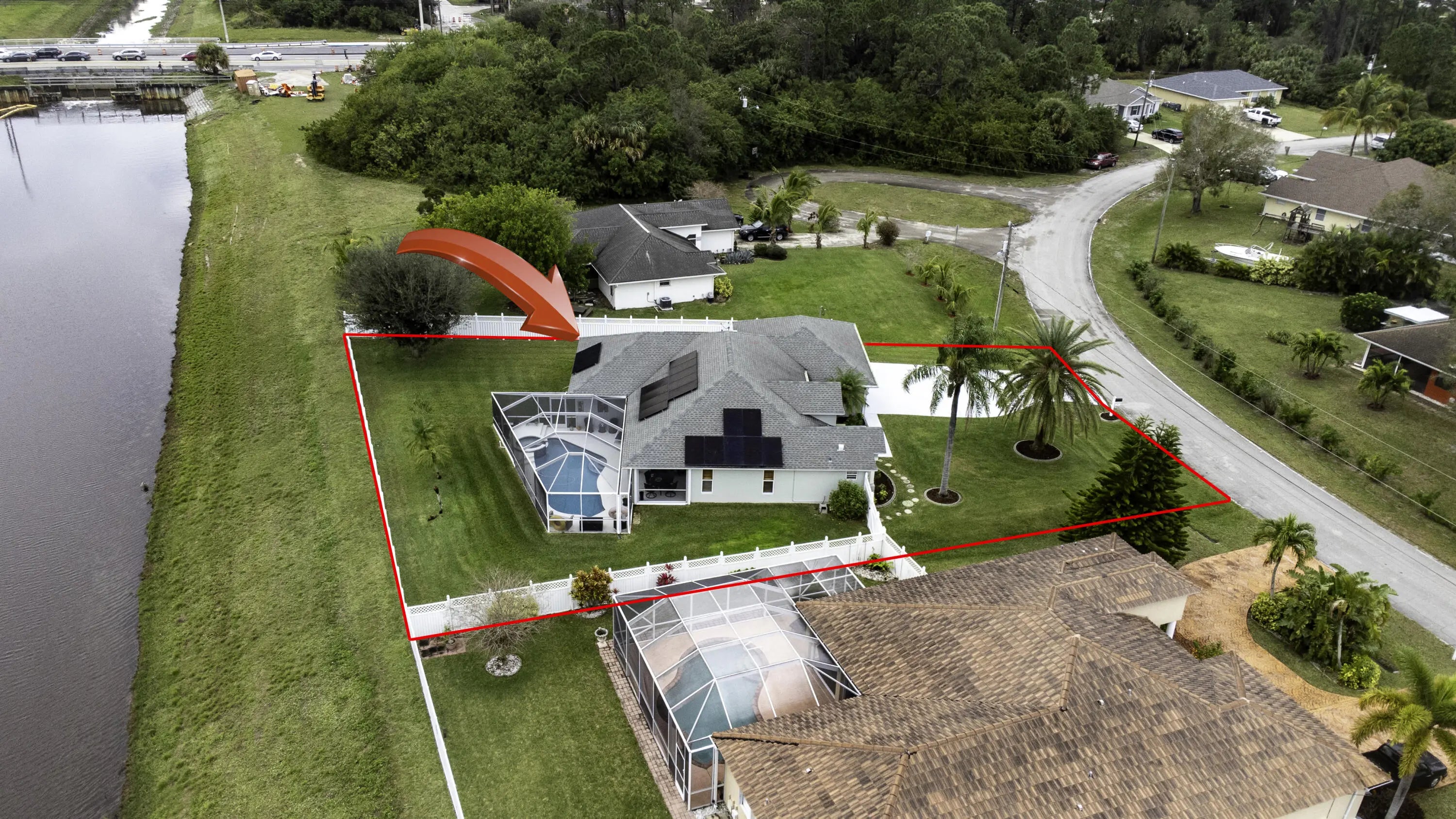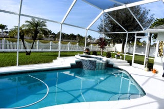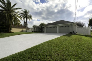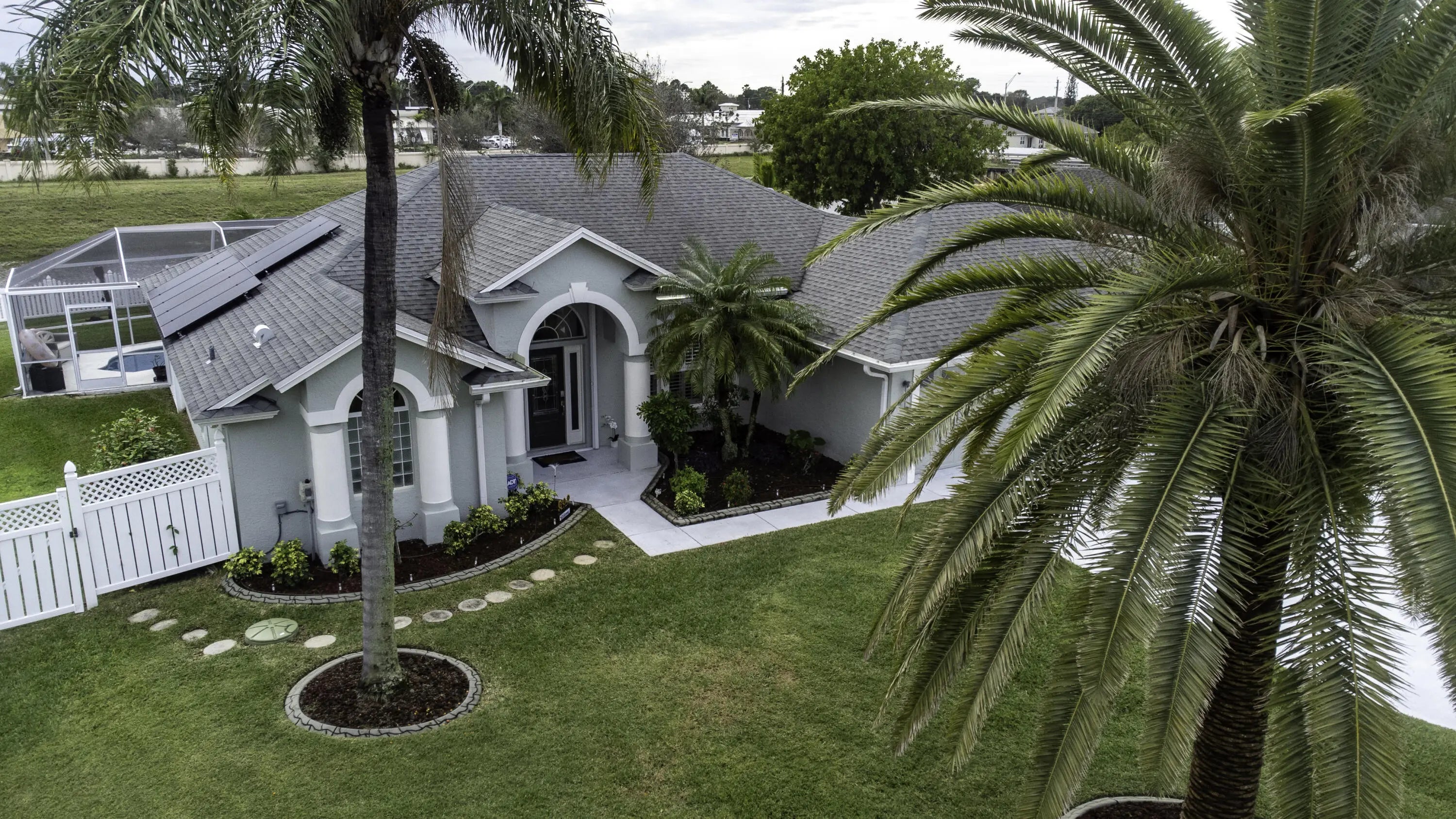 Beautiful energy-efficient Tropical Builder Home! This home offers many features and updates, making it the perfect blend of comfort, style, and convenience. Owner replaced entry door 2020. 2019 roof with the added bonus of solar panels, ensuring you save electricity monthly. A/C 2021. Water Heater 2021, Electric car charging station in garage, New pool pump & heater, pool was resurfaced in 2022. extended driveway providing ample parking space for guests. Wood plantation shutters inside the home. Accordion shutters for porch and front entry door, and hurricane panels for exterior windows. Tray ceiling in Family and master, new exterior paint. The kitchen is beautifully done w/ granite counters. Newer SS appliances. Guest bath renovated. Big Porch area overlooking the jacuzzi screened pool with view of water canal on the back. New tile around pool. Vinyl Fenced yard, Gutters. Sprinkler for lawn irrigation. Water treatment Softener-Owned. Beautiful Landscaping. A Short drive away from I95, Turnpike, Multiple grocery stores (Sam's Club, Aldi's, Publix), Walmart Supercenter, and Tradition where you will find Multiple Restaurants and so much more for you and your family. **A Must See**
