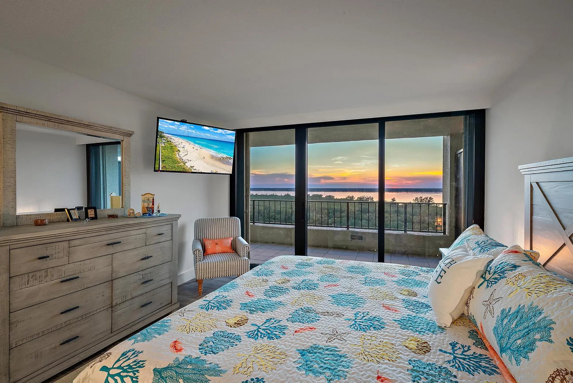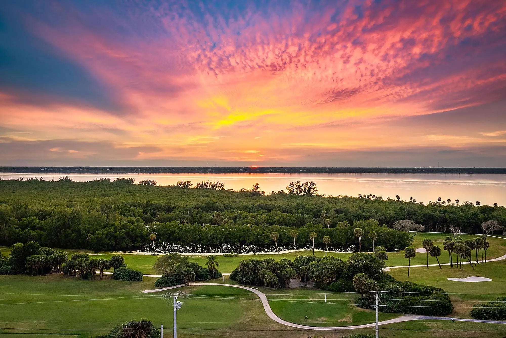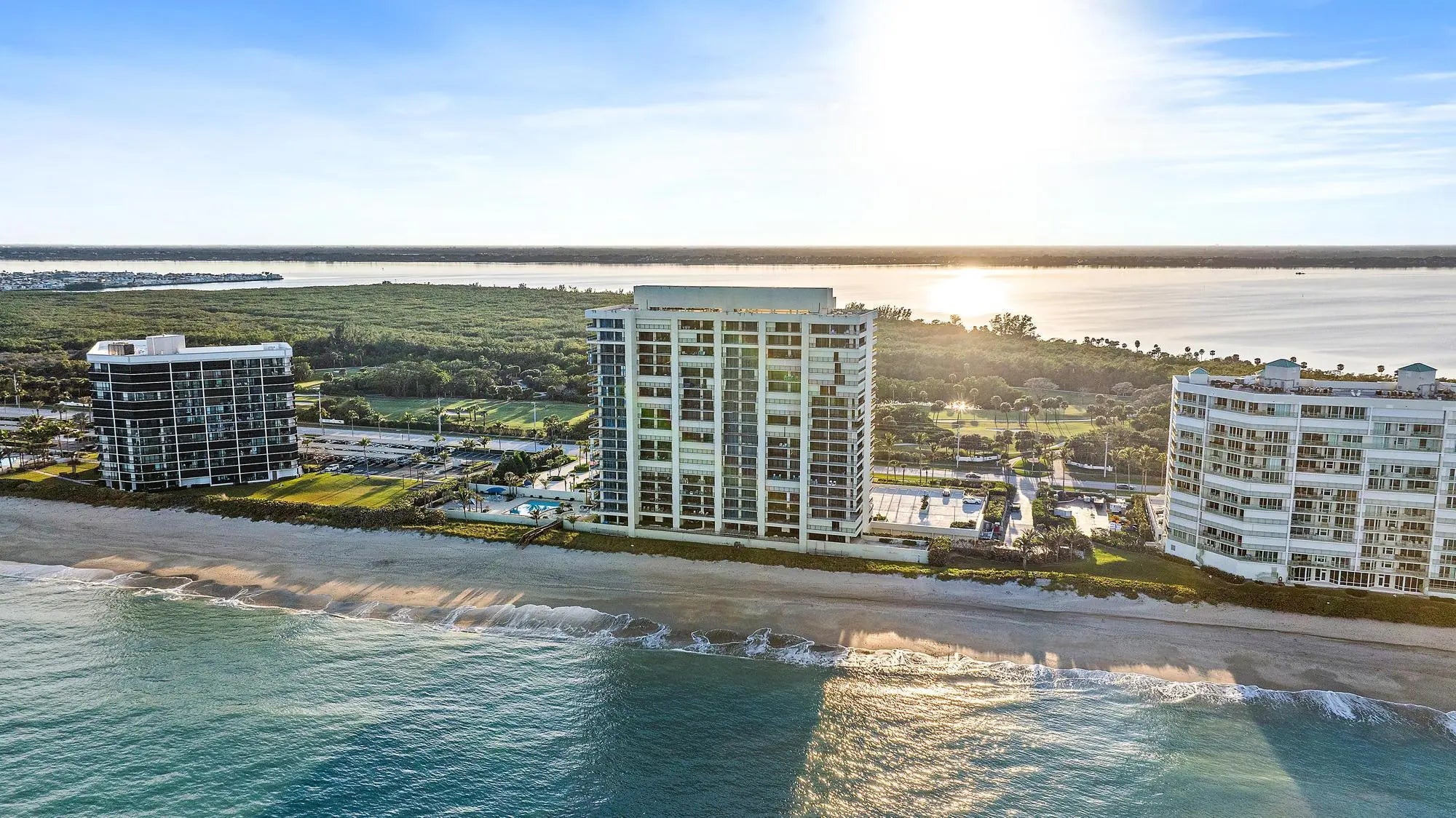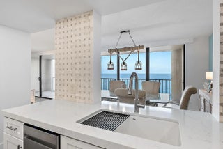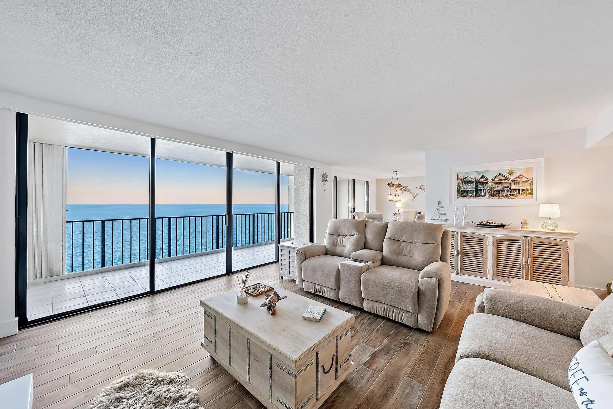 Experience luxury coastal living in this fully renovated 14th-floor oceanfront condo at The Admiral. A stunning entrance foyer welcomes you into a beautifully designed space featuring elegant shiplap finishes, a built-in entertainment center with an electric fireplace complete with color-changing flames and glass, new appliances, and brand-new driftwood tile throughout. Motorized privacy shades add comfort and convenience. Enjoy breathtaking ocean views from the main balcony, while the two bedrooms offer stunning sunsets over the Indian River Lagoon and golf course from a second balcony. This unit also boasts two storage closets—while most have just one. One under-building garage parking and internal elevators provide added ease, and membership to the Island Dunes Country Club is included granting access to golf, tennis, and more. Boat slips are currently available for purchase at the marina and the furniture inside the unit is for sale.