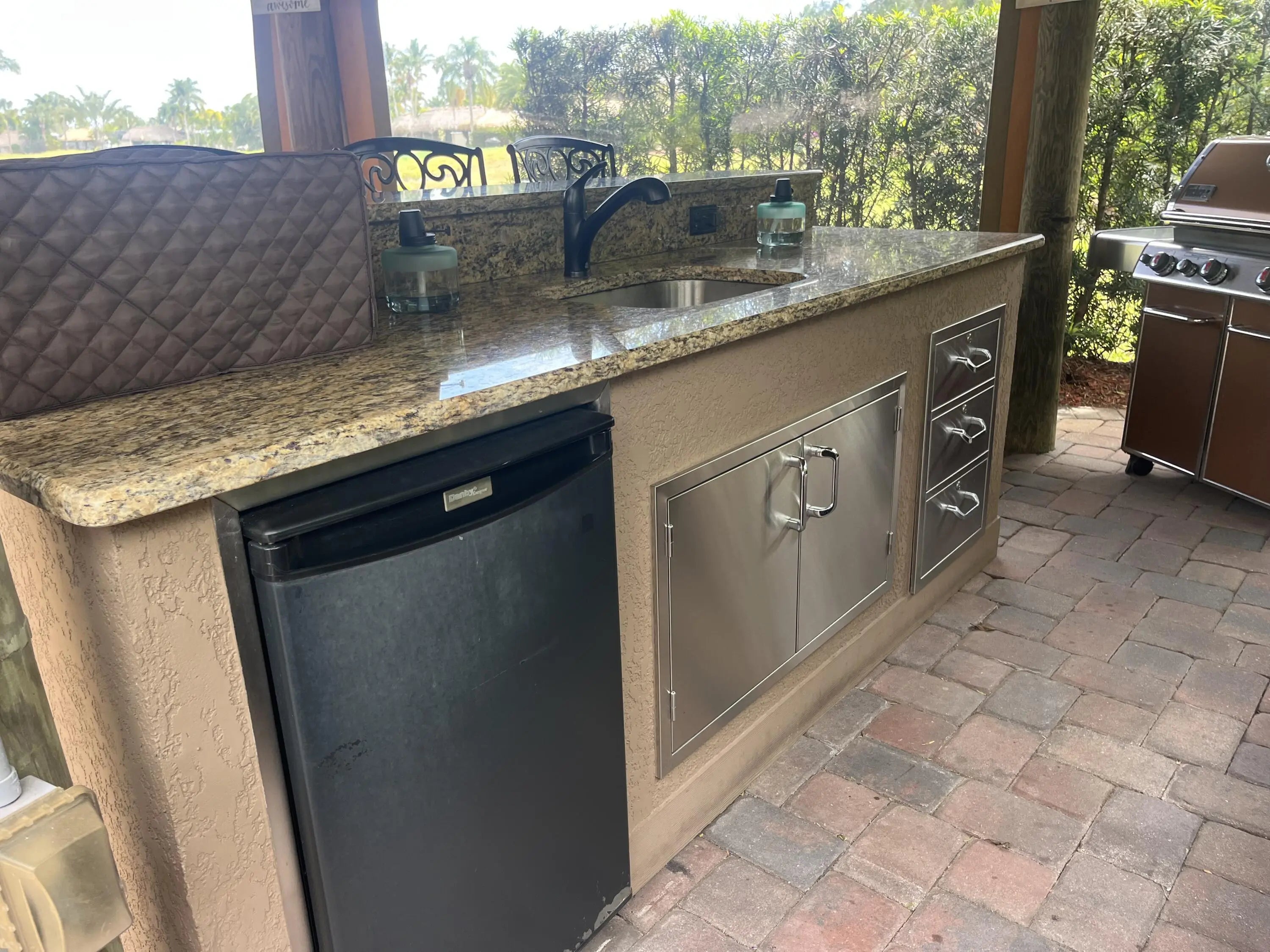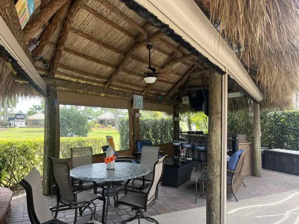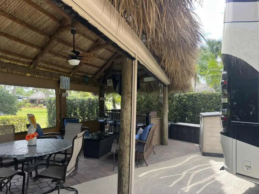 Beautiful 5 star resort in Motor Coach Resort . Enjoy this wonderful lot that is on the golf course with beautiful sunsets. Granite top kitchen with bar area to enjoy outdoor entertainment. Weber grill , stainless steel cabinets for storage ,stainless steel refrigerator with sink.Newly thatched large tiki. Very active resort. The resort has everything that you would want close to shopping , dining and beaches. Mature landscaping , private location. Electric remote controlled roller shades. Resort has 4 pools and hot tubs, pickle ball several courts, golf par 3 golf course, shuffleboard, bocce ball , darts, gym, yoga, water aerobics, tennis, clubhouse ,bike club.Happy hour Fridays 5-7. Eisenglass curtains protecting from rain and wind