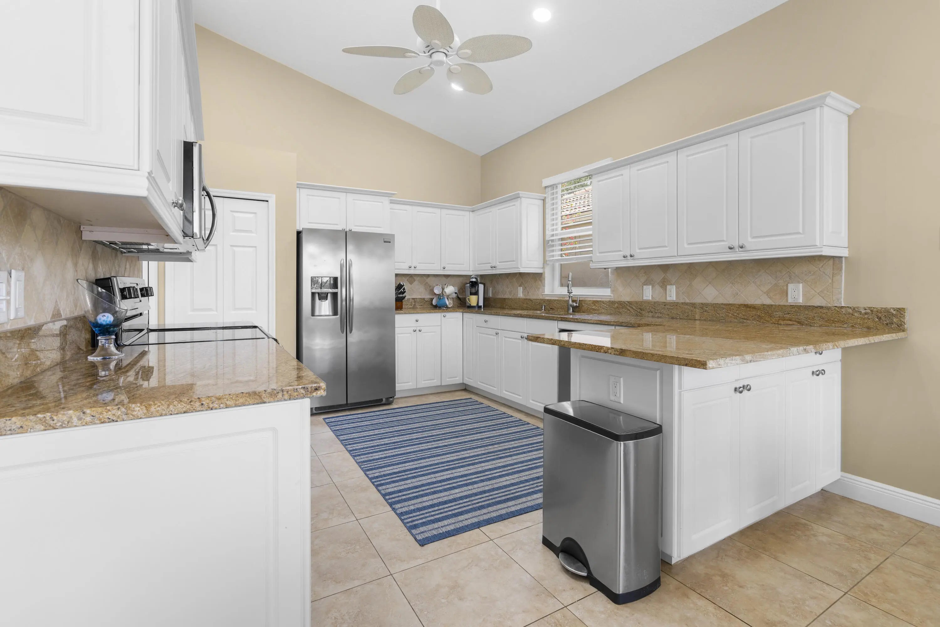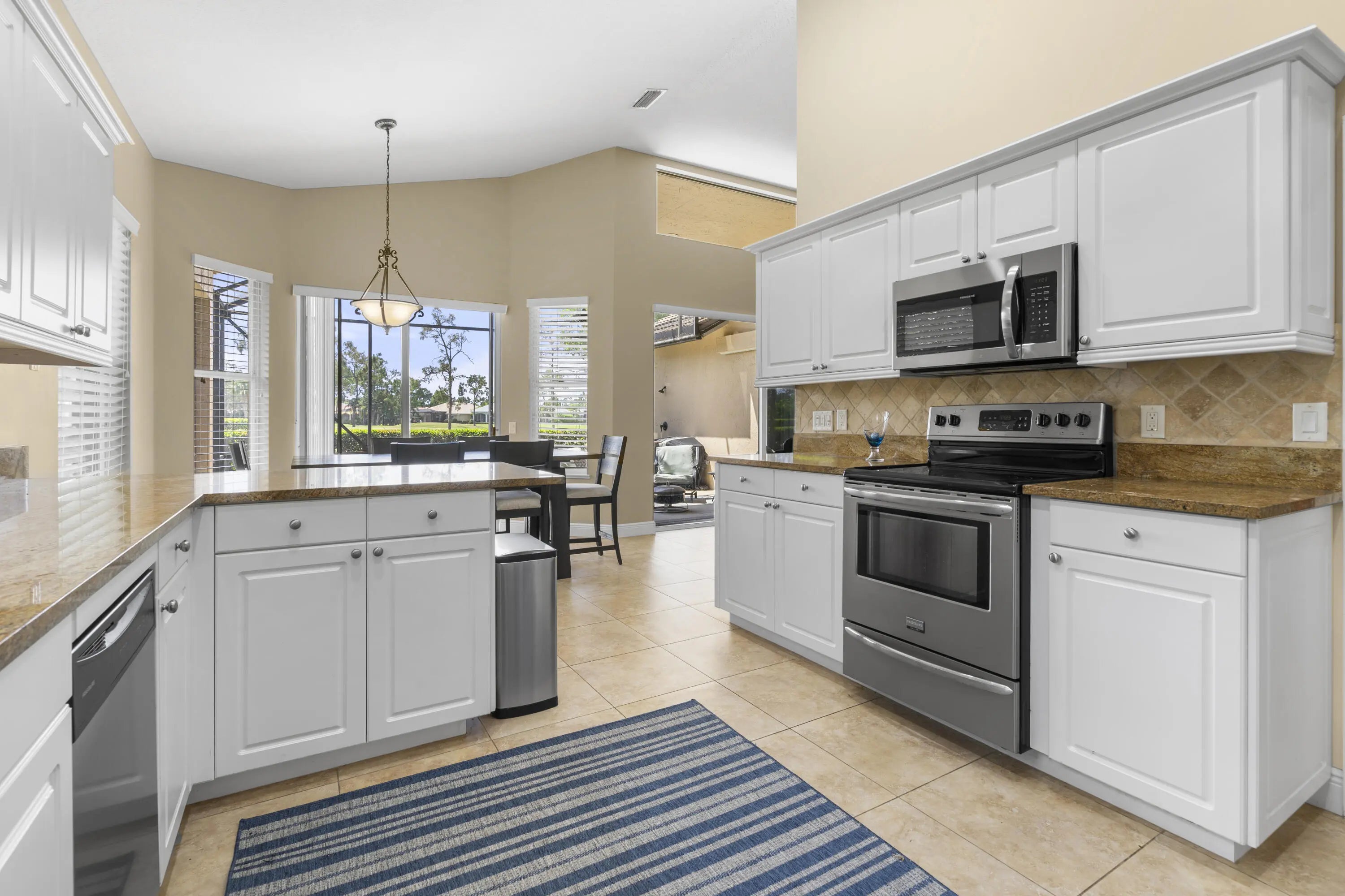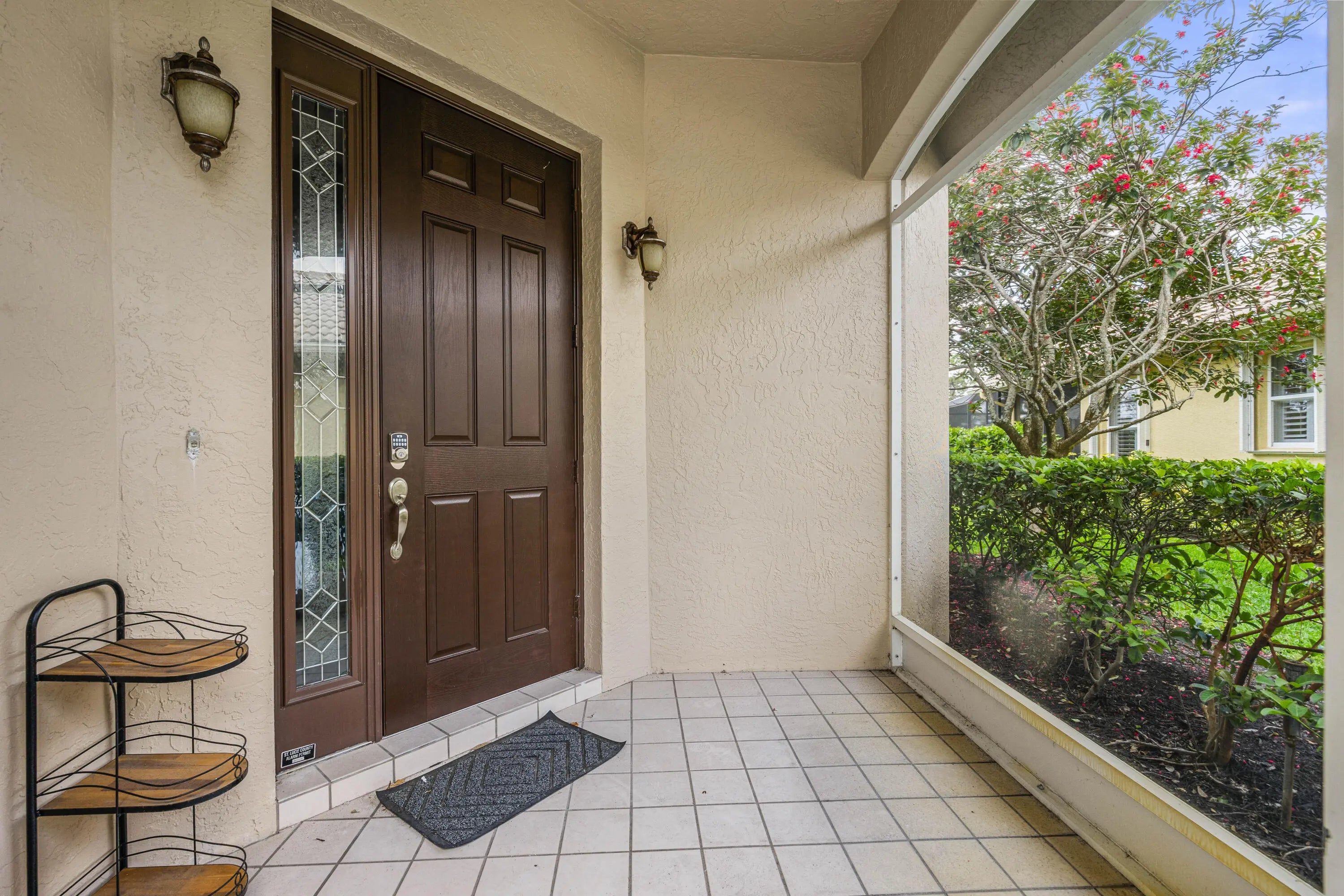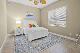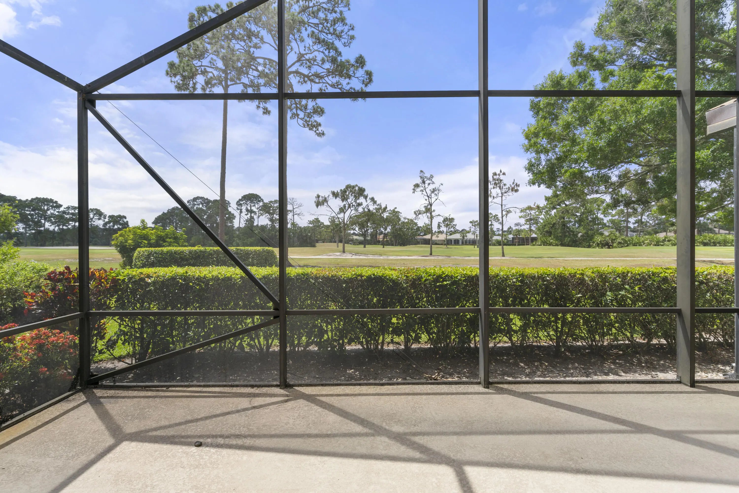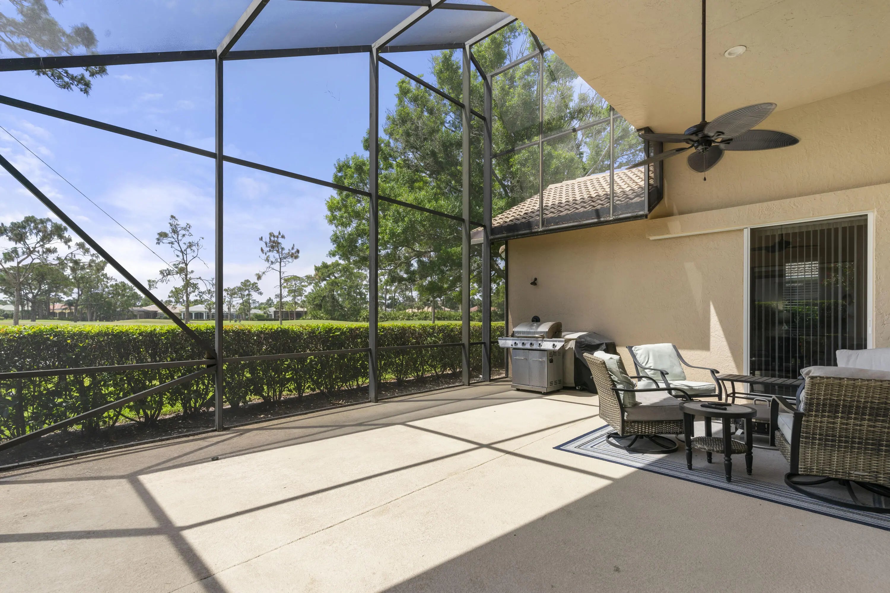 MOVE RIGHT IN! BRAND NEW TILE ROOF!! Spacious 3BR+Den/2BA/2+CG home with GOLF VIEWS and oversized screened patio! This expanded 'Sawgrass' floor plan features many wonderful upgrades including tile flooring t/o, high vaulted ceilings, oversized garage with hobby room, screened front entry, new WH, neutral interior paint, updated lighting & fans, updated bathrooms and more. The kitchen has white cabinetry, granite counters, SS appliances, a dining area and access out to the screened patio. Master bedroom with golf views, access to the patio, dual closets with custom organizers and a serene ensuite with dual vanities, frameless glass shower, soaker tub and water closet. Two additional bedrooms share a hall bathroom and the den could be used as a home office or additional bedroom. The laundry room has storage closets, cabinetry and a utility sink. The oversized garage has a hobby/storage room that could be used as a workshop or just for additional storage. Lounge, dine and relax on the large, screened patio while watching the golfers go by. No direct rear neighbors allow for open golf views. Just a short cart ride from the Legacy Golf & Tennis Club and the PGA Golf Club, both with optional memberships (no mandatory fees!). HOA dues include basic cable, internet, common area maintenance, guarded security and access to the community clubhouse (The Island Club). PGA Village is an amenity rich community with COUNTY ONLY TAXES surrounded by multiple golf courses where membership is optional. Activities at the Island Club include pickleball, tennis, exercise rooms, a resort style pool, billiards, playground, library, card rooms, clubs, ballroom and more. A short drive to Stuart, Jensen Beach, Vero beach, airports, shopping, dining, Mets spring training facility, beaches and more. WONDERFUL OPPORTUNITY TO OWN A HOME WITH A NEW ROOF! Call today to view!
