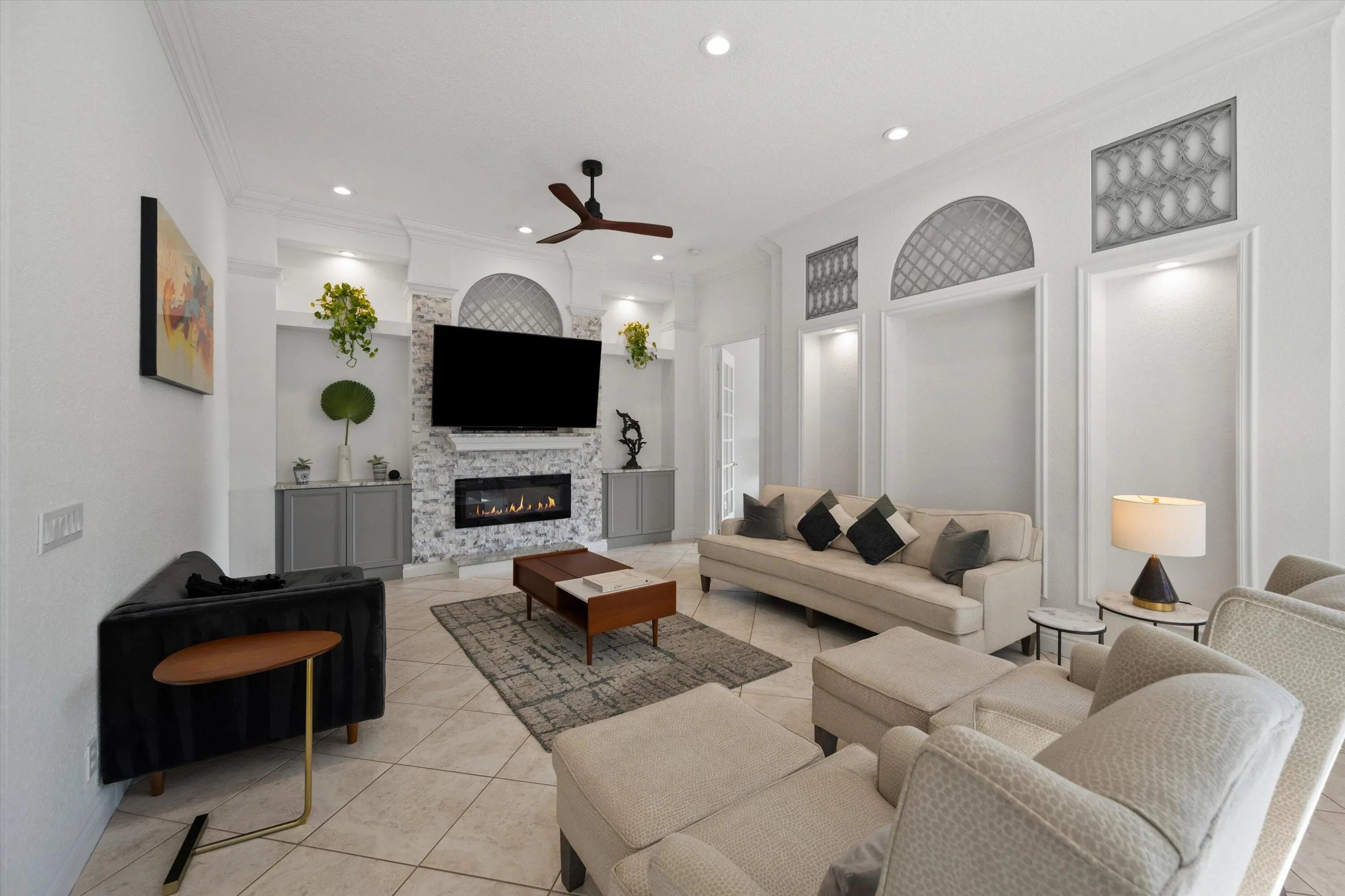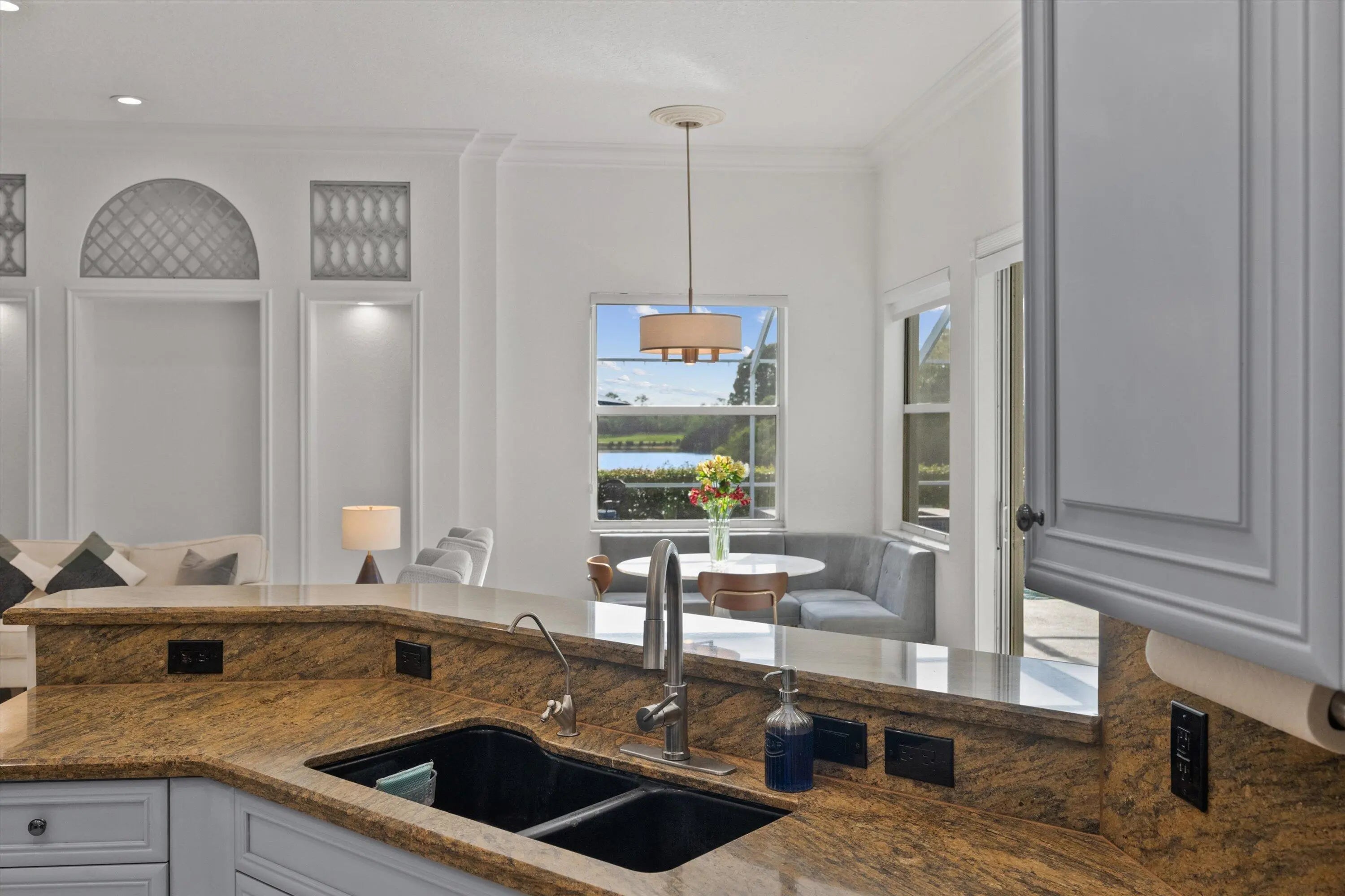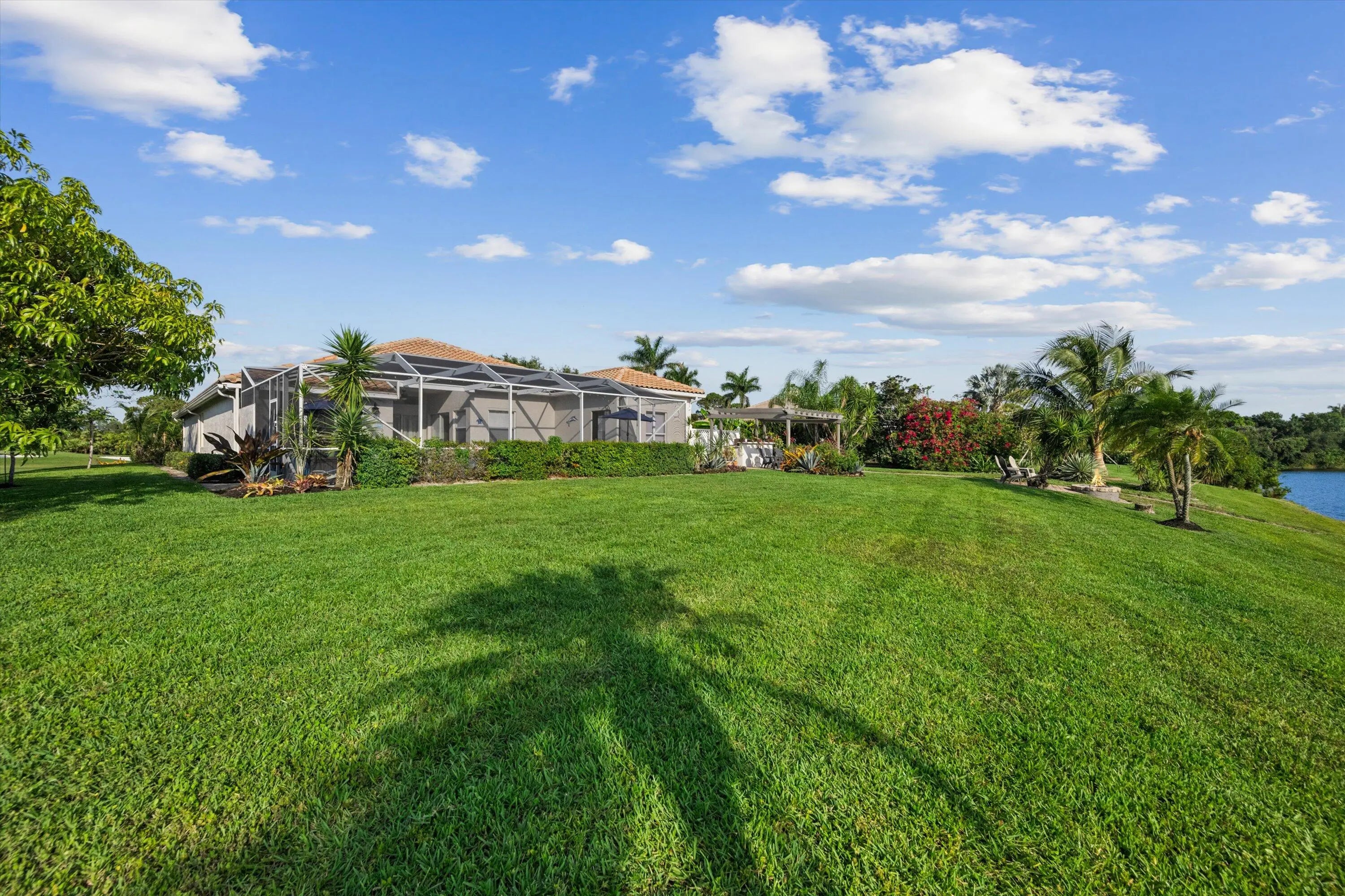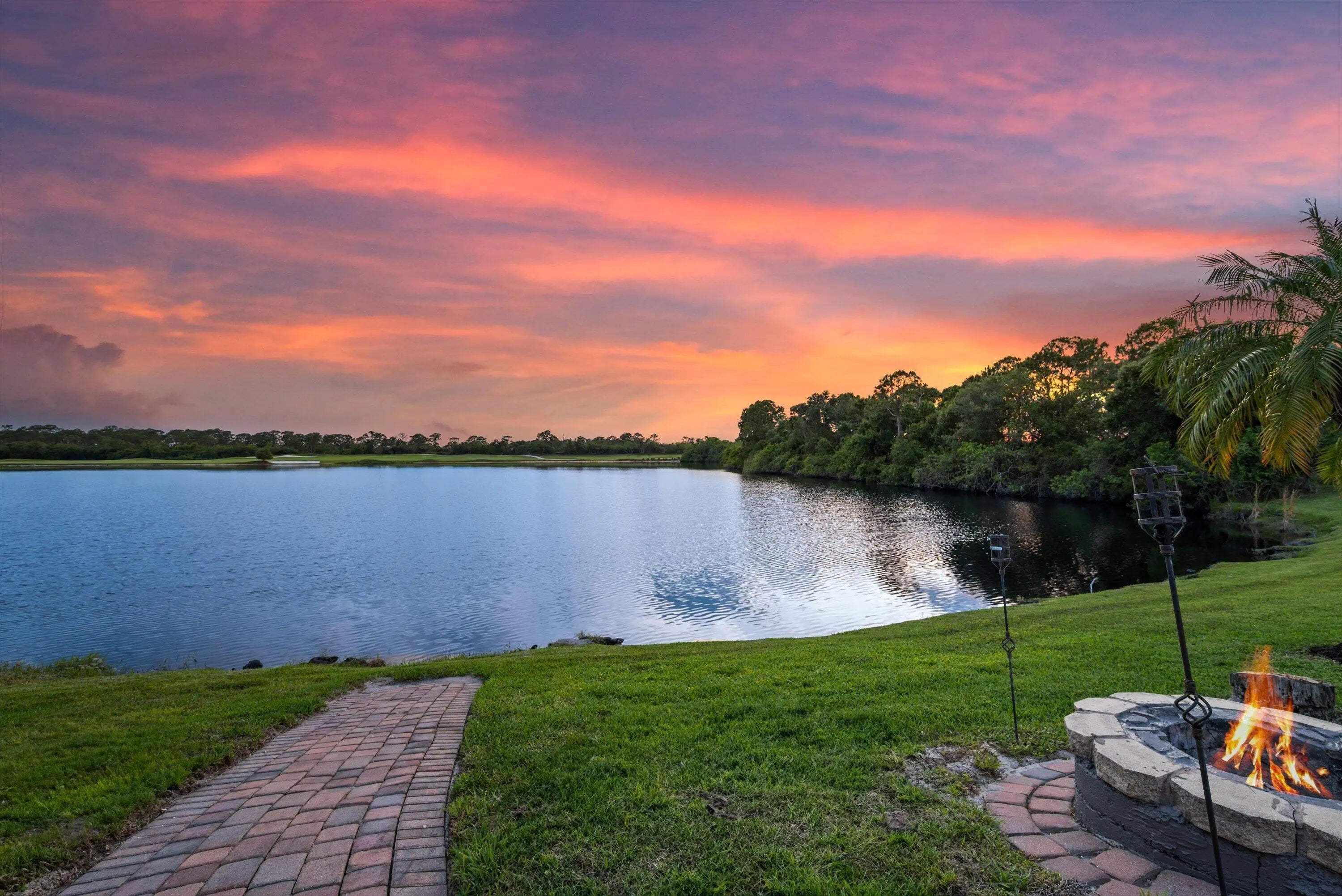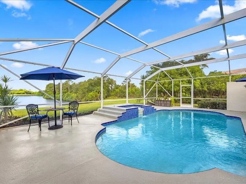 Price improvement- Elegant lakefront estate on a quiet cul-de-sac overlooking a private 20-acre lake with gorgeous sunset views. Situated on .68 acres, this 4BR (possible 5), 3BA home offers two primary suites, office/den, and spacious living areas. Resort-style lanai features pool, spa, pergola with built-in grill, and firepit. Enjoy deer roaming and fishing from your own backyard. Upgrades include two new A/C units, new well, newer appliances, granite kitchen with reverse osmosis, LED lighting, fresh interior paint, exterior paint (2021), full hurricane protection, circular drive, 3-car garage. 24/7 guard-gated, low HOA. Optional golf. A rated schools close I95, FL Tpke, shopping beaches. Schedule a private tour today.