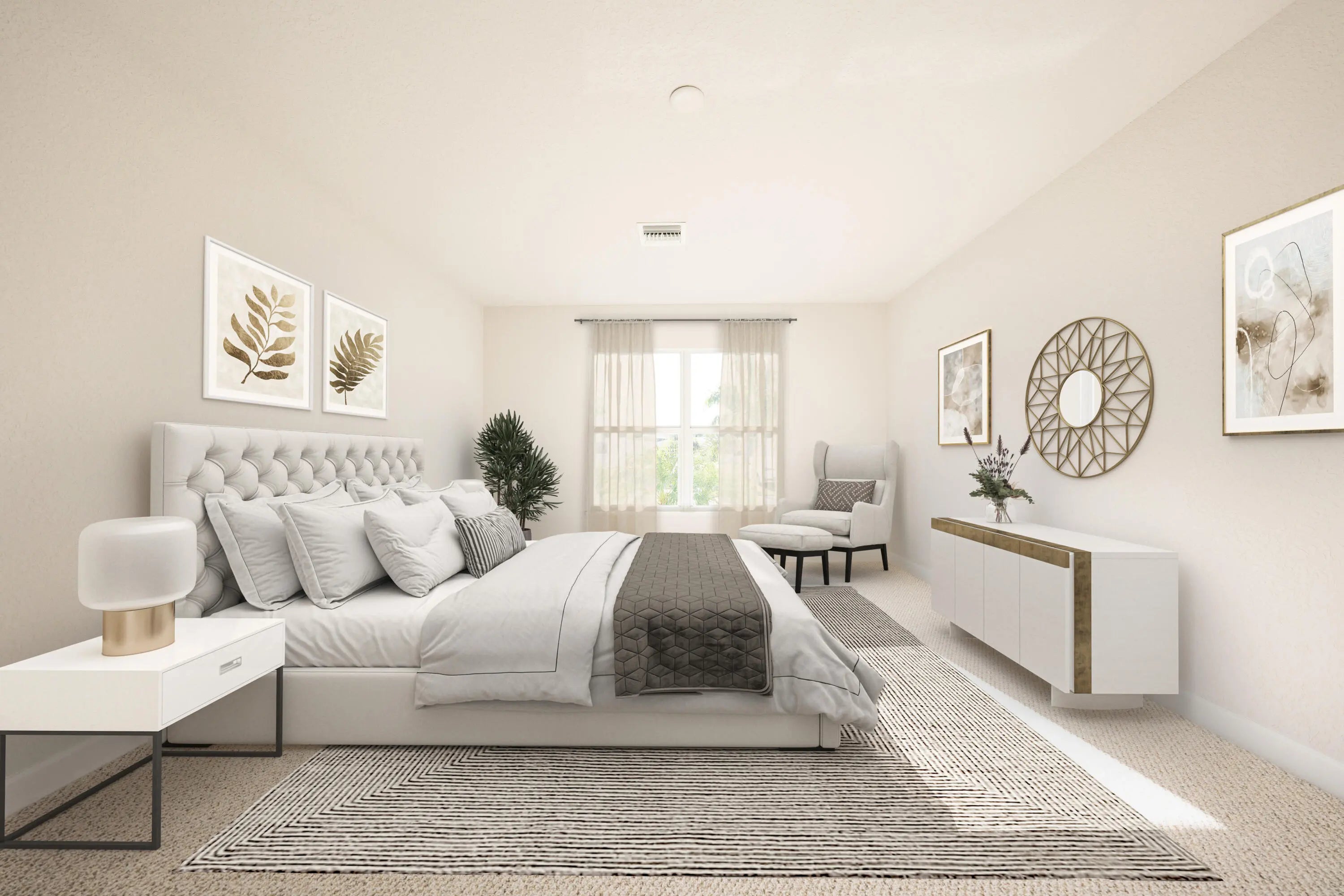This charming Cottage floorplan blends cozy comfort with spacious versatility, featuring a large open concept layout, 1 bedroom plus a bedroom sized den, and 1.5 baths, thoughtfully designed with hurricane-impact windows, metal roofing, and luxury finishes throughout. The den makes an ideal guest room, office, or hobby space, with space saving pocket doors and a large window overlooking the back yard. The oversized master bedroom and spacious walk in closet have vaulted ceilings and the ensuite is complete with quartz countertops and tile floor. The kitchen features a matching 1 level quartz peninsula Bar Top with enough length to seat at least 4 and an undermounted sink with a matching quartz backsplash. Located in the heart of Spanish Lakes One- on a beautiful standard lot.