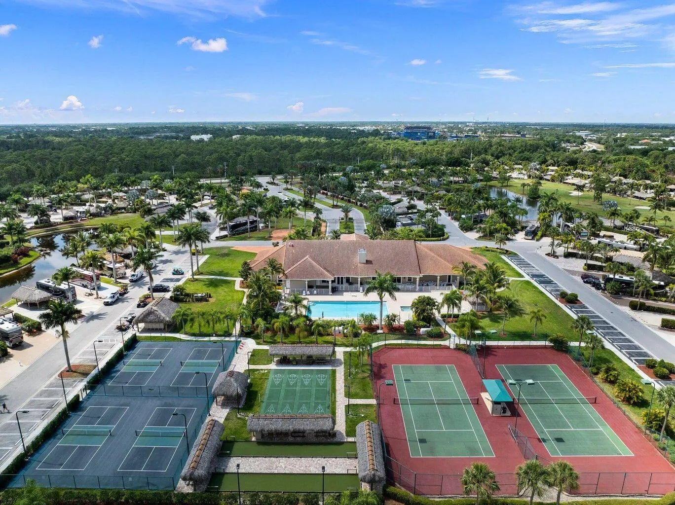 Billiard Room, Clubhouse, Fitness Center, Golf Course, Laundry, Pool, Spa/Hot Tub, Tennis Court(s), Bocce Ball, Community Room, Internet Included, Library, Pickleball Court(s), Street Lights