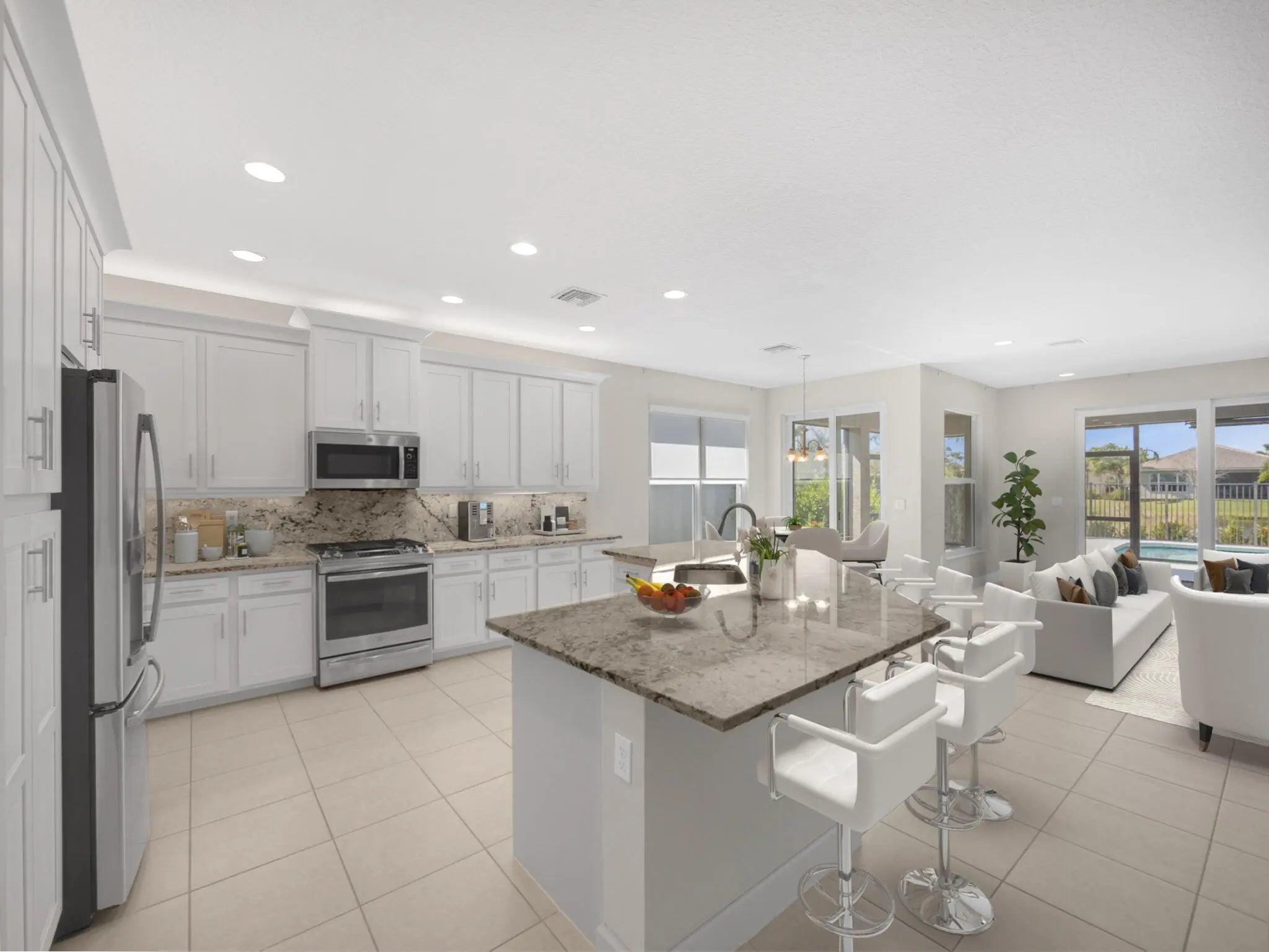 Welcome to this stunning Bimini Model pool home in the highly sought-after 55+ community of Valencia Cay at Riverland. This spacious 3-bedroom plus den, 3-bath residence perfectly combines modern luxury with everyday comfort. Set on a premium lakefront lot, the home offers serene, unobstructed water views and a sense of tranquility that defines Florida living. Step inside to discover a home rich with thoughtful upgrades and designer touches. The chef-inspired kitchen showcases custom cabinetry, high-end appliances, and a stylish open-concept design ideal for cooking, entertaining, or casual dining. The primary suite is a true retreat—featuring upgraded custom closets and a beautifully renovated bathroom with a seamless glass shower and spa-like finishes. The heart of this home is the outdoor oasis. Enjoy year-round relaxation in the heated, salt-chlorinated pool, surrounded by a fully fenced patio for privacy. Roll-down shades offer added comfort, making the space perfect for hosting gatherings or savoring quiet moments by the lake as the sun sets. Additional highlights include impact glass windows for peace of mind, a pool alarm for safety, and under- and over-cabinet lighting that enhances the home's ambiance. The den has been thoughtfully converted into an additional bedroom, adding flexibility for guests or a home office. Every detail of this residence has been carefully curated to offer beauty, comfort, and functionality in one exceptional package. Valencia Cay offers access to the amazing facilities found throughout the 4,000 acres of master-planned amenities at Riverland, where bigger is better! Stay fit at the 16-acre Sports & Racquet Club that offers over 40 outdoor sports courts and a 51,000 square-foot Wellness & Fitness Center. At Riverland you'll also find ways to express yourself at the 5-acre Arts & Culture Center, a bustling Town Center, the 12-acre Paseo Park among many future city parks and much, much more! You'll be able to easily access it all with the 3 miles of gorgeously landscaped traffic-free Paseo and greenways that connects everyone and everything throughout Riverland like never before.