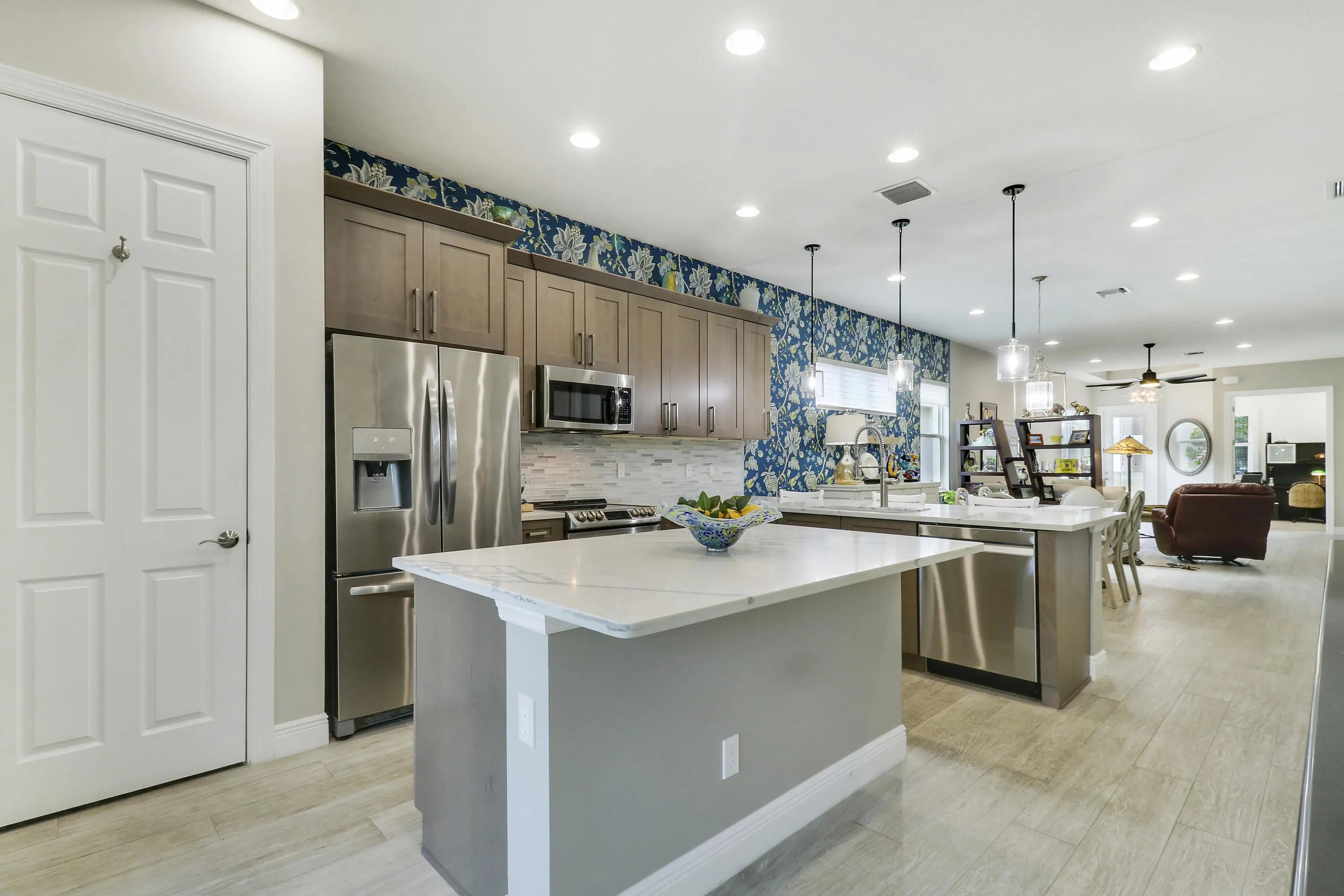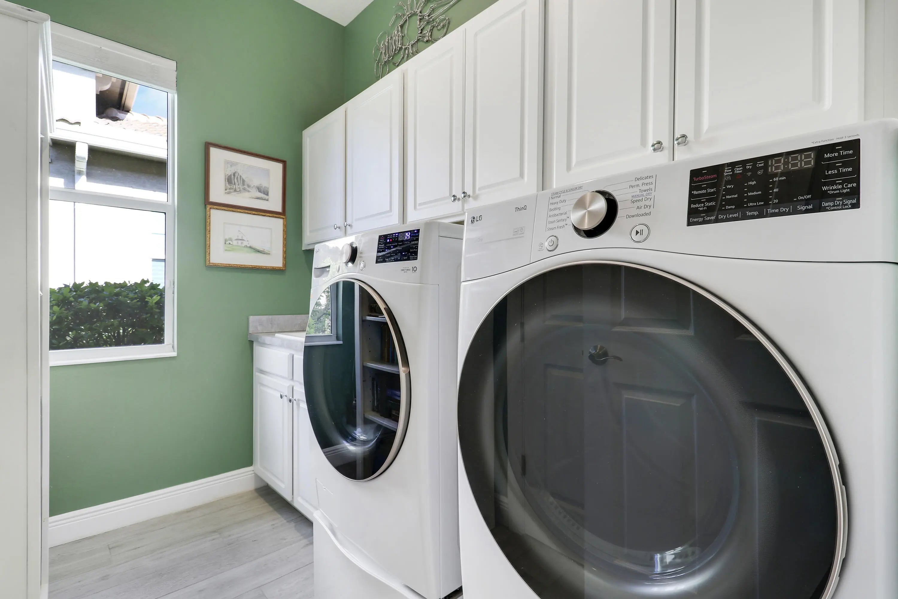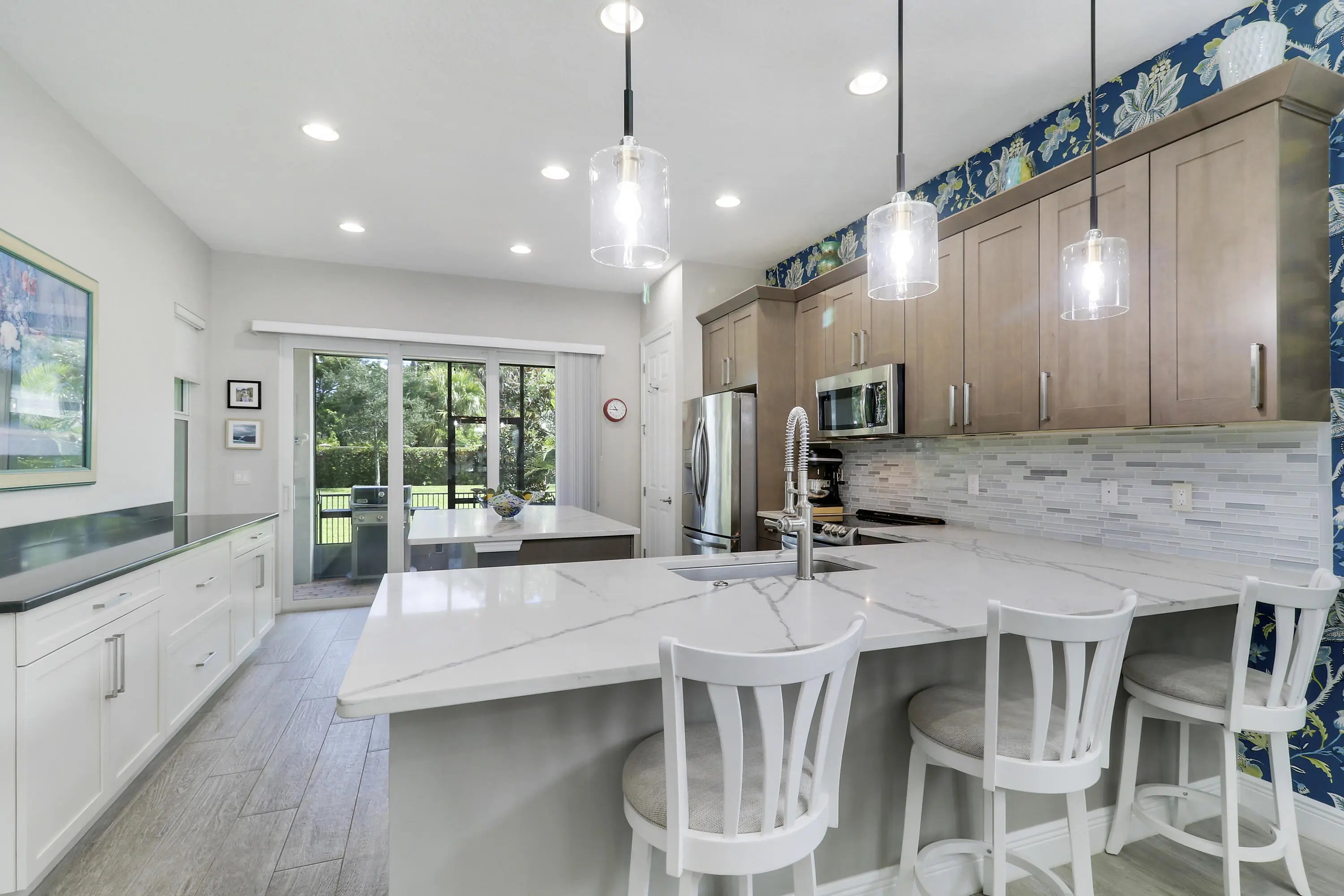 THIS HOME IS BRIMMING WITH CHARM & CHARACTER! Spacious 2BR+Den/2BA/2CG 'Casita' plan with private, fenced back yard. Some of the many special features include decorative glass entry front door, elegant lighting & fans throughout, upgraded window treatments, wallpaper accent, wood flooring in the master bedroom, murphy bed in the guest bedroom, front load washer & dryer, spacious fenced yard, quartz counters throughout, custom organizers in the master closet and more! Wood look tile runs through the main living areas. The spacious kitchen is fit for cooking enthusiasts and features 42'' wood cabinetry, quartz counters, center island, upgraded stainless steel appliances, breakfast bar seating, custom built storage center with drawers, pendant lighting, tiled backsplash and pantry closet. Retreat to the master suite, which overlooks the peaceful back yard and has wood flooring, spacious ensuite with dual vanities, tiled shower and a walk-in closet with fantastic custom organizers. The second bedroom is fit with a versatile murphy bed and has direct access to the second bathroom, which is also accessible through the hallway. The office/den is perfect as a flex room or home office. Laundry room with upgraded front load washer & dryer, cabinetry for storage and utility sink. Enjoy bird watching in the serene back yard from your spacious screened & covered patio. The fully fenced yard is ready for your furry family members! Storm preparation is a breeze with IMPACT GLASS WINDOWS & DOORS throughout, also providing energy efficiency. Verano is an amenity rich community with a 27 court pickleball facility, walking paths, indoor and outdoor pools, multiple fitness centers, sauna, dog park, tennis courts, social clubhouse and so much more! HOA dues include basic cable, internet, lawn care, alarm monitoring, common area maintenance and access to the amenity centers. For avid golfers, there is a cart path leading to the PGA Golf Club (membership is optional and availability varies). This community truly has something for everyone! Come experience resort style living - call today to view!