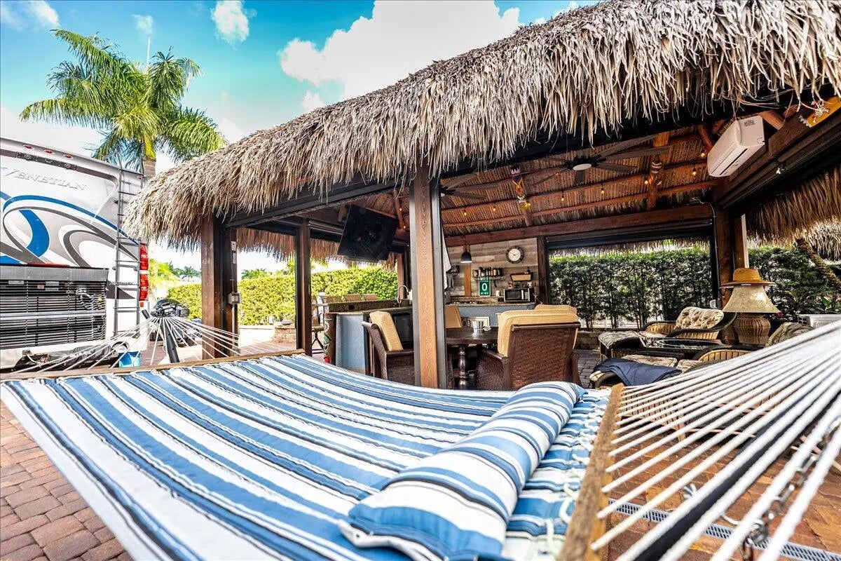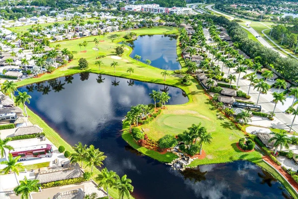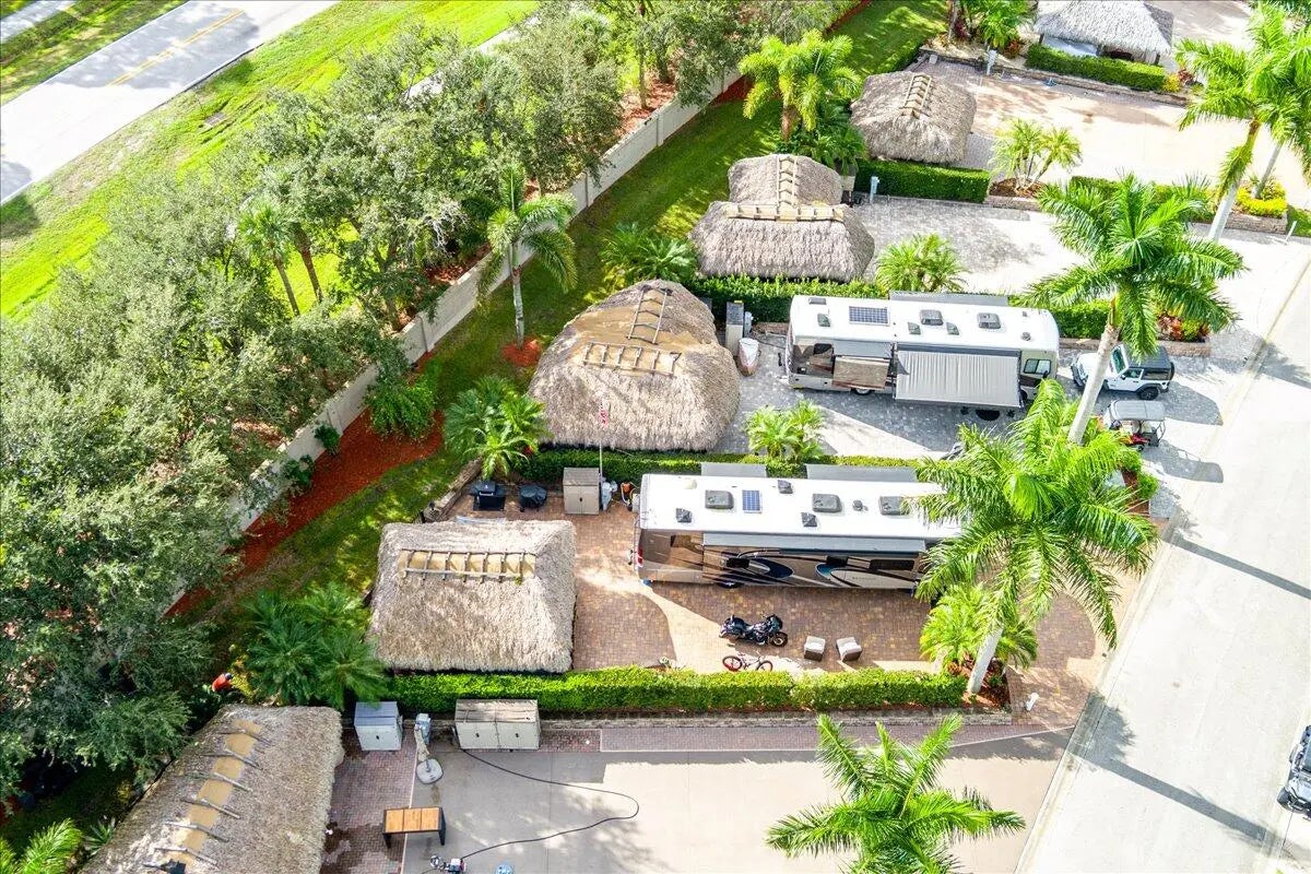 2,958SF RV lot is comfort, style, & functionality in a premier Class A-only gated communities, the Motorcoach Resort St. Lucie West, the property is a fully pavered pad, Eisenglass roll-down enclosure Tiki hut w/ AC, & outdoor kitchen along w/ a grill, furniture & mounted TV, Move-in Ready. Tropical landscaping & hedges provide privacy; a spacious layout allows for expansion/personalization. Residents have access to 4 resort-style pools w/ spas, tennis, pickleball, fitness center, 18 hole Golf Course, dog parks & much more. The renovated clubhouse hosts socials, holiday celebrations, & themed gatherings. Near shopping, dining, & entertainment, ¼ mile from Clover Field Mets Stadium. This is great for both seasonal & long-term investment. 2020 Thor Venetian R40 also avail for $249,000 Cable, internet, water, sewer and trash are included in the HOA fees. Golf cart available for sale.
