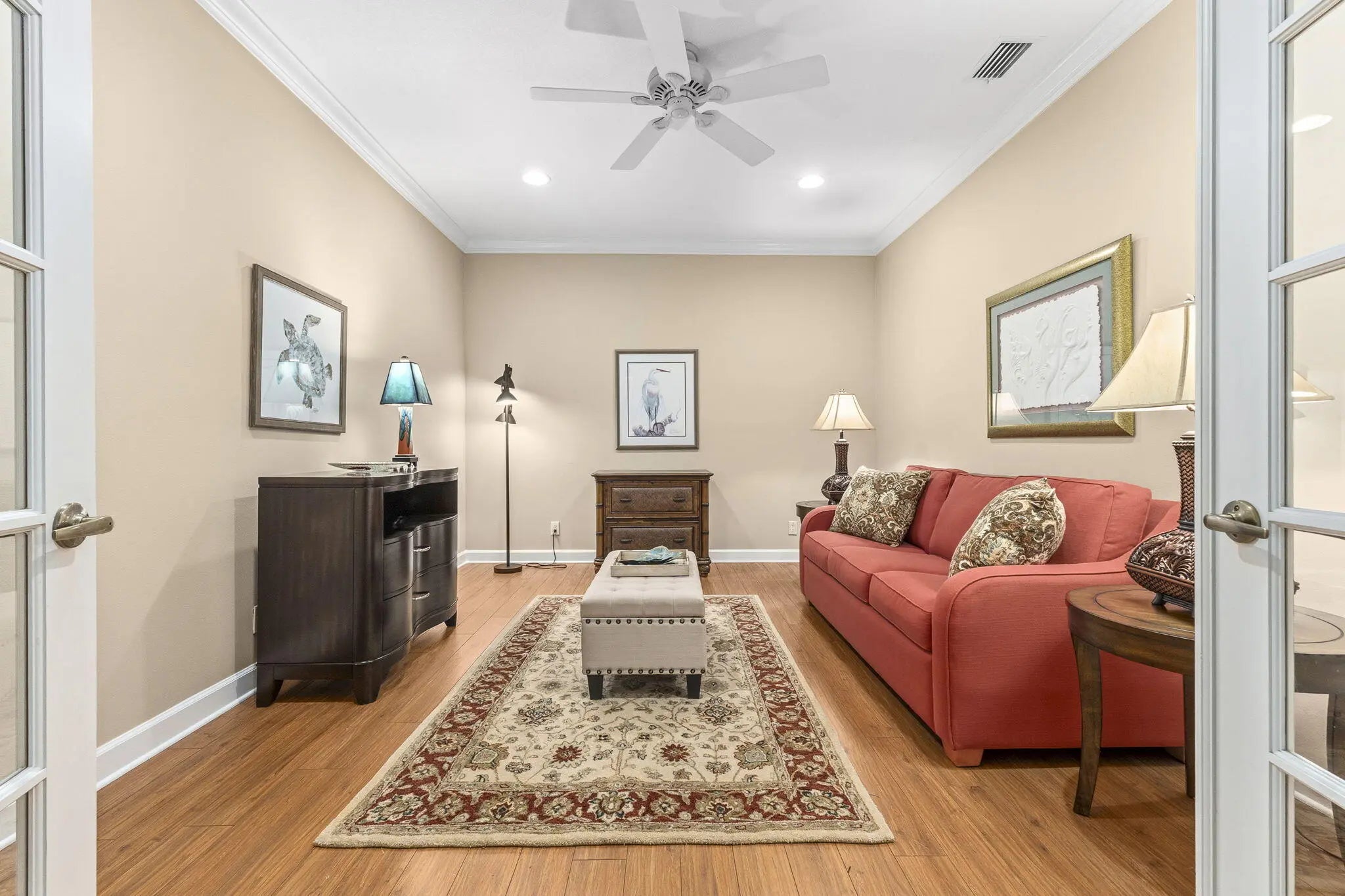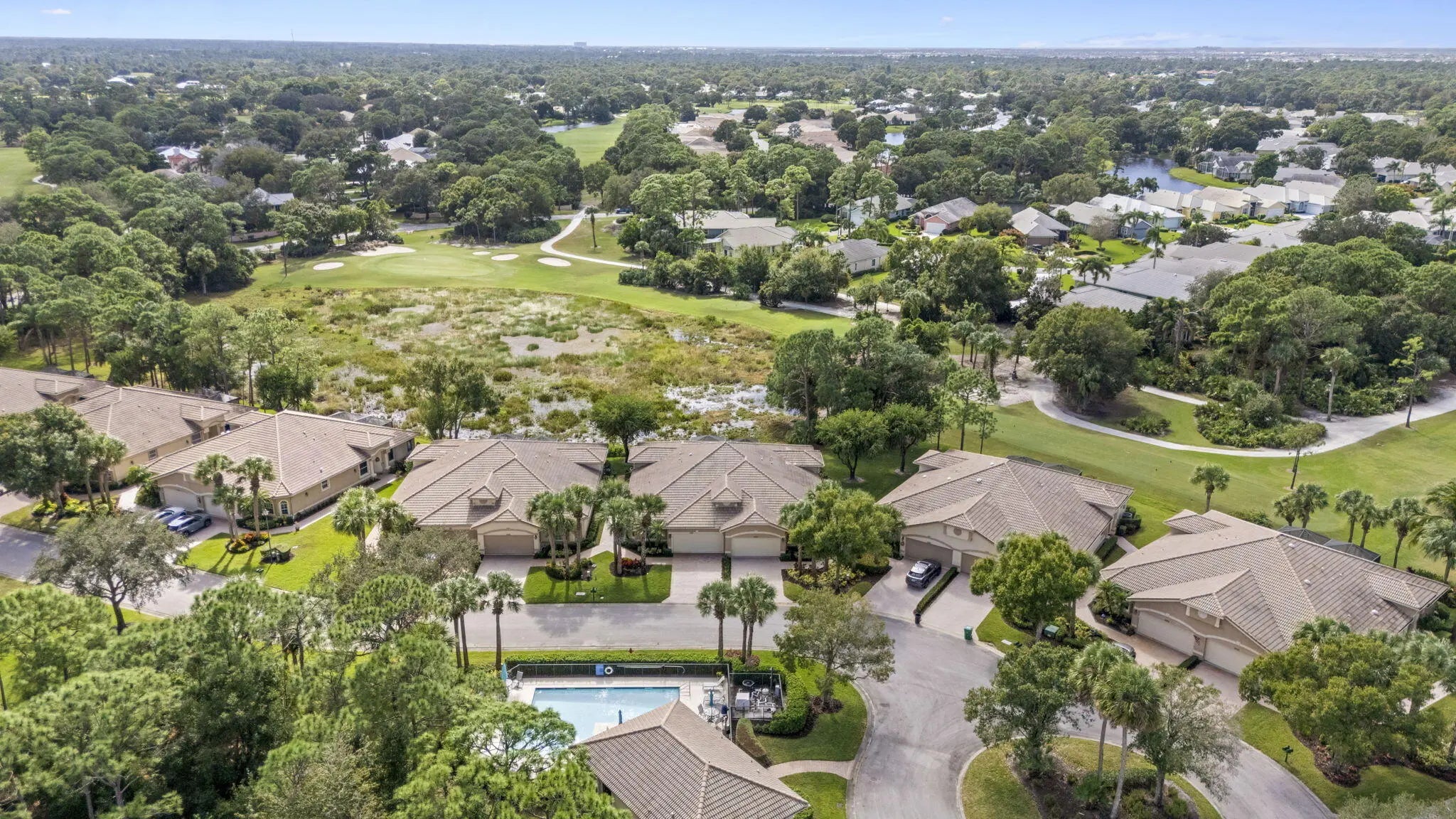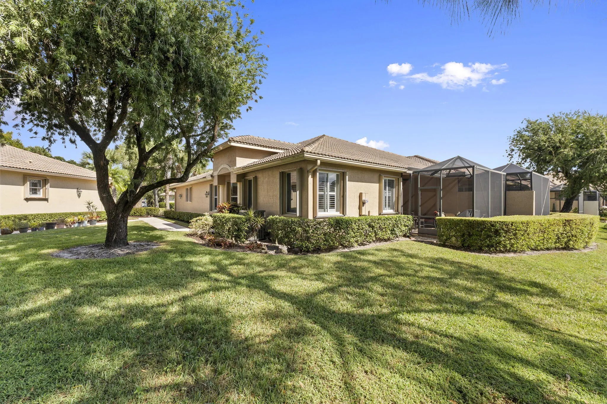Welcome to this highly desirable Hyannis model in the Willow Pines neighborhood of PGA Village. This beautifully maintained 2 bedroom, 2 bath villa with a large den sits on a quiet lot with one of the best views of The Legacy Golf Course. Built solid with CBS construction and a barrel tile roof, the home offers volume ceilings, crown molding, tile floors, abundant natural light, plantation shutters throughout, and a functional split floor plan. All windows have accordion shutters for simple storm prep. The spacious den with French doors works perfectly as an office, flex room or optional third bedroom. The kitchen features 42'' wood cabinets, quartz countertops, a pantry closet, and stainless-steel appliances. The living area opens to a screened, partially covered patio overlooking the golf course, also protected with accordion shutters. The primary suite includes slider doors to the patio, dual closets, tray ceiling, dual vanities, a walk-in shower, and a soaking tub. Guests enjoy their own private bedroom and updated full bath on the opposite side of the home. Just steps away from the Villa, Willow Pines residents have their own community pool and gathering room. The HOA covers lawn care, exterior painting, roof cleaning, cable, internet and exterior pest control, plus access to all Island Club amenities. PGA Village delivers true resort-style living with pickleball, tennis, a fitness center, billiards, library, craft rooms, ballroom, a stunning pool and nonstop clubs and events. Home to the PGA Golf Club's three public courses and The Legacy private course, it's a golfer's paradise. Close to I-95, shopping, dining, medical care, Mets spring training and beaches, with Palm Beach International Airport only 45 minutes away.