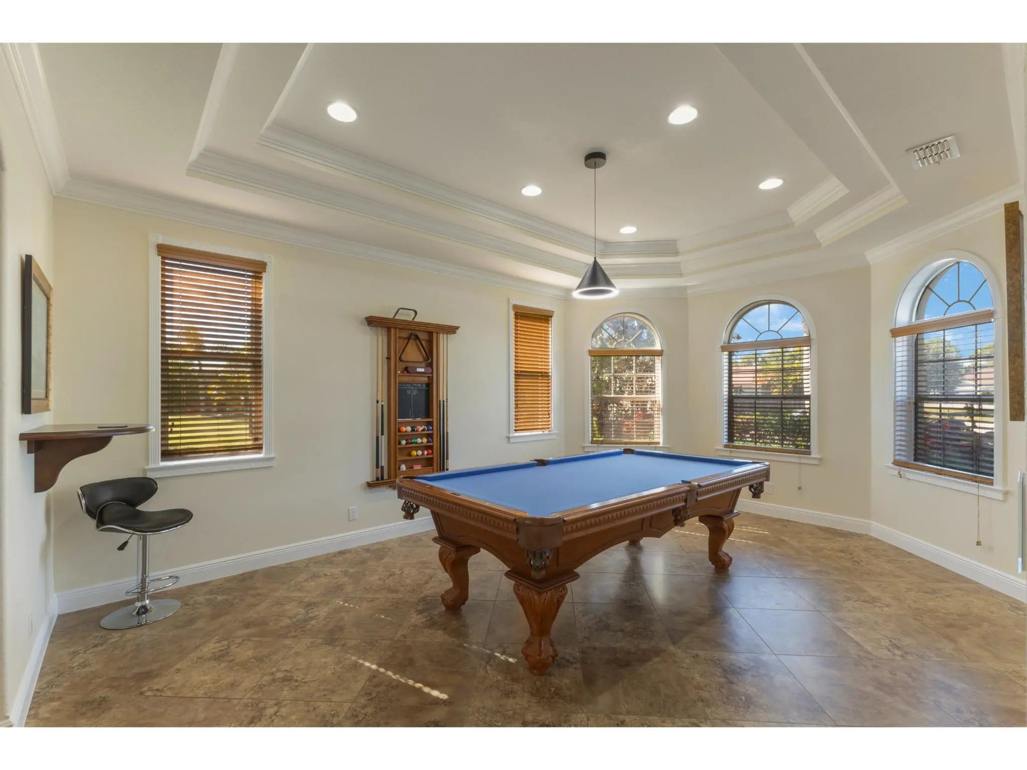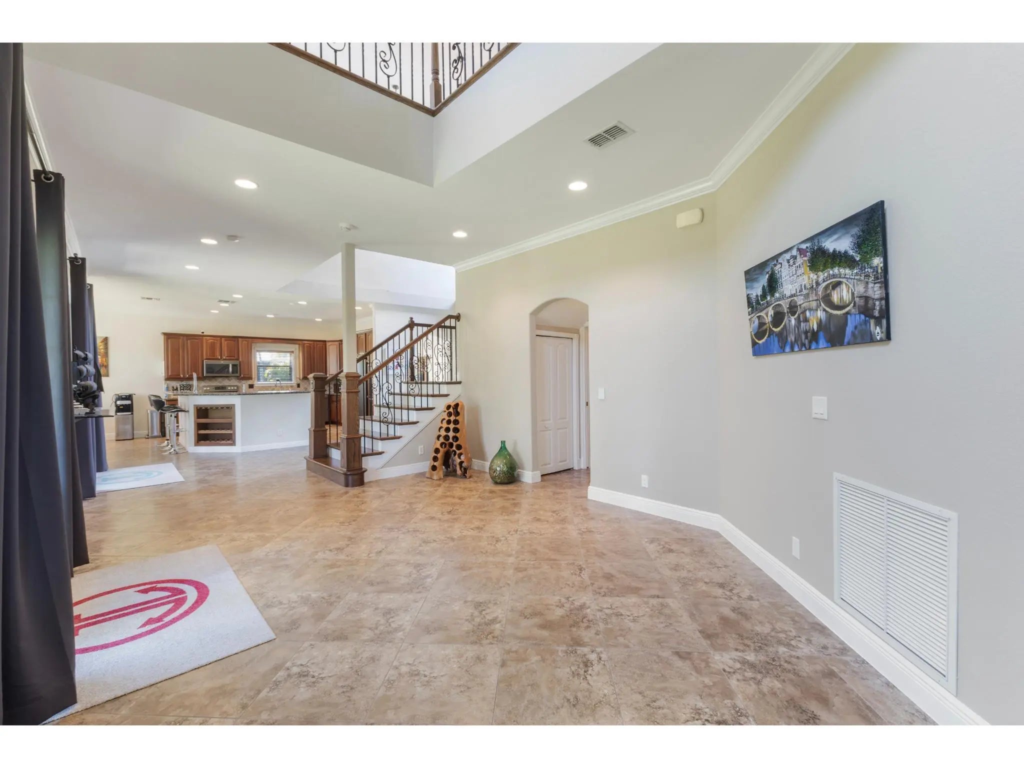 Introducing a breathtaking custom-built residence in the prestigious Torino/St. James community. Nestled at the end of a serene cul-de-sac and backing onto expansive acreage properties, this home offers unmatched privacy and tranquility. Spanning over 3,700 square feet of refined living space, every detail has been thoughtfully designed to impress. Step into the grand foyer, where a striking custom tile mosaic sets the tone for the elegance that flows throughout. The heart of the home is the gourmet chef's kitchen, showcasing 42" raised-panel wood cabinetry, gleaming granite countertops, premium stainless steel appliances, and a convenient second prep sinkperfect for entertaining or everyday culinary creations. The versatile floor plan includes three generously sized bedrooms, a den that can easily serve as a fourth bedroom, and an expansive upstairs loft offering endless possibilities for a media room, home office, or play space. The luxurious owner's suite is a true retreat, featuring a spa-inspired bathroom with dual vanities, a wraparound shower with dual shower heads, and a jetted soaking tub. Step out onto your private balcony to enjoy peaceful views and fresh Florida breezes. Throughout the home, elegant crown molding, architecturally stunning coffered ceilings, and a custom iron-and-wood staircase banister add timeless sophistication. Lovingly maintained and barely lived in, this residence feels brand new. With furnishings negotiable, it is ready to welcome you home. Room sizes approximate and subject to error, buyer to verify.