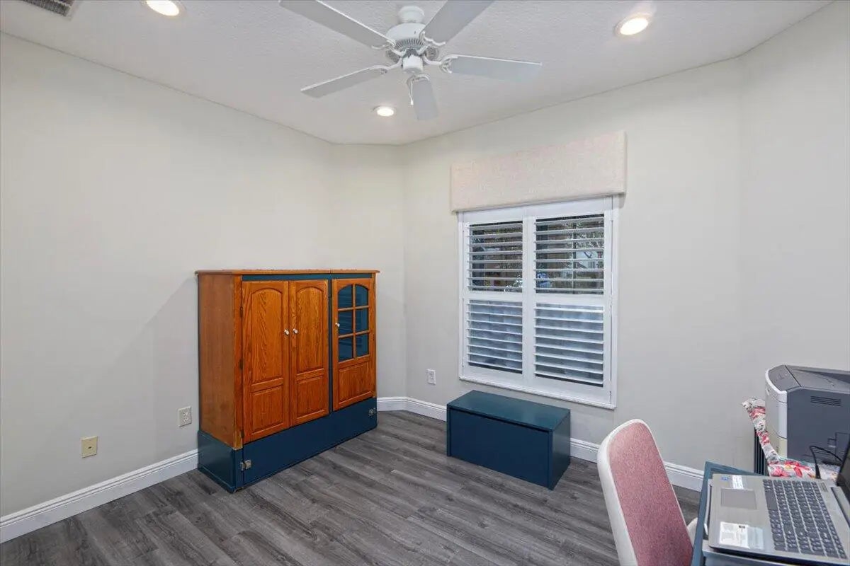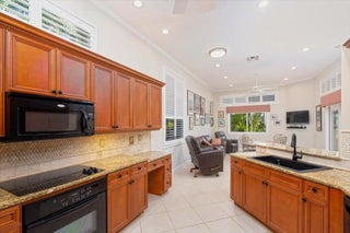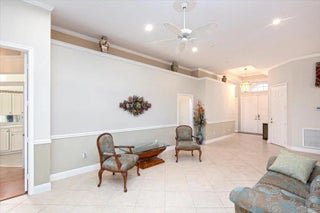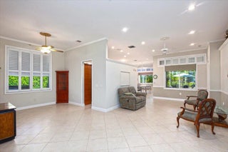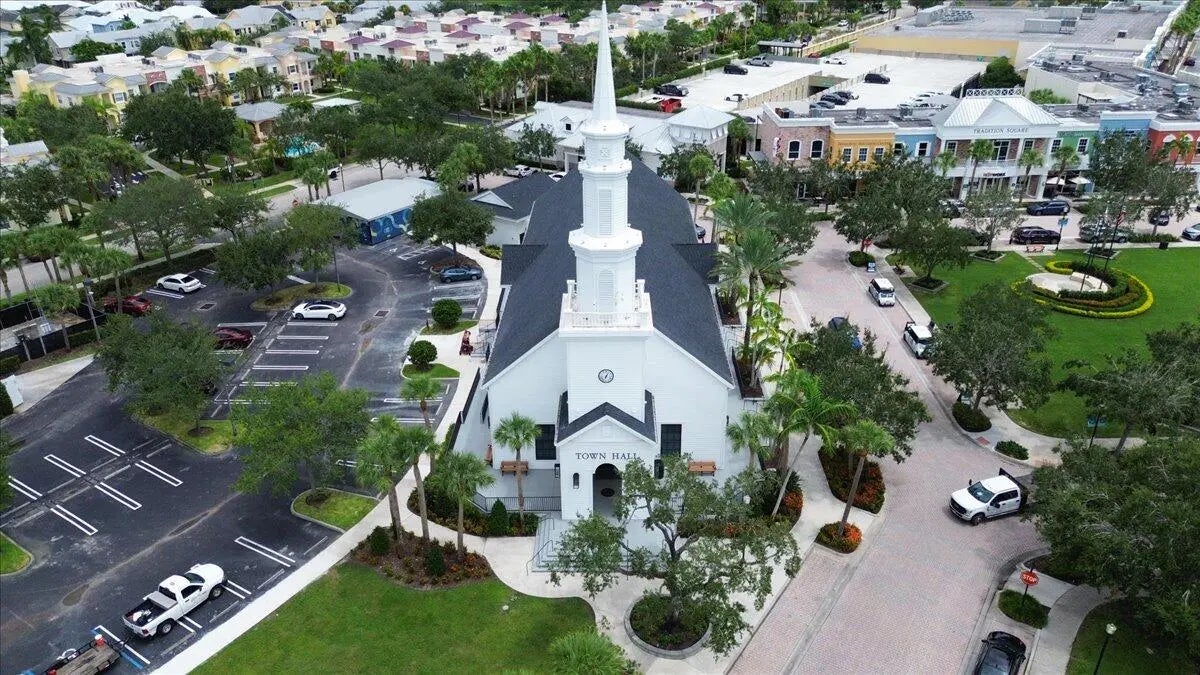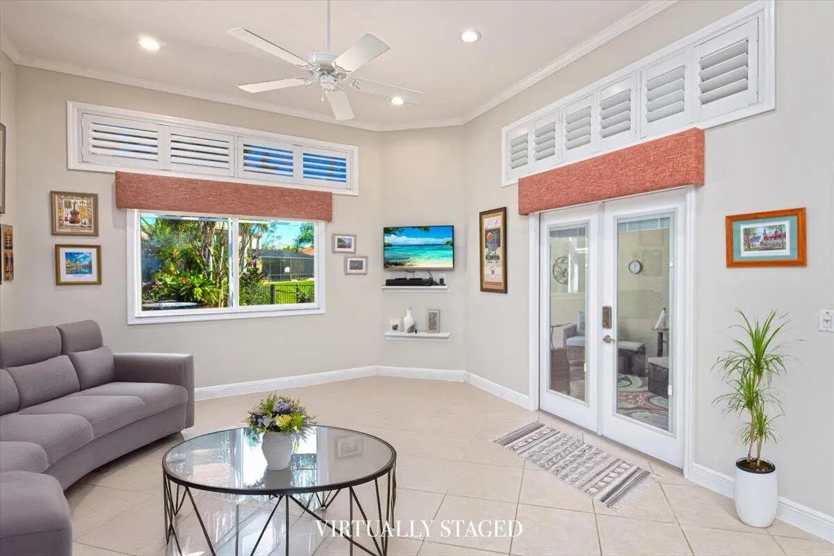 Stunning CBS 3 bed/2bath + DEN lakefront home in TownPark at Tradition. Step through the covered and screened entryway into double front doors to find yourself greeted with ceramic tile flooring throughout the main living areas and a spacious great room with crown molding. The versatile kitchen was built for function/flexibility, and features granite countertops w/ a custom Italian tiled backsplash, custom wood cabinetry with copious storage space, and a breakfast bar/nook for easy dining. The master suite features voluminous ceilings, two walk- in closets, lakefront views, and an ensuite bath complete with dual sinks and a separate walk in shower. The covered and screened lanai features views of an expansive and serene lake. Fenced in yard and impact window/accordion hurricane shutters. Located in the gated community of TownPark at Tradition, residents enjoy a resort-style lifestyle with world-class amenities including a luxurious clubhouse, state-of-the-art fitness center, resort-style pool, tennis, basketball and pickleball courts, and a vibrant calendar of community activities. The HOA fee includes cable, high-speed internet, landline phone, alarm monitoring, and manned gate security providing both convenience and peace of mind. Just a short walk to Tradition Square's charming dining, boutique shopping, and year-round events, and only minutes from I-95 and Cleveland Clinic, this home offers the perfect blend of convenience, and lifestyle.