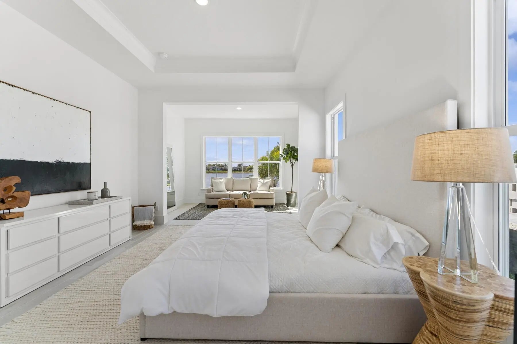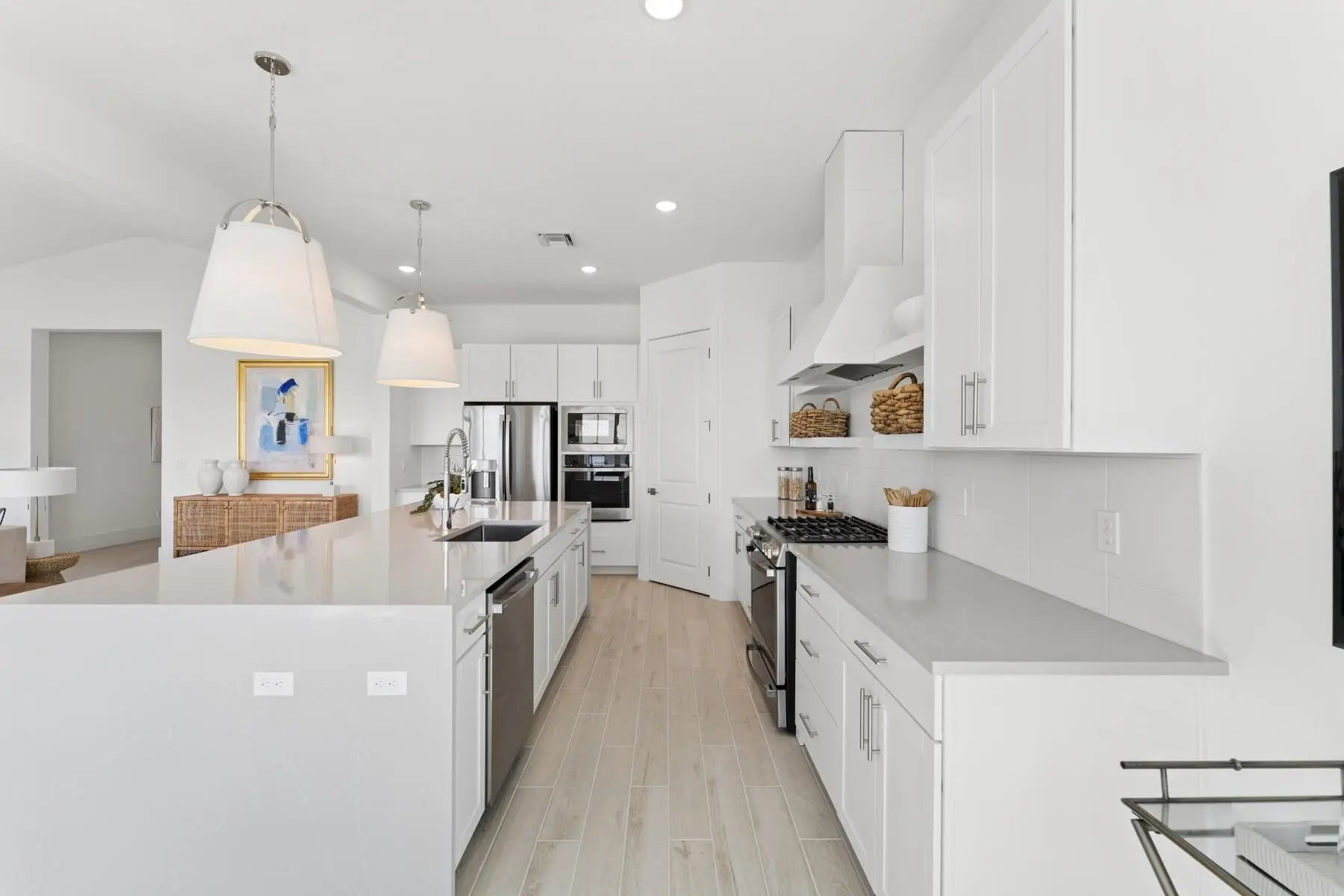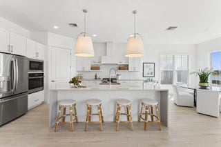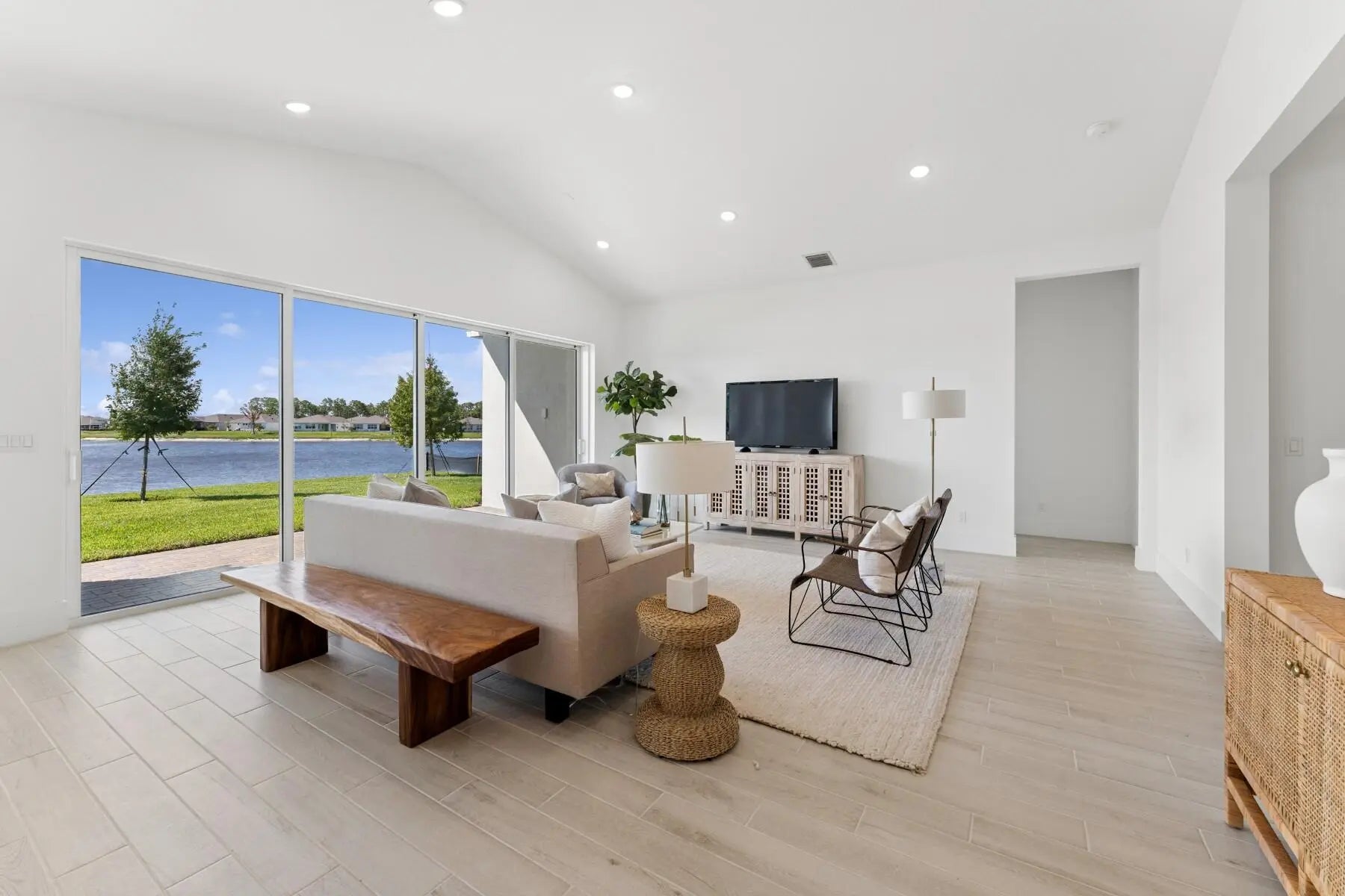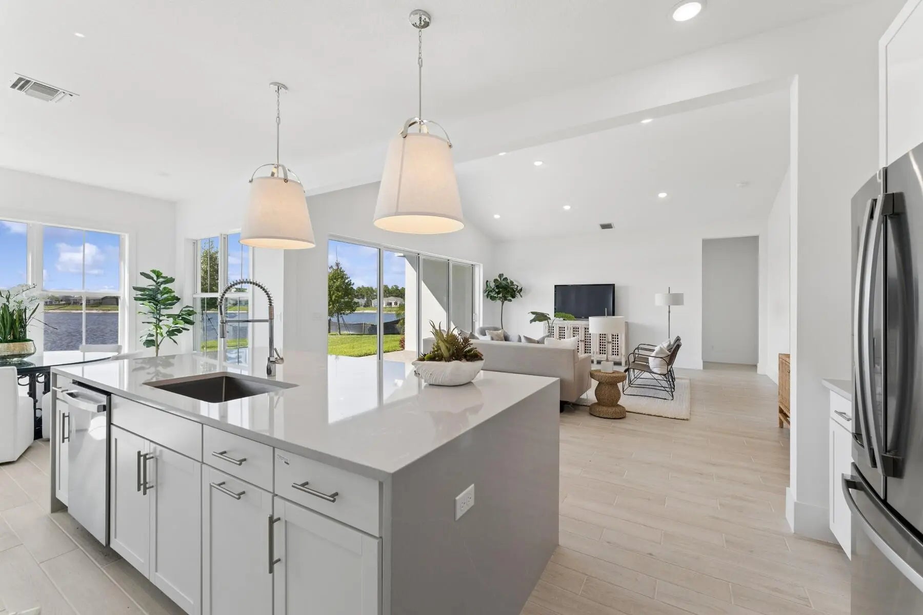 Stylish Bell Floorplan with Lake Views & Designer-Curated Loft Look This Bell offers a seamless blend of comfort, versatility, and modern style. A secluded Extra Suite Plus provides an ideal setup for multigenerational living, offering privacy and flexibility for extended guests. The beautiful kitchen showcases white cabinetry paired with quartz countertops, delivering a clean, sophisticated aesthetic that complements the home's designer-curated loft look. The inviting great room stands out with its striking vaulted ceiling, creating an airy, open atmosphere perfect for gatherings. The pristine primary suite includes a cozy sitting room and a well-appointed primary bath, offering a peaceful retreat at the end of the day. A convenient home office provides a productive space for remote work or study. Enjoy indoor-outdoor living with a versatile covered patio highlighted by a 16' multi-slide door, capturing scenic lake views and enhancing the home's relaxing ambiance. Completing the property is a functional 2-car garage along with an additional utility garage for extra storage or hobby space. A thoughtfully designed home that pairs modern elegance with everyday livability.