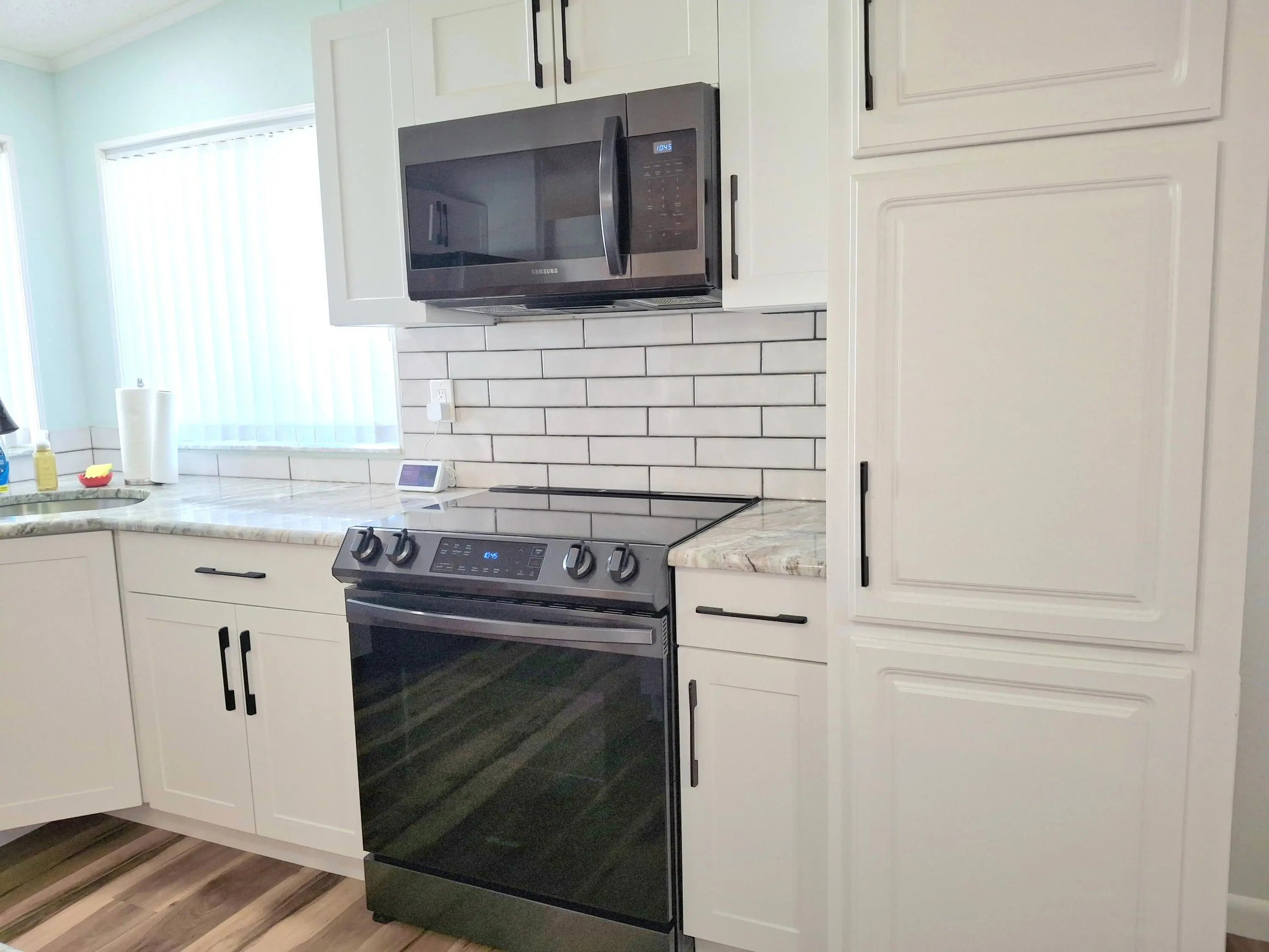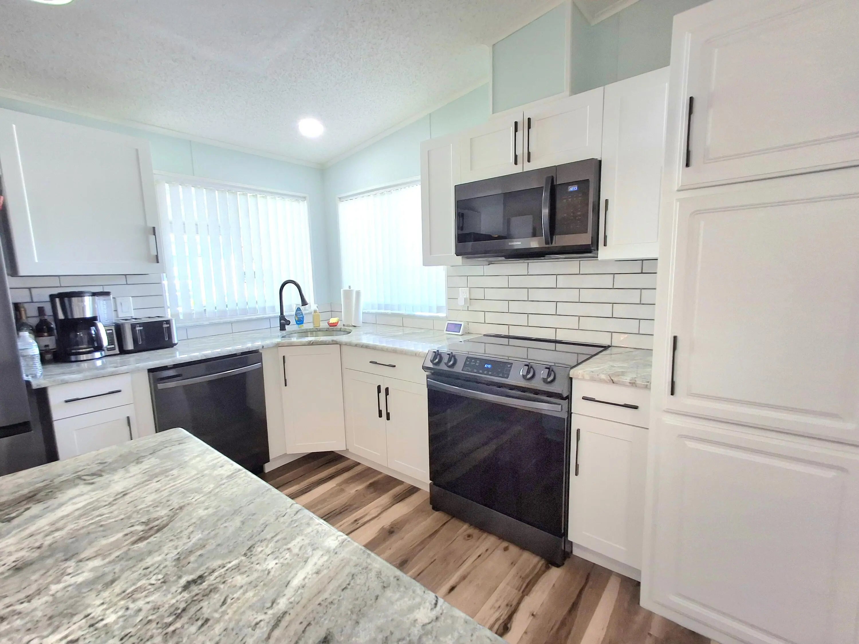 Fully furnished 2/2 home featuring a beautifully remodeled kitchen (updated 3 years ago) with quartzite countertops, a center island, soft-close cabinetry, and matching upgraded appliances. Luxury vinyl flooring runs throughout the home, adding a modern and cohesive feel. The water heater is just 2 years old. Nestled on a quiet cul-de-sac within a vibrant 55+ community, this home offers comfort, style, and convenience. Savanna Club boasts exceptional amenities, including three clubhouses—each with its own pool and fitness centers, an on-site restaurant, an 18-hole golf course, a theater, and so much more. HOA fees include cable, internet, trash services, and full access to all community amenities. Land Leased Property