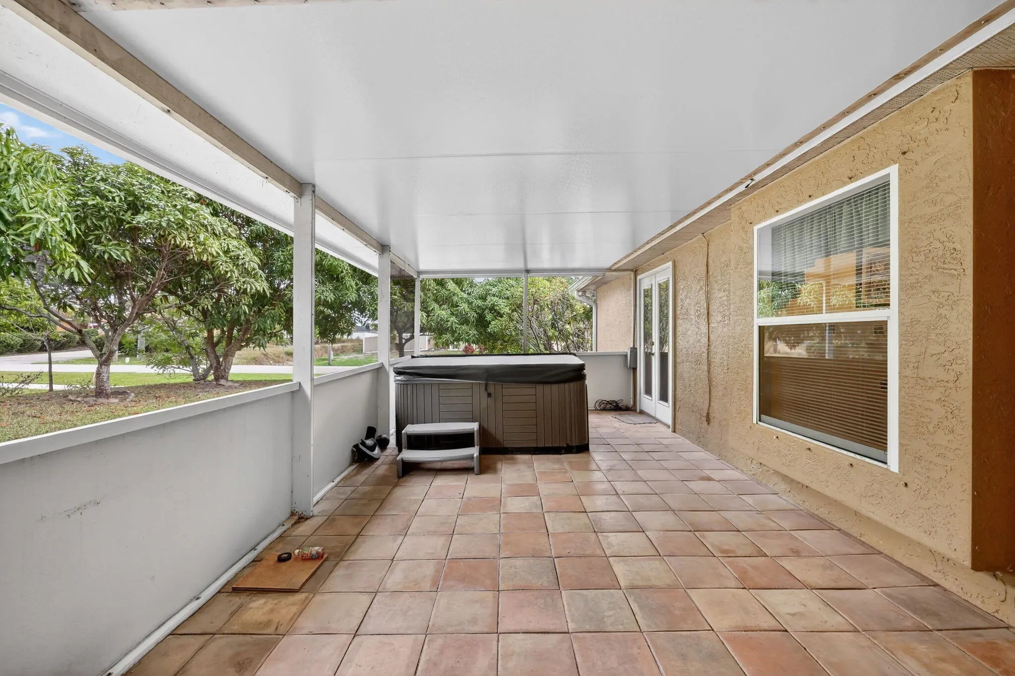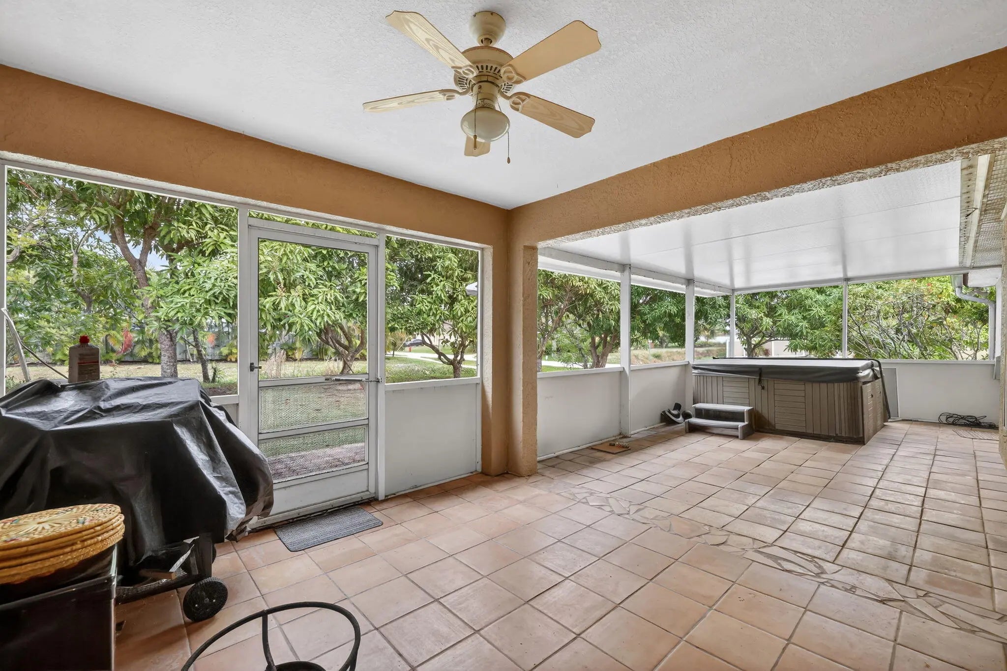 Pristine 4-bedroom, 3-bath home on an oversized corner lot with lush tropical landscaping. Brand new roof installed Dec. 2025. Spacious layout features high vaulted and tray ceilings with planter shelves, large sliding glass doors, lots of windows and light, wood floors, and an upgraded kitchen with granite countertops, rich cabinetry, and spacious corner pantry. Master suite offers double walk-in closets and a spa-style bath with dual sinks, soaking tub, and separate shower. Enjoy a huge screened patio with hot tub and a private yard filled with mango, avocado, other fruit trees, and vibrant flowers, perfect for relaxing or entertaining. Two-car garage and laundry room included. Hot water heater and AC are only 5 years old. Prime location near shopping, dining, and entertainment.