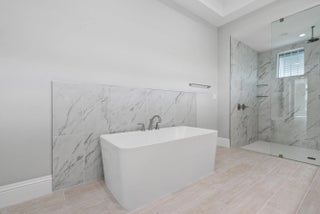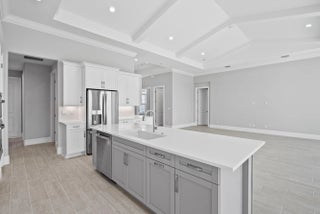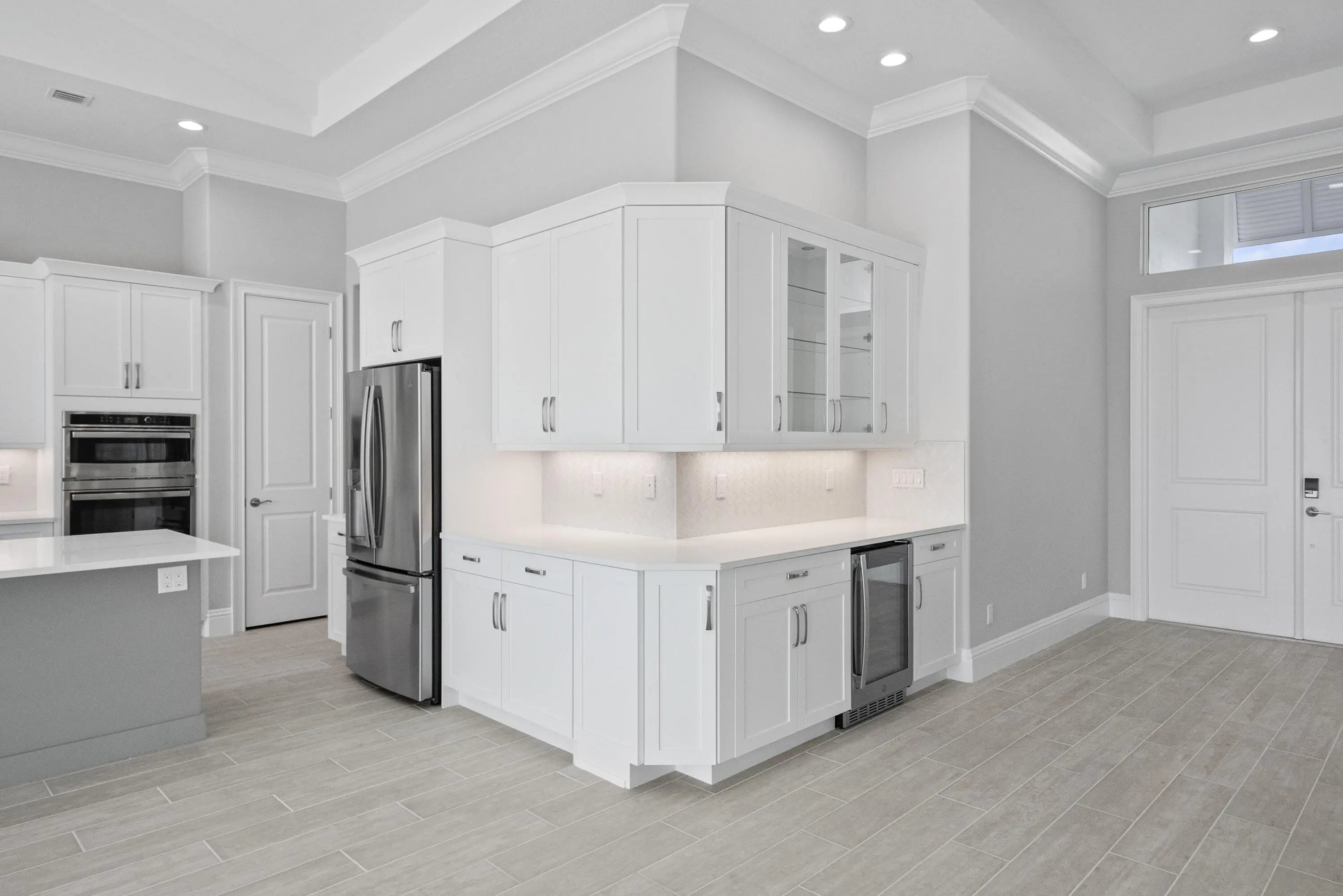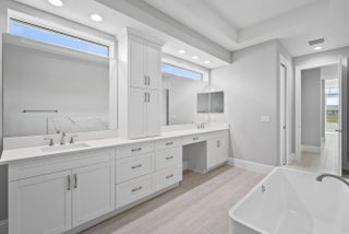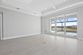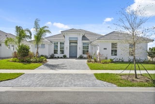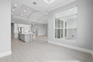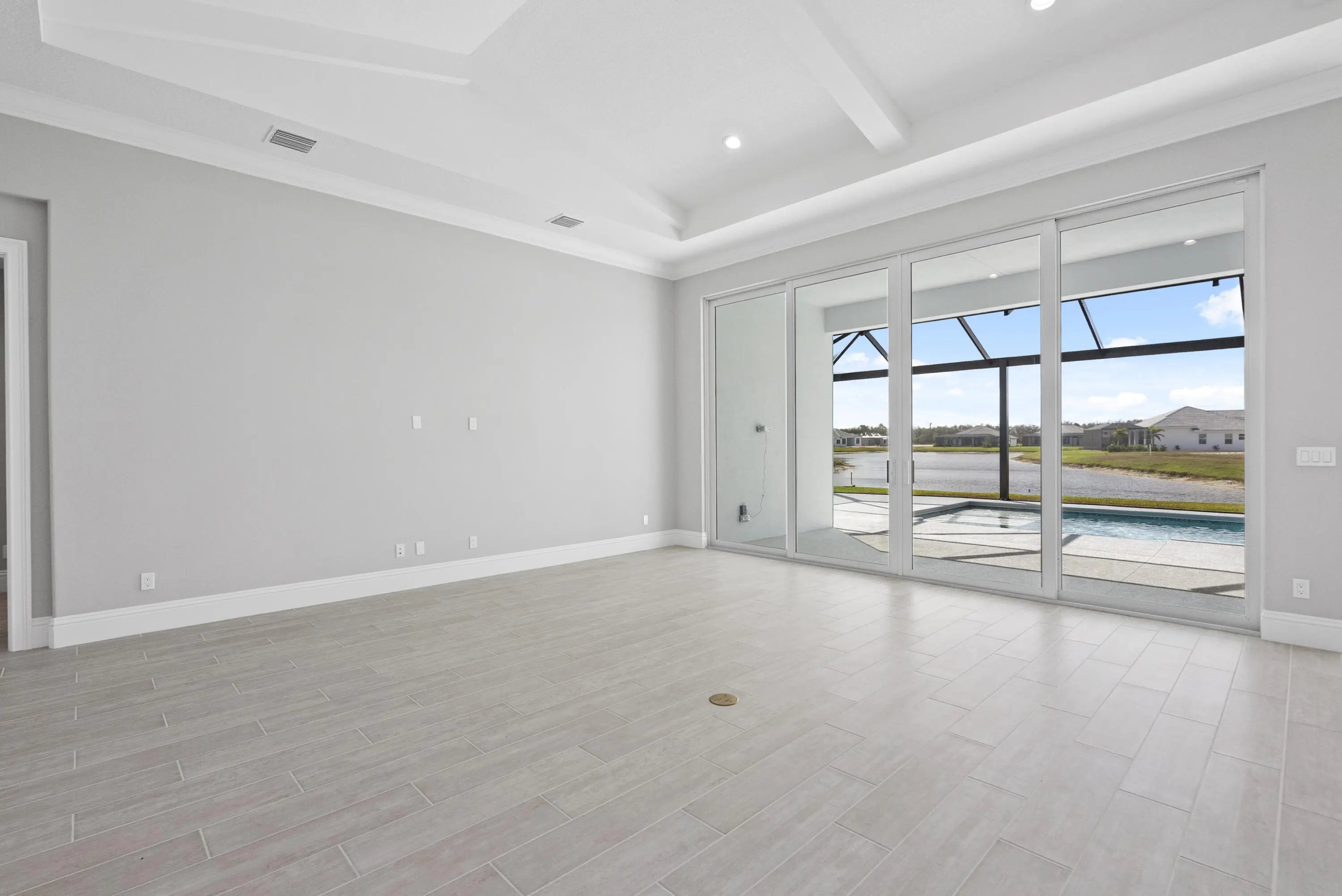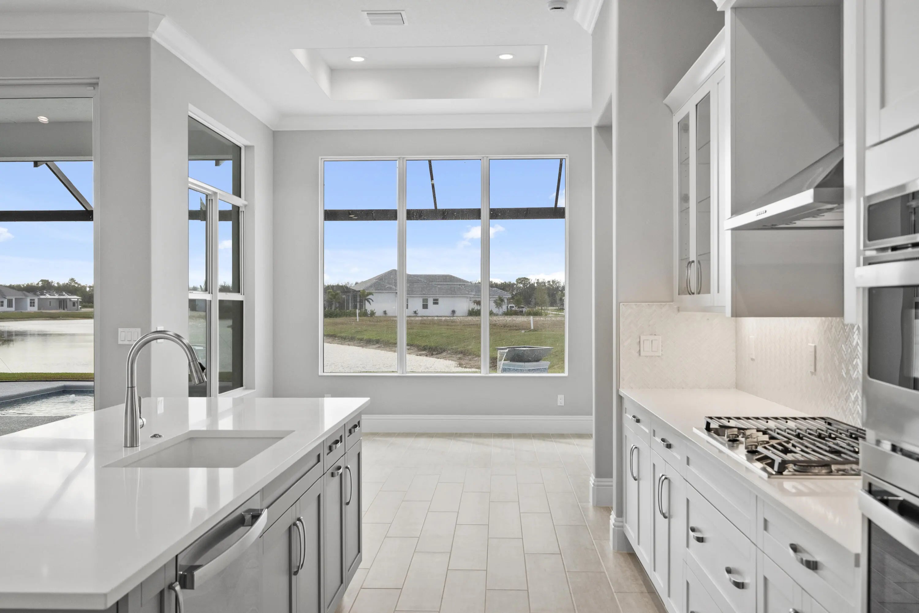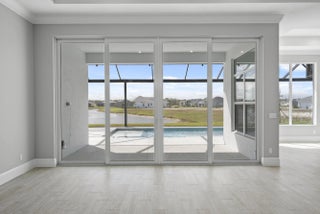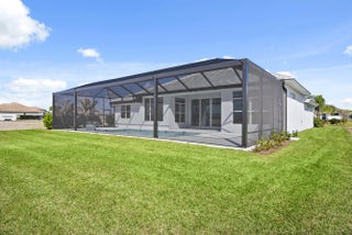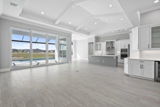 4 bedroom, 3.5 bath home with a den and 2-car garage showcases the elegant Coastal elevation and is thoughtfully designed with upscale finishes throughout. The heart of the home features a gourmet kitchen equipped with the GE Profile appliance package, upgraded quartz countertops, a Pelican single-bowl granite sink, and a kitchen convenience package for added functionality. The kitchen also includes two junction boxes above the island, ready for future pendant lighting, and opens to a spacious great room enhanced by 4 hi hats and a seamless flow into the dining room and office, all of which are also pre-lit. A bar with a built-in beverage center adds a touch of luxury and convenience for entertaining. The master suite is complete with an Aurelia free-standing soaking tub and spa-inspired finishes. Additional highlights include wood plank tile flooring throughout, tile-to-ceiling finishes in bathrooms 2 and 3, a pocket door for added privacy at bedroom 3, and prewiring for a wall-mounted TV on the covered patio. The home also features an enlarged pool with sun shelf, bubbler and panoramic screen enclosure, creating a private outdoor oasis with long lake views.