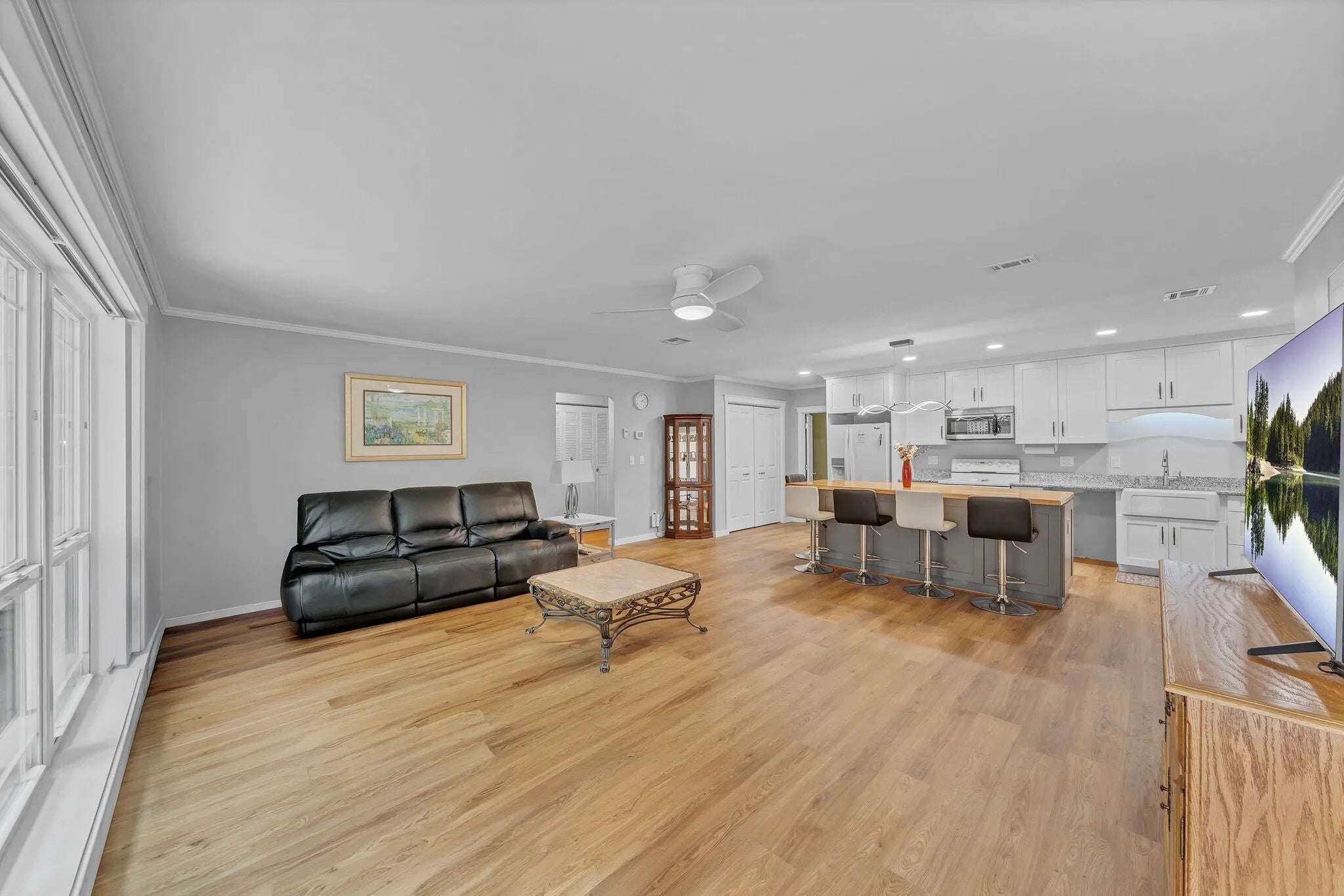 Mid-Century Modern-influenced CBS home in Sandpiper Bay, built in 1970 and thoughtfully updated by the current owner with significant aesthetic improvements. This 3 bed, 2 bath home with 1545 sqft of living space has an open & comfortable layout with ample natural light from oversized windows, including a front hurricane-rated window. The kitchen has been updated with quartz countertops, farmhouse sink, upgraded lighting, and a handmade kitchen island featuring fine wood craftsmanship on the island top. New water-resistant wood-looking flooring has been installed throughout the main living areas. Original mid-century elements remain, including retro tile work in the bathrooms, preserving the home's character. The screened lanai has been enhanced with plexiglass sliding windows, allowing for flexible year-round use. An additional ex-large, enclosed storage closet provides climate control for decorations or more. The property sits on a larger-than-average lot for the area, offering space for a future pool and room for boat and RV parking. Located in the sought-after Sandpiper Bay area just east of US-1, this home enjoys a prime position near the North Fork of the St. Lucie River and the new Port District. Residents have quick access to riverfront parks such as the Pioneer Park Tot Lot, public boat & kayak launches, and a charming waterfront boardwalk connecting to local & future restaurants! Beaches, public golf, schools, hospitals, a short drive away, US-1 and the FL Turnpike nearby makes any commuting easy!