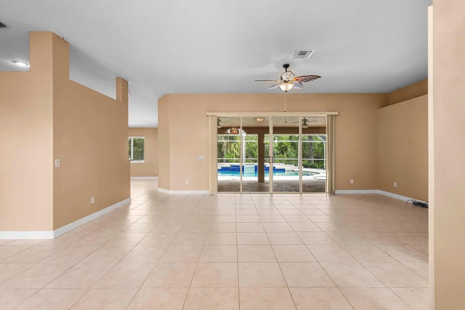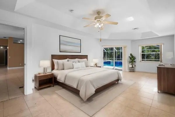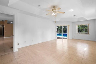 Three bedroon two bath with a den/office/4th bedroom. Cul de sac location. Screened lanai over the heated pool and spa. Formal Dining Room. 2016 A/C. Golf cart parking in garage. Secluded yard backed to preserve.