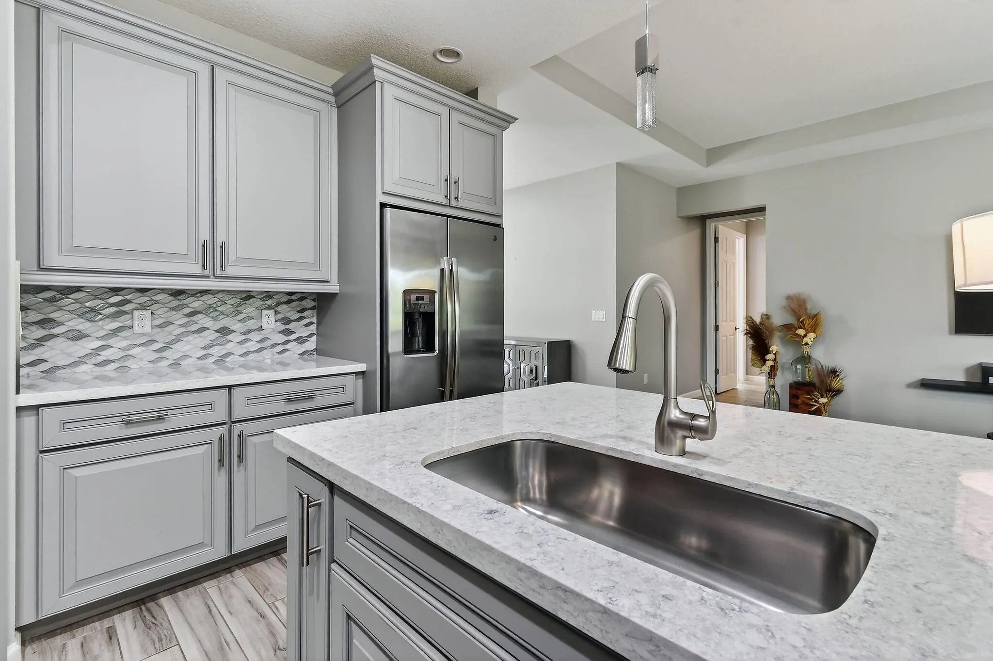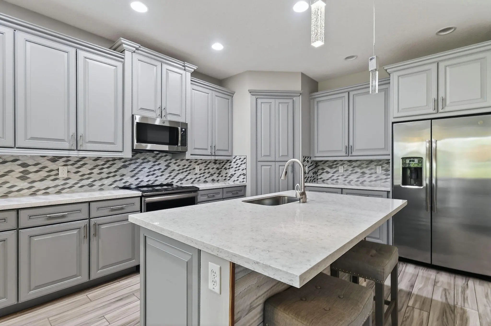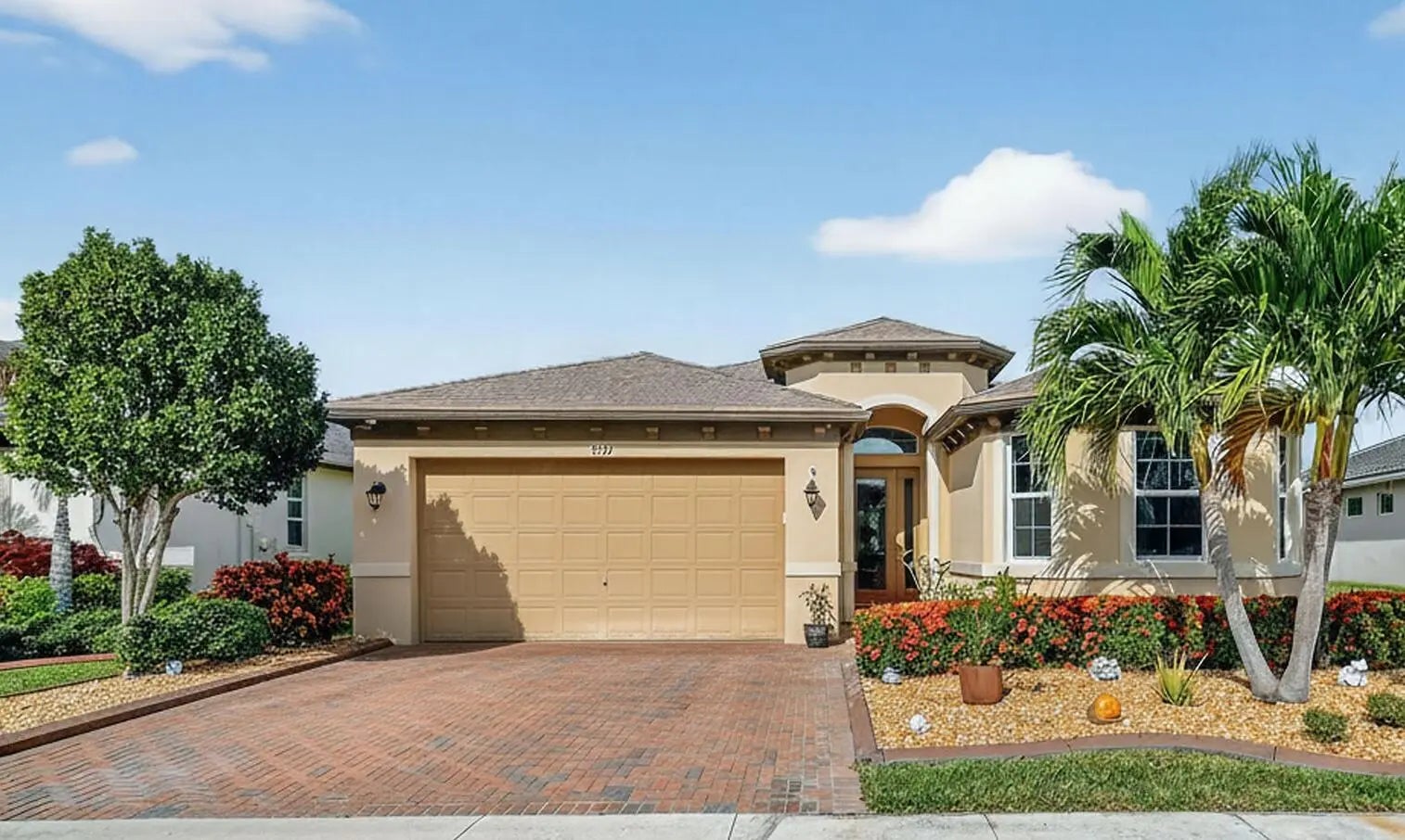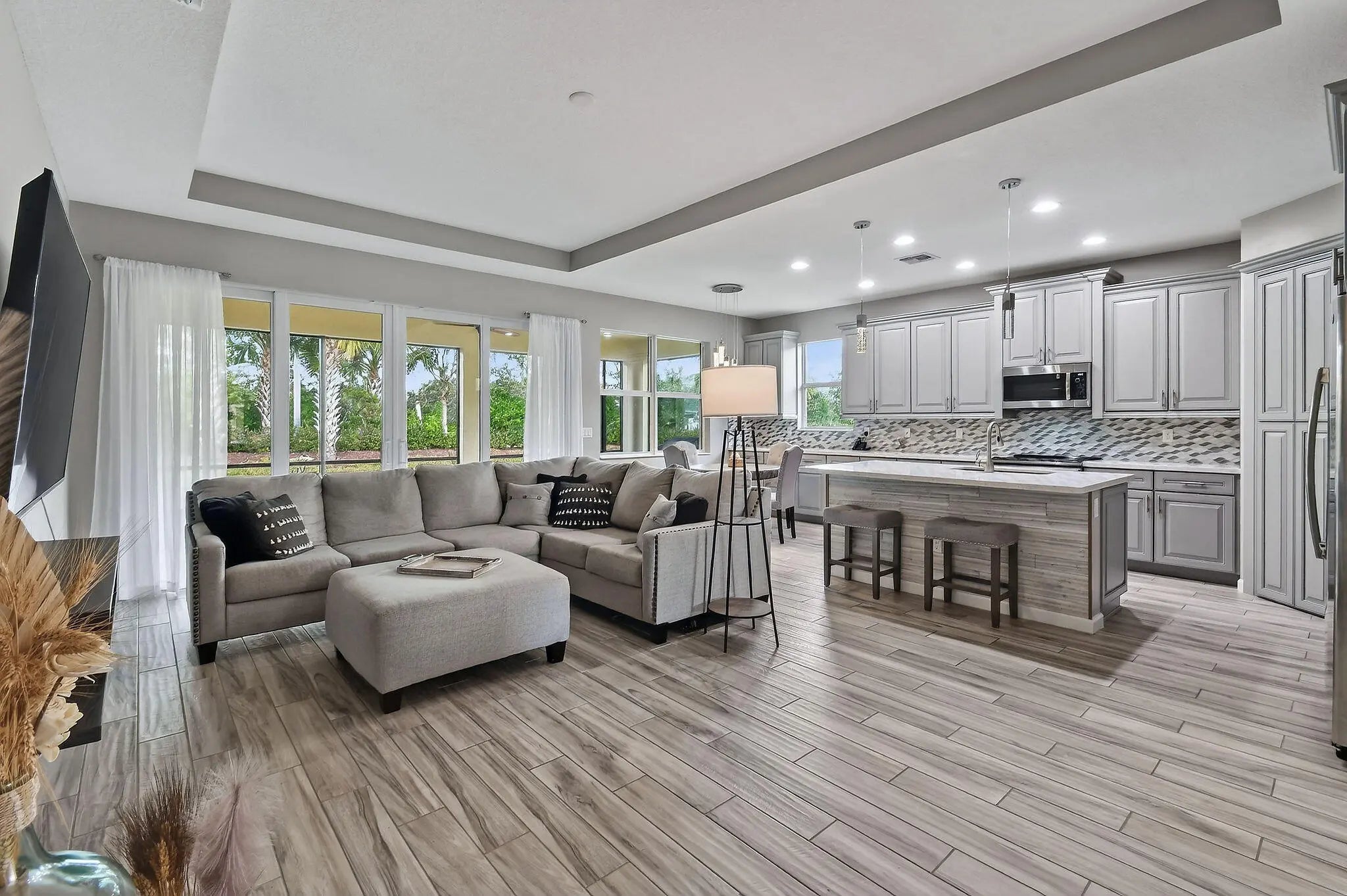 SELLER TO PRE-PAY 1 YEAR OF HOA!! Enjoy life in this peaceful but active over 55 community. Pristine 3 bed, 2 ½ bath PLUS OFFICE, mudroom, ISLAND kitchen, one-touch custom blinds, neutral paint, TILE floors throughout, TWO master walk-in closets, IMPACT windows and doors, professional garage organizer, screened back patio. Community amenities: 2 heated pools, multi-million$ clubhouse, hot spa, waterpark, basketball, tennis, bocce, billiards, gym, yoga, game room, picnic areas, more! Walk to downtown Tradition, with many festivals, activities and concerts, dozens of upscale neighborhoods with lakes, walking trails, parks, shopping, al fresco DINING, Cleveland Clinic HOSPITAL. Nearby is GOLF, hiking, BEACHES, nightlife, BOATING, NY METS spring training, much more. PBIA only 50 minutes. Stunning extended kitchen with extra soft-close cabinets, huge quartz center island, hidden full size pantry, dual oven, microwave & dishwasher all GE Profile high-end appliances. Extra floor to ceiling soft-close cabinets in master bathroom. HOA Includes almost everything! Blue Stream Fiber is your local provider for super-fast Internet, Cable TV, home phone and home security services to the residents of the various Tradition communities, included in your HOA payment. Additionally, lawn mowing, edging, trimming, irrigation \ irrigation system and exterior pest control are all included. FURNISHED: Two of the three bedrooms are furnished, plus an office, the eat-in-kitchen dinette set and the living room set, and the wall mounted television are all included in the sale. Mrs. Clean lived here and the place is spotless. Bring your clothes and toothbrush and be ready to enjoy the good life in sunny Florida.