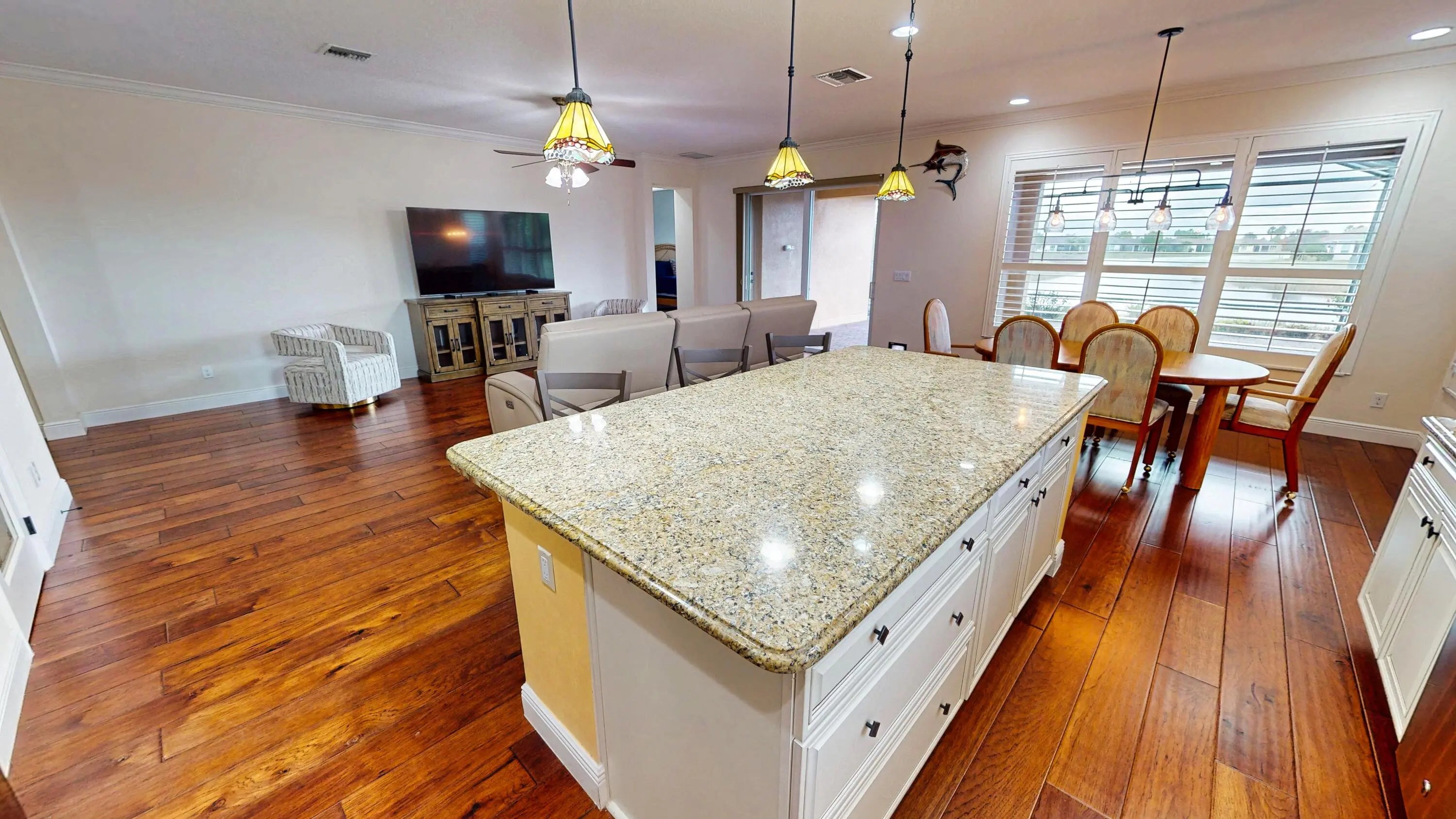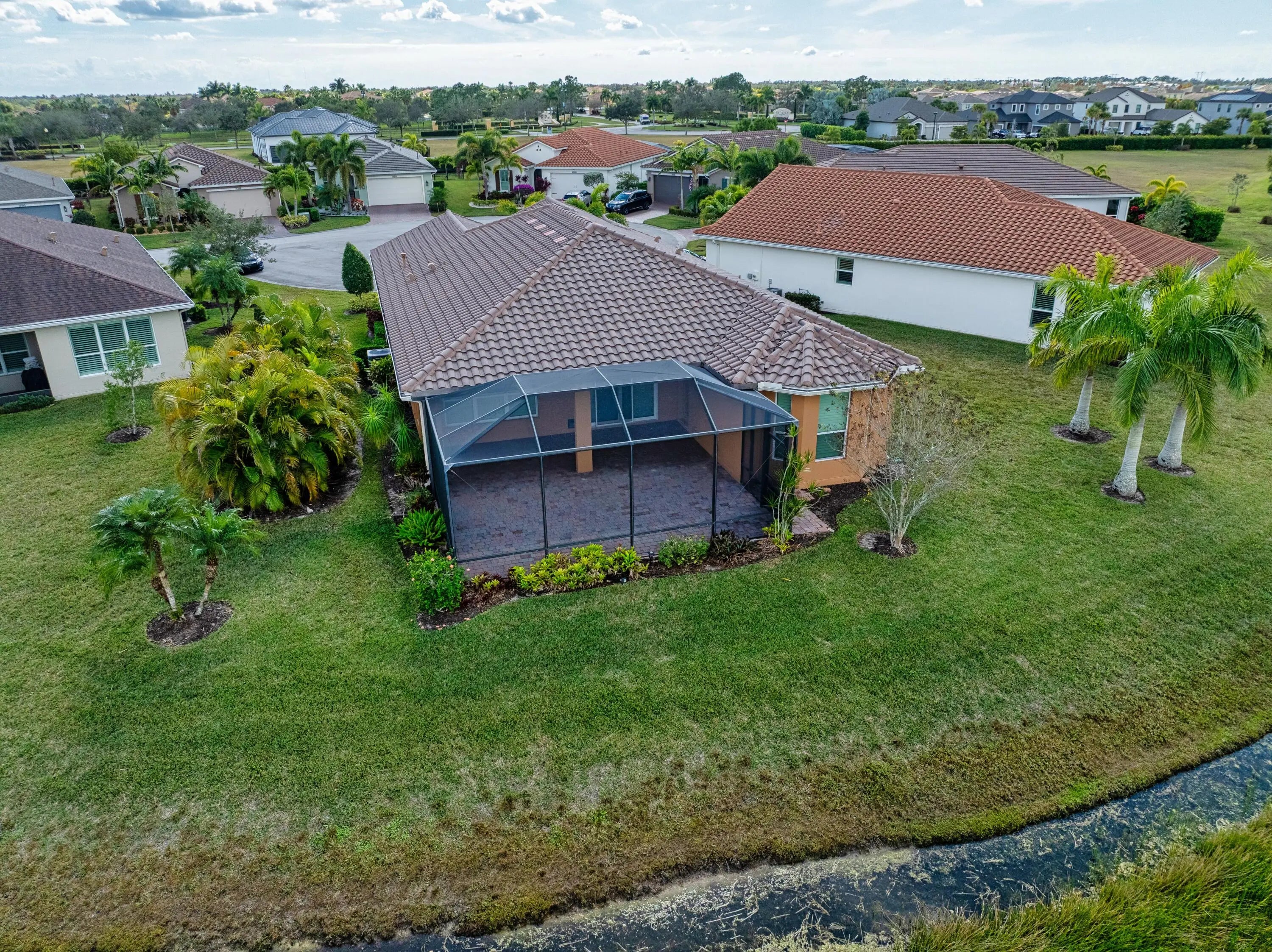 This exceptional 3-bedroom, 2-bath residence offers over 2,000 square feet of thoughtfully designed living space with breathtaking, long-lake views that stretch the entire length of the water. Perfectly situated on a quiet cul-de-sac, the home features a rare pie-shaped, oversized lot that enhances both privacy and outdoor enjoyment. An expansive covered, extended, and screened lanai creates the ideal setting to relax or entertain while taking in the serene lake views. Inside, the open-concept great room is designed for gatherings, seamlessly blending the living, dining, and kitchen areas—all overlooking the water. The kitchen is a true showpiece, complete with a large center island, upgraded 42-inch cabinetry, stainless steel appliances, and abundant storage. The spacious primary suite features a charming bay window, allowing natural light to pour in while framing tranquil views. Impact windows, a durable tile roof, and custom lighting and window treatments add both style and peace of mind. The second and third bedrooms are generously sizedperfect for guests or easily adaptable to a home office or flex space. A rare opportunity to own a lakefront home that combines luxury, functionality, and an unbeatable view.