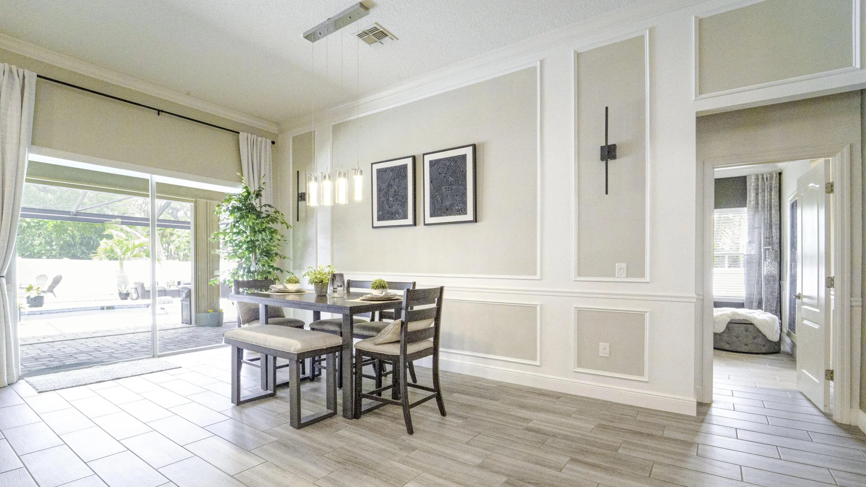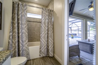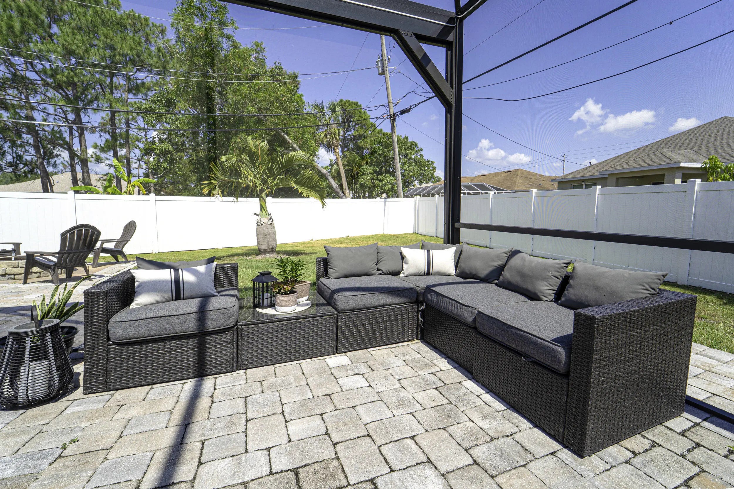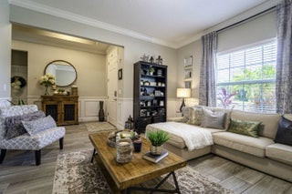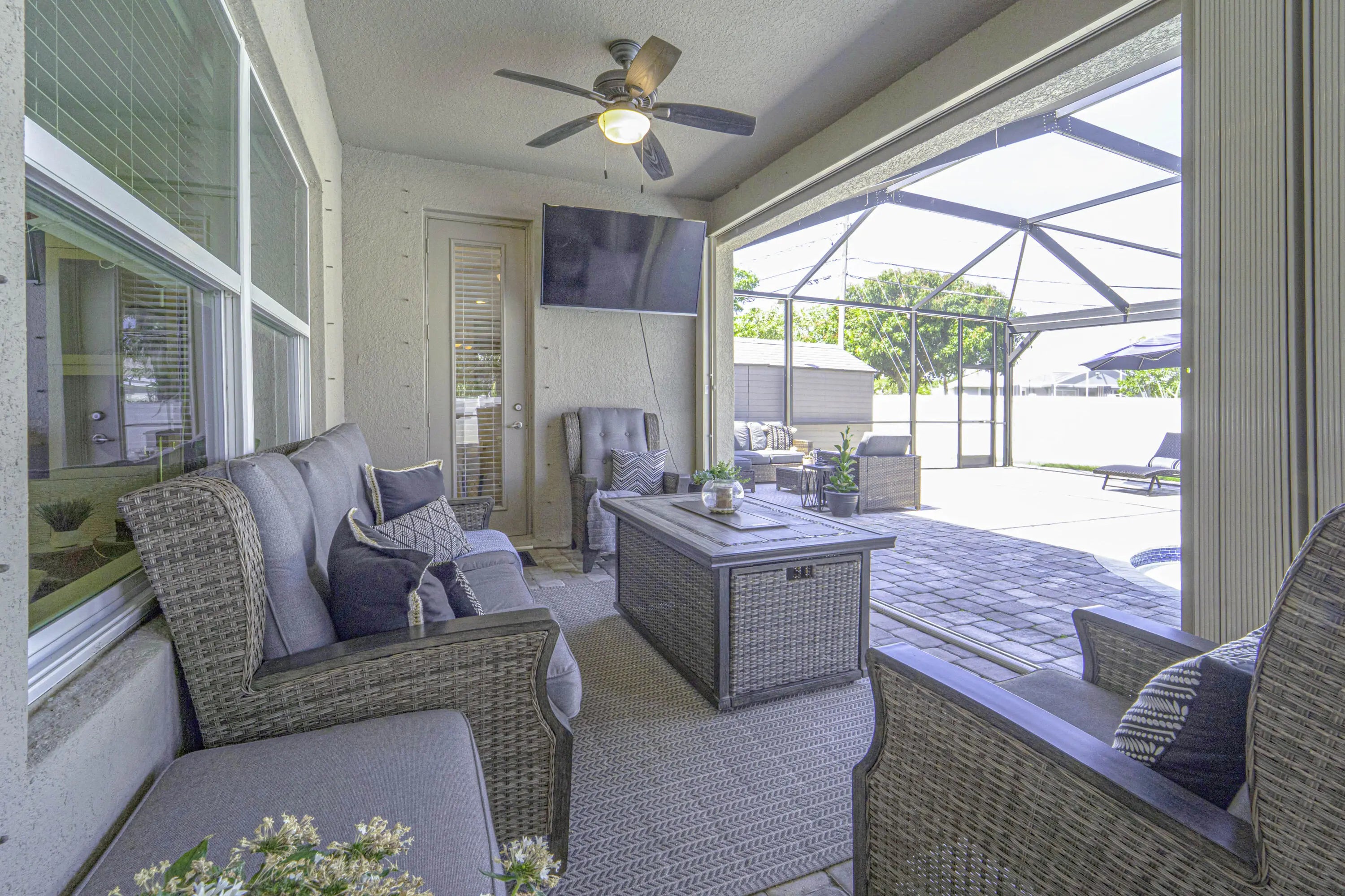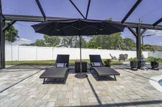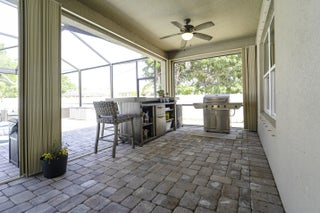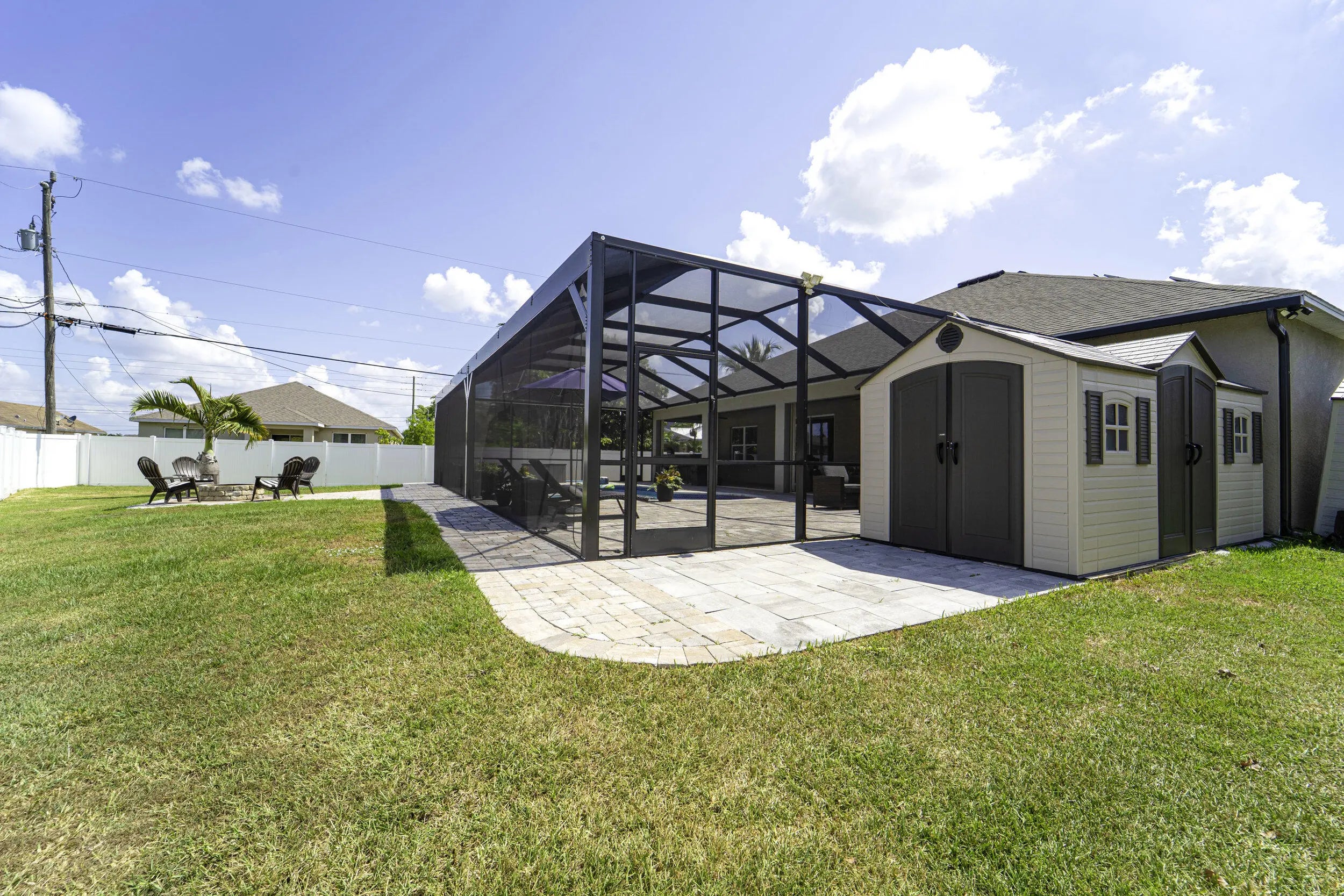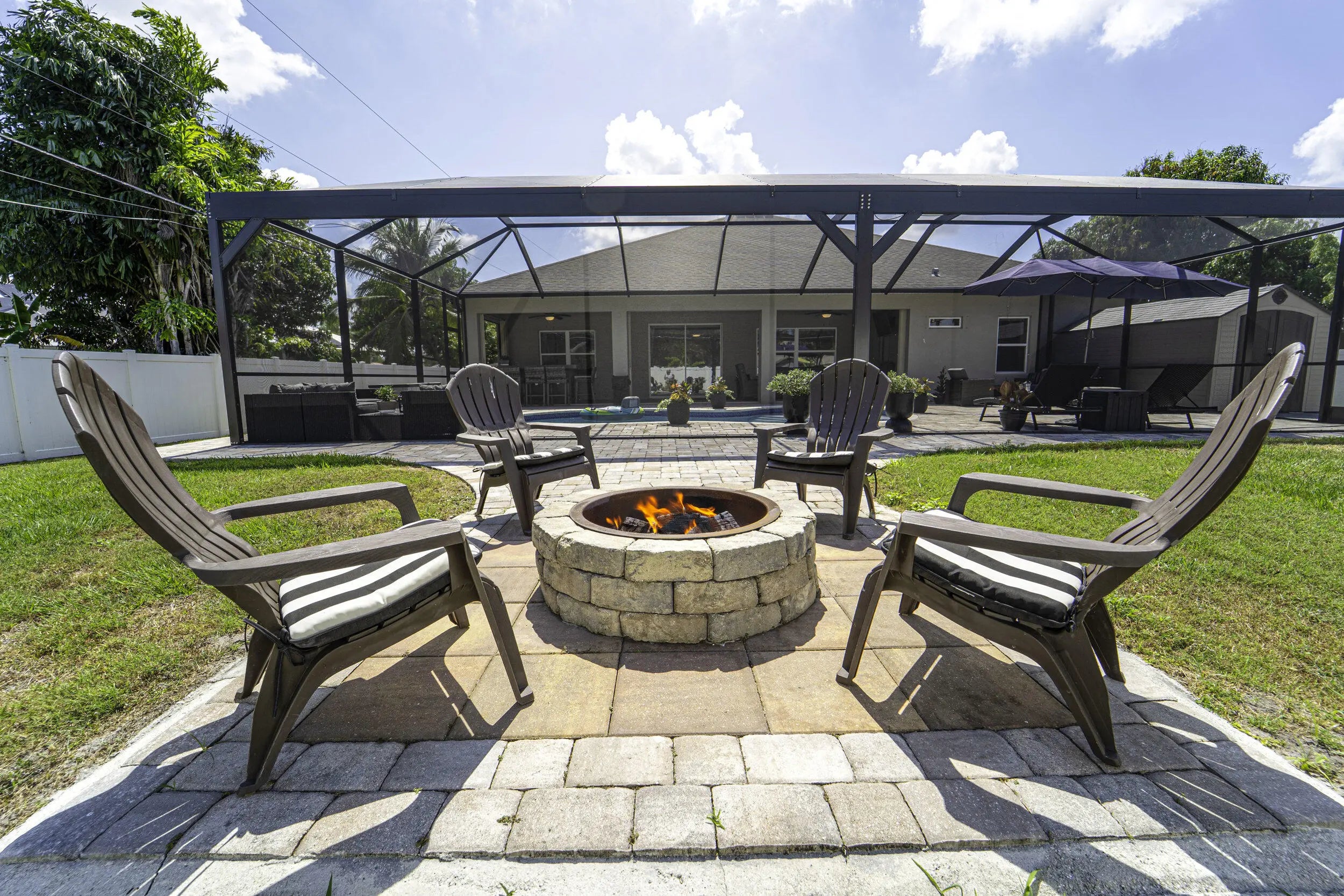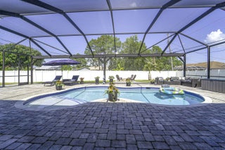 A beautiful Courtyard Pool home w/ Spacious 4 bedrooms + Den, 3 full baths, 3 car garage, salt water heated Pool, CBS home that perfectly blends comfort, style, and functionality with NO HOA. Nestled in a desirable neighborhood, this property boasts an open and inviting floor plan ideal for both everyday living and entertaining. Step inside to find a light-filled interior featuring 11 ft high ceilings with Crown molding, Tray ceilings, and classic wall paneling accents throughout, a generous Great Room, and a thoughtfully designed Gourmet kitchen with 11 ft wide Island w/ double wall oven, ample 42''cabinetry and counter space and upgraded backsplash. The primary suite offers a deluxe bathroom that includes an oversized shower, soaking tub, his and her sinks, and 2 large walk-in close while the additional bedrooms 2, 3, and 4 will offer large footprints for your family to grow with the home, all bedrooms will feature walk-in closets and share 2 conveniently located bathrooms, home also features a flex room that can be a 5th bedroom, office/den living room space provide plenty of space for family, guests, or a home office. Outside, enjoy your own private oasis with a sparkling in-ground pool, perfect for relaxing or hosting summer gatherings. The 3-car garage offers abundant storage and parking, a rare and valuable feature. Other features included are solar panels, extra large shed, accordion storm shutters, pavered front and back yard in and around the screened enclosure leading to a Welcoming custom built stone fire pit.