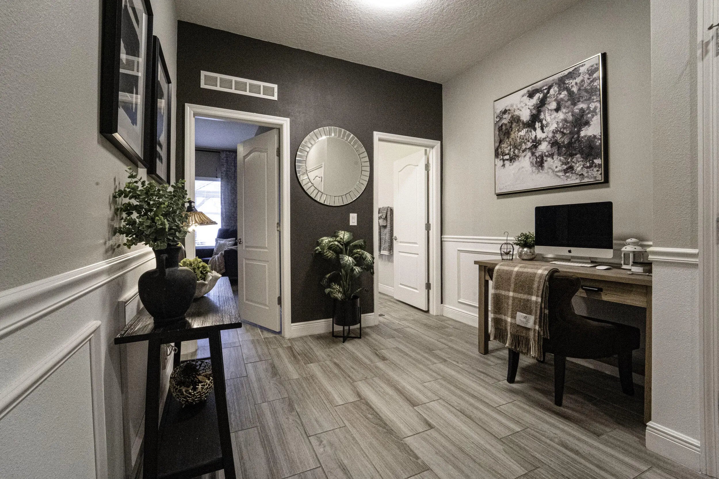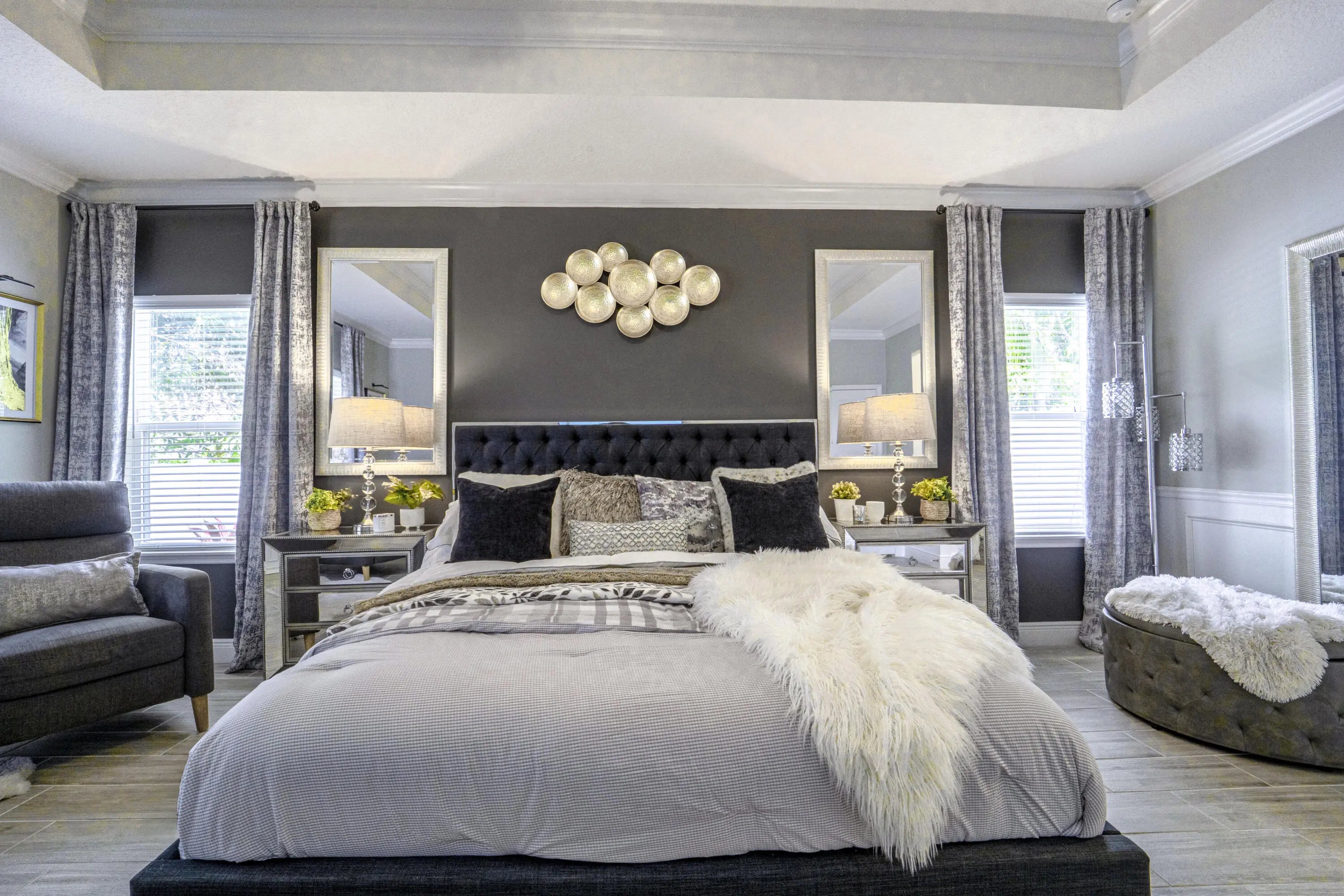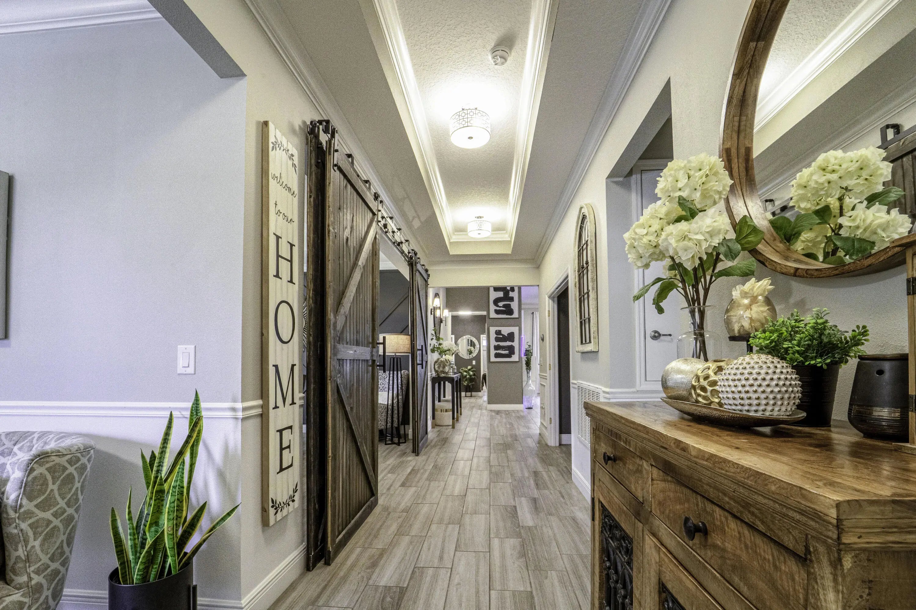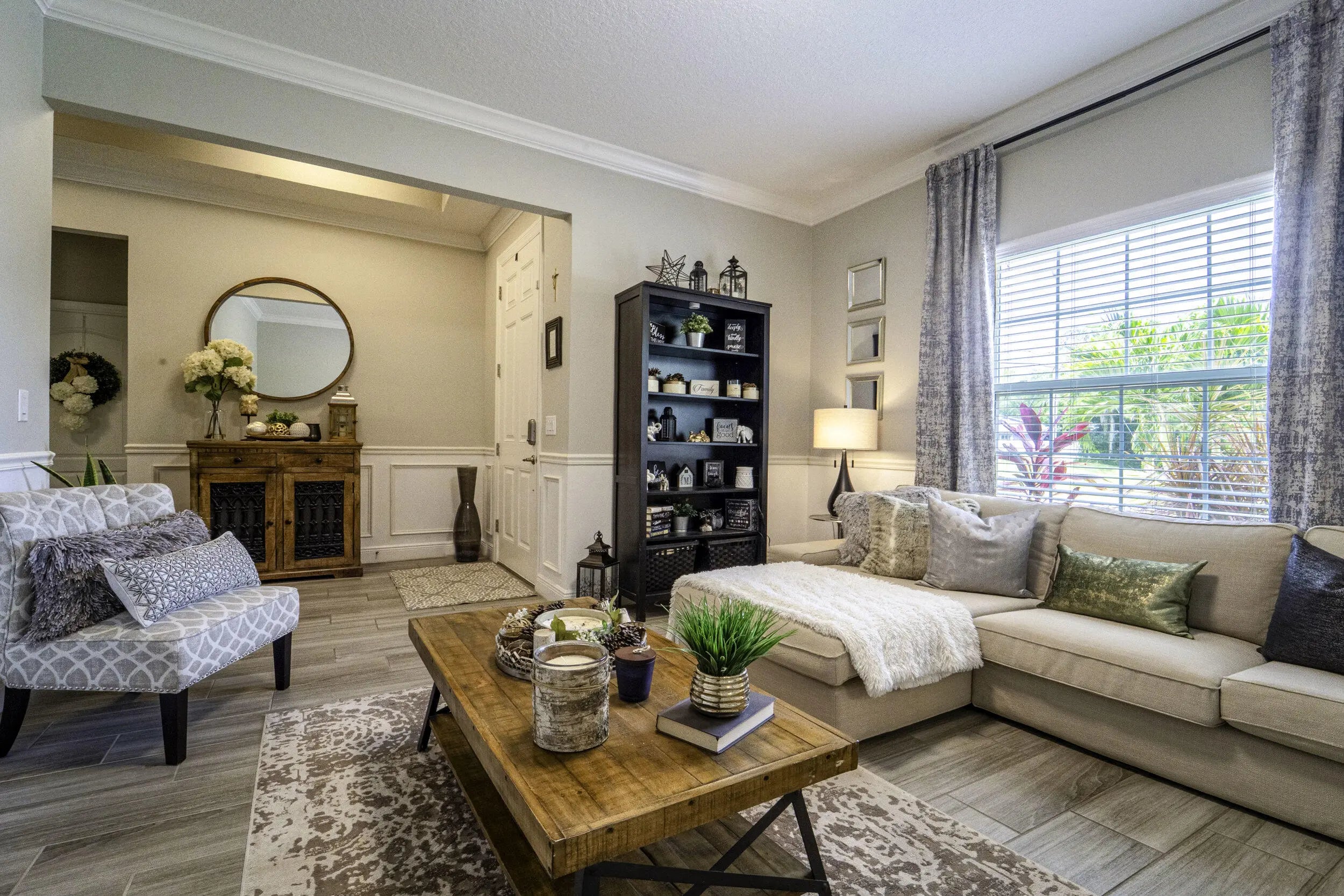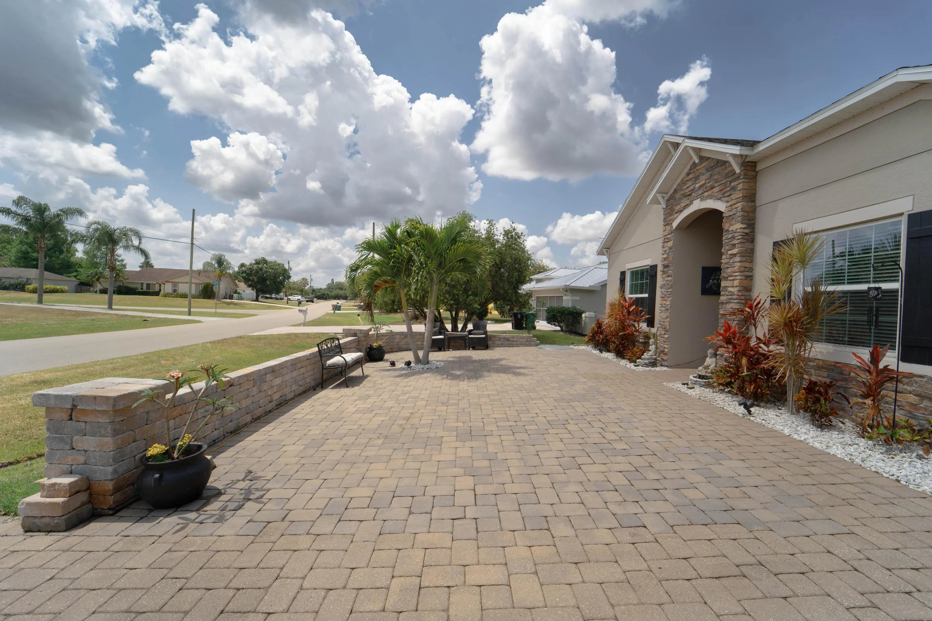 A beautiful Courtyard Pool home w/ Spacious 4 bedrooms + Den, 3 full baths, 3 car garage, salt water heated Pool, CBS home that perfectly blends comfort, style, and functionality with NO HOA. Nestled in a desirable neighborhood, this property boasts an open and inviting floor plan ideal for both everyday living and entertaining. Step inside to find a light-filled interior featuring 11 ft high ceilings with Crown molding, Tray ceilings, and classic wall paneling accents throughout, a generous Great Room, and a thoughtfully designed Gourmet kitchen with 11 ft wide Island w/ double wall oven, ample 42''cabinetry and counter space and upgraded backsplash. The primary suite offers a deluxe bathroom that includes an oversized shower, soaking tub, his and her sinks, and 2 large walk-in close while the additional bedrooms 2, 3, and 4 will offer large footprints for your family to grow with the home, all bedrooms will feature walk-in closets and share 2 conveniently located bathrooms, home also features a flex room that can be a 5th bedroom, office/den living room space provide plenty of space for family, guests, or a home office. Outside, enjoy your own private oasis with a sparkling in-ground pool, perfect for relaxing or hosting summer gatherings. The 3-car garage offers abundant storage and parking, a rare and valuable feature. Other features included are solar panels, extra large shed, accordion storm shutters, pavered front and back yard in and around the screened enclosure leading to a Welcoming custom built stone fire pit.
