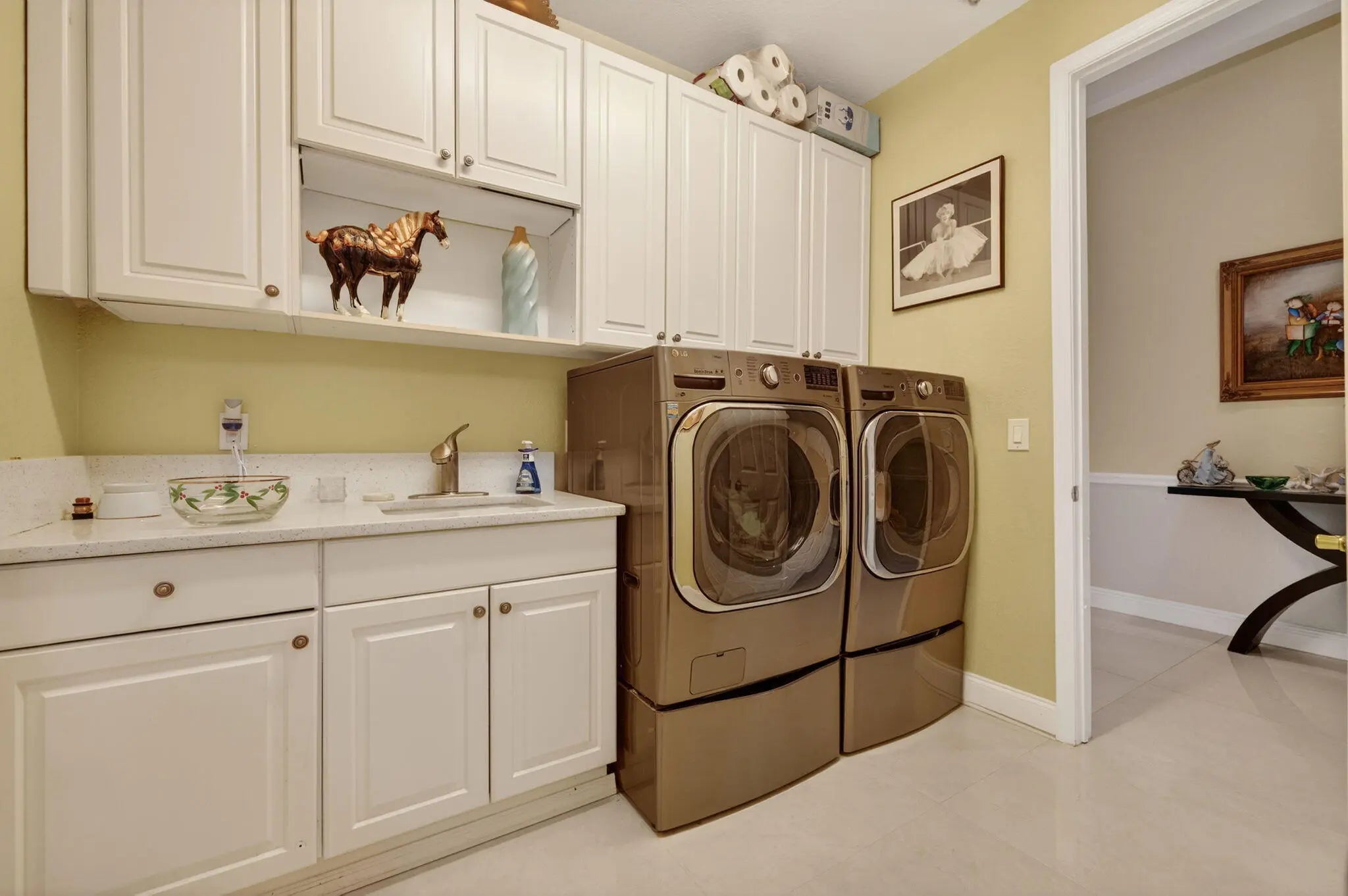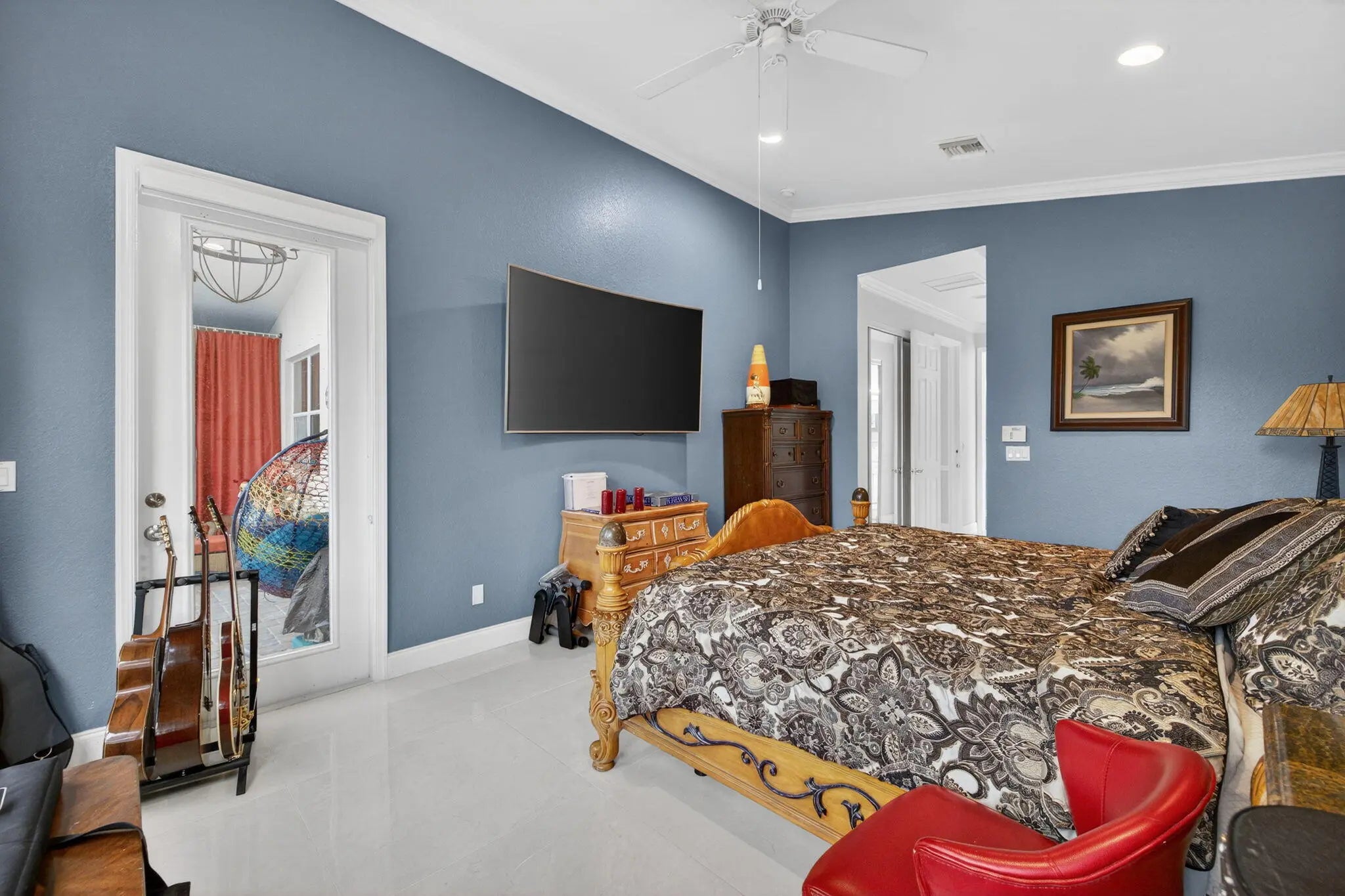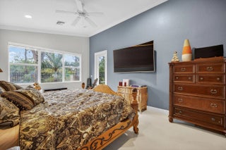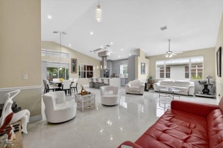 Refined, turn key residence in the gated community of Portofino Isles, offering a true split plan layout and dramatic vaulted ceilings that enhance light and scale throughout. The custom kitchen is designed for both form and function, featuring oversized 31 x 31 Italian porcelain tile, bespoke soft close cabinetry in a modern gray blue finish, white granite countertops, double wall ovens, stainless steel appliances, and a striking designer range hood. Custom zebra window treatments are installed throughout the home. The expansive primary suite offers two walk in closets and a spa inspired bath with soaking tub and separate shower. Enclosed patio ideal for enjoying Florida's year round lifestyle. Low HOA fees include clubhouse, pool, fitness center, tennis courts, and playground
