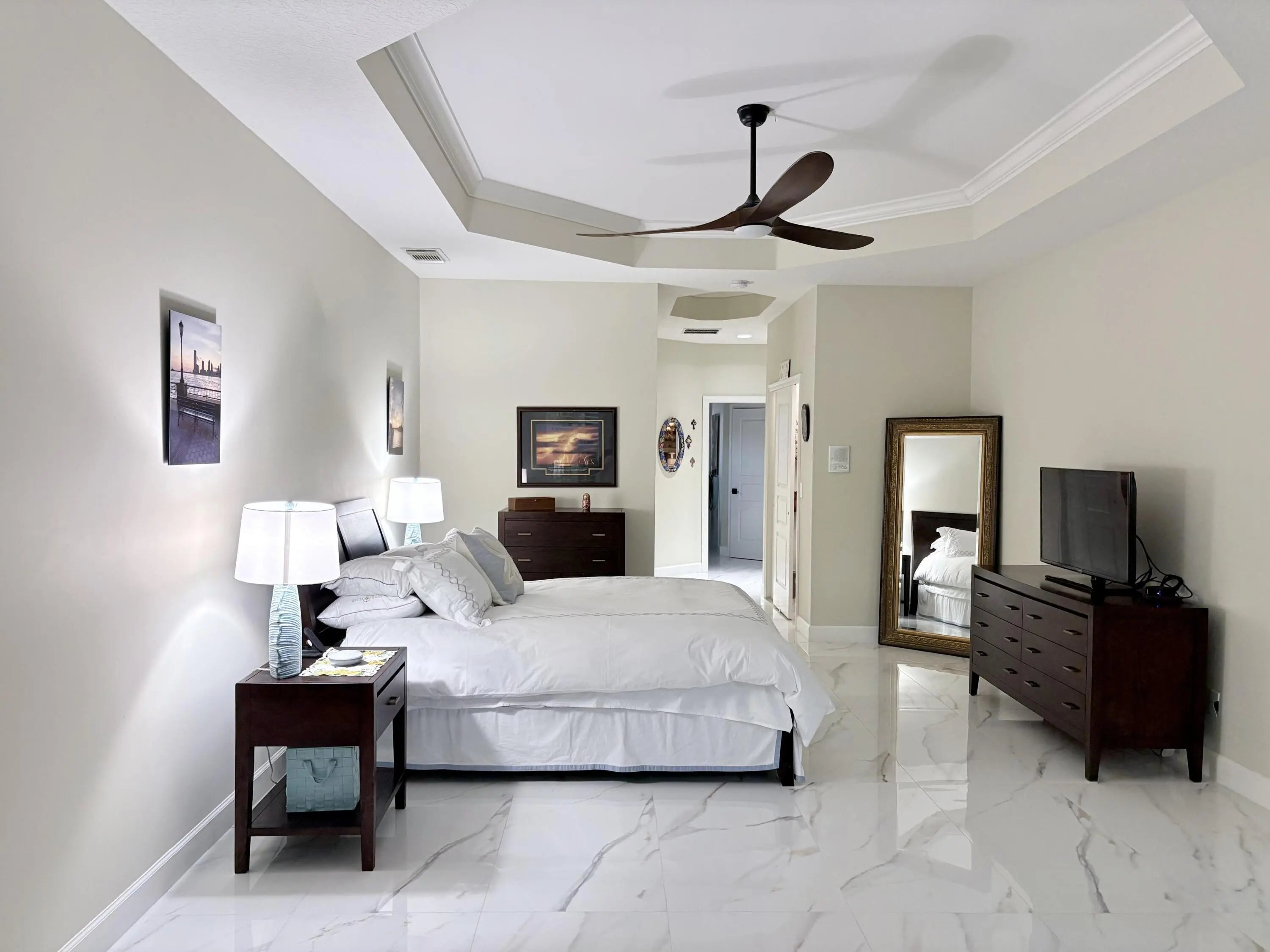 Updated 4BR/3BA home with 3-car garage in the gated community of The Vineyards in Port St Lucie, on a quiet cul-de-sac with preserve views. Travertine entry and double impact-rated glass doors welcome you inside. Formal living and dining areas open to sliding glass doors leading to outdoor space. Remodeled kitchen features custom inset cabinetry, quartzite countertops, new appliances, and a Signature 36-in counter-depth refrigerator. Bar area with matching inset cabinetry and quartzite counters. Tile floors throughout, including primary suite with 2'x4' porcelain tile, dual closets, and renovated bath. Updated baths, PGT impact windows, impact-rated doors, new AC units, fresh paint, and laundry with front-load washer and dryer. Minutes to I-95 and US-1.
