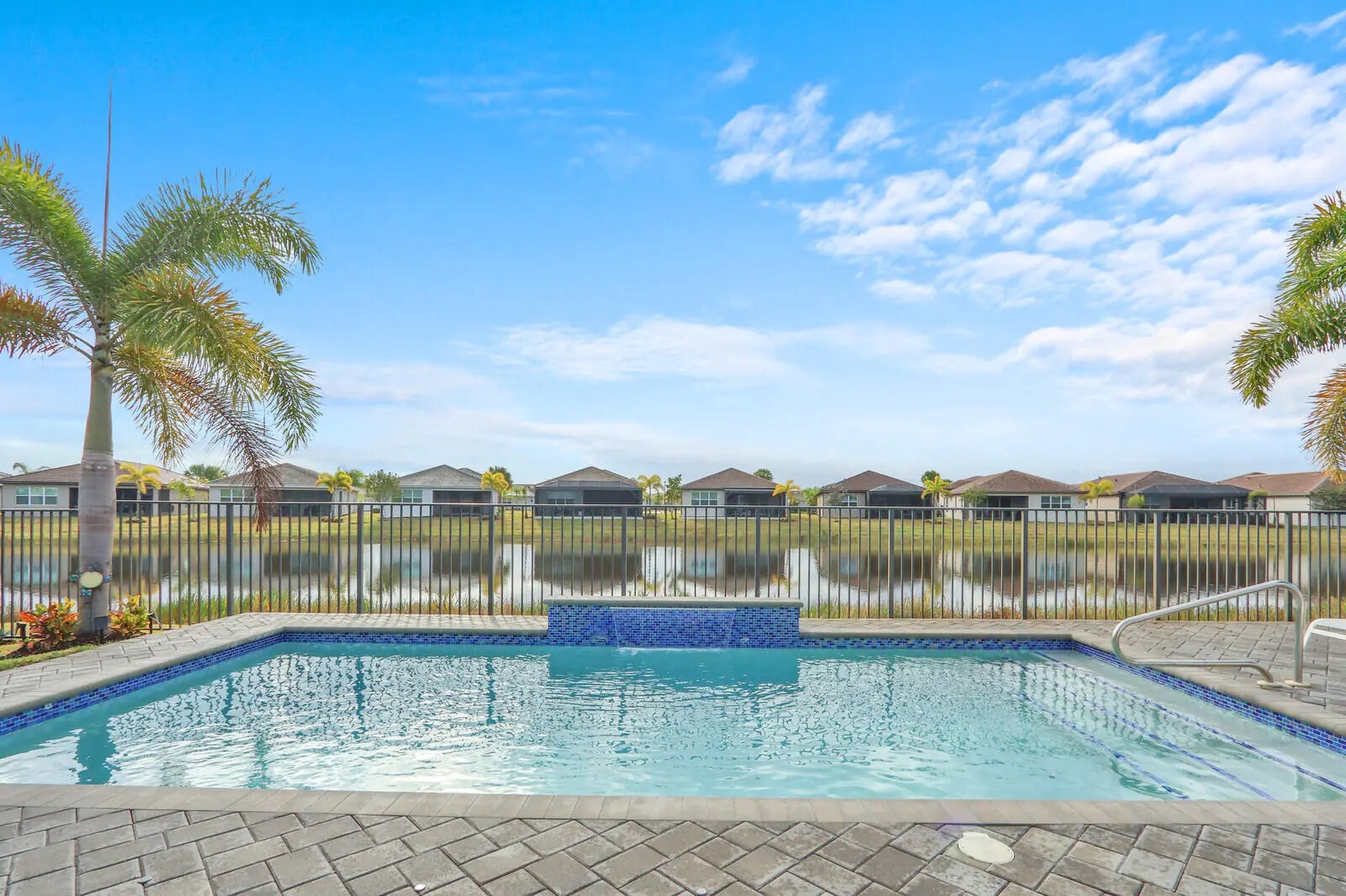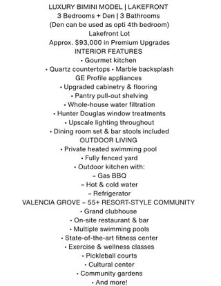 This Luxury Bimini Model is a 3-bedroom, 3-bath home with a den (optional 4th bedroom) on a desirable lakefront lot. The home features a gourmet kitchen with quartz countertops, marble backsplash, upgraded cabinetry and flooring, and pantry pull-outs. Enjoy a private heated swimming pool, fenced yard, and an outdoor kitchen complete with a gas BBQ, hot/cold water, and a refrigerator. Additional highlights include whole-house water filtration, custom closets, Hunter Douglas window treatments, upscale lighting, and an included dining room set and bar stools. Valencia Grove is an active, resort-style community for over-55s. Amenities include a clubhouse, restaurant/bar, multiple pools, fitness center, exercise classes, pickleball, cultural center, community gardens, and more--virtually