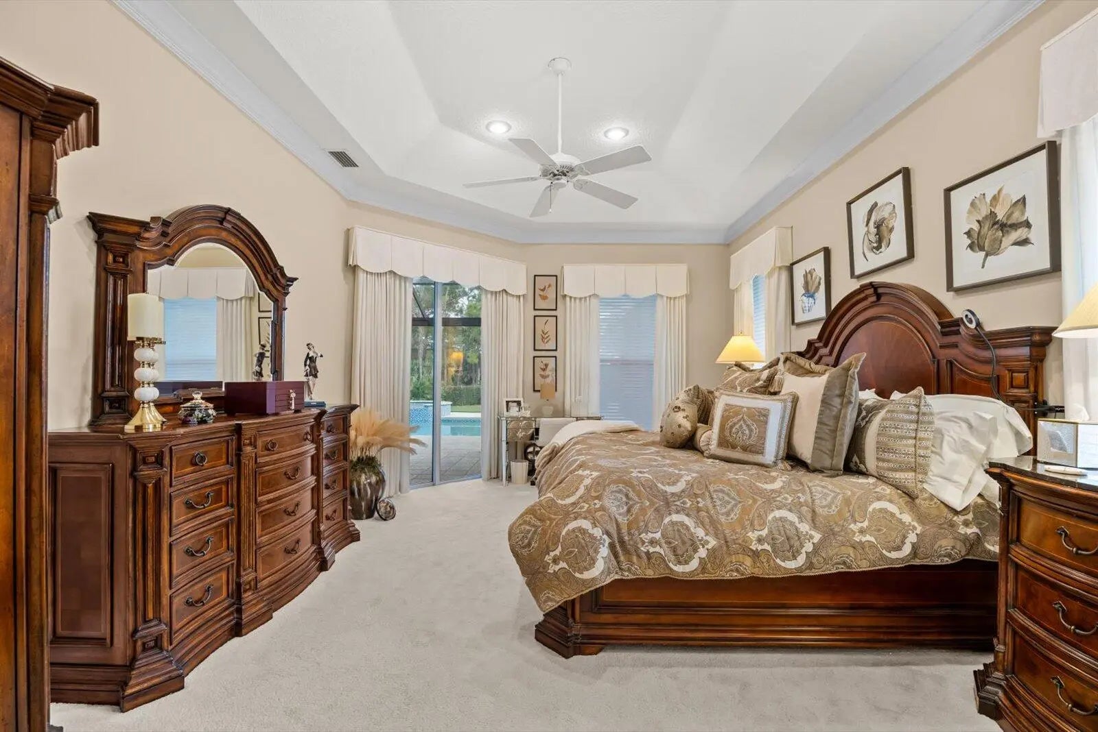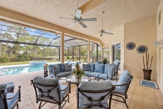A true golfer's paradise, perfectly positioned on the 5th hole of the Ryder Course in prestigious PGA Village. Located in the desirable Reserve Plantation, this timeless residence embodies classic elegance with soaring ceilings, two spacious primary suites, and an office featuring rich custom wood built-ins with desk, cabinetry, and bookshelves. Meticulously cared for, the home offers a newer pool (2023) with cabana bath, creating an exceptional indoor-outdoor lifestyle. Get lost on the expansive pool deck with generous seating areas overlooking the manicured fairway. The kitchen is equipped with a Bosch wall oven, built-in microwave, and range. Additional upgrades include a brand-new A/C system, along with a roof and gutters replaced in 2020. Furniture is available for purchase, presenting an outstanding opportunity for a turnkey, golf course retreat.