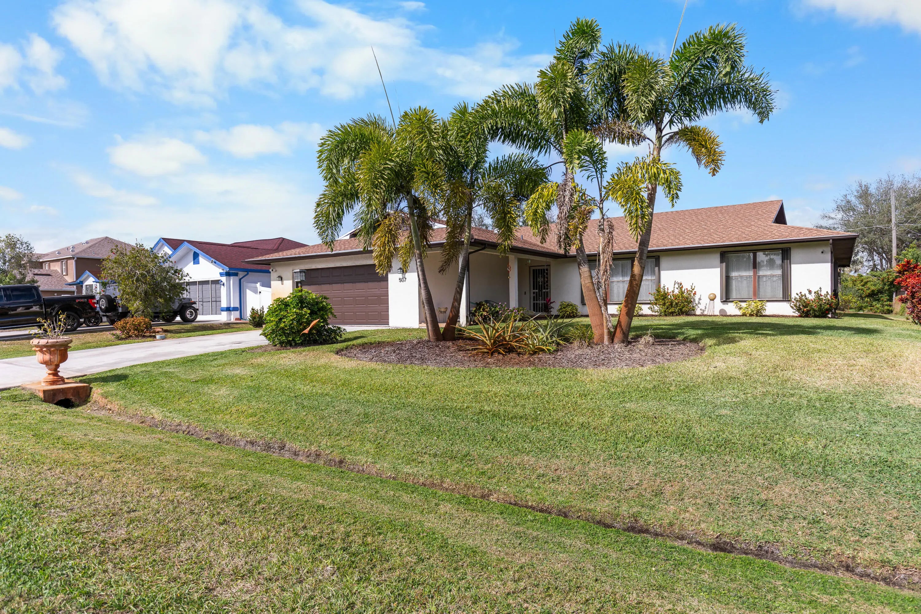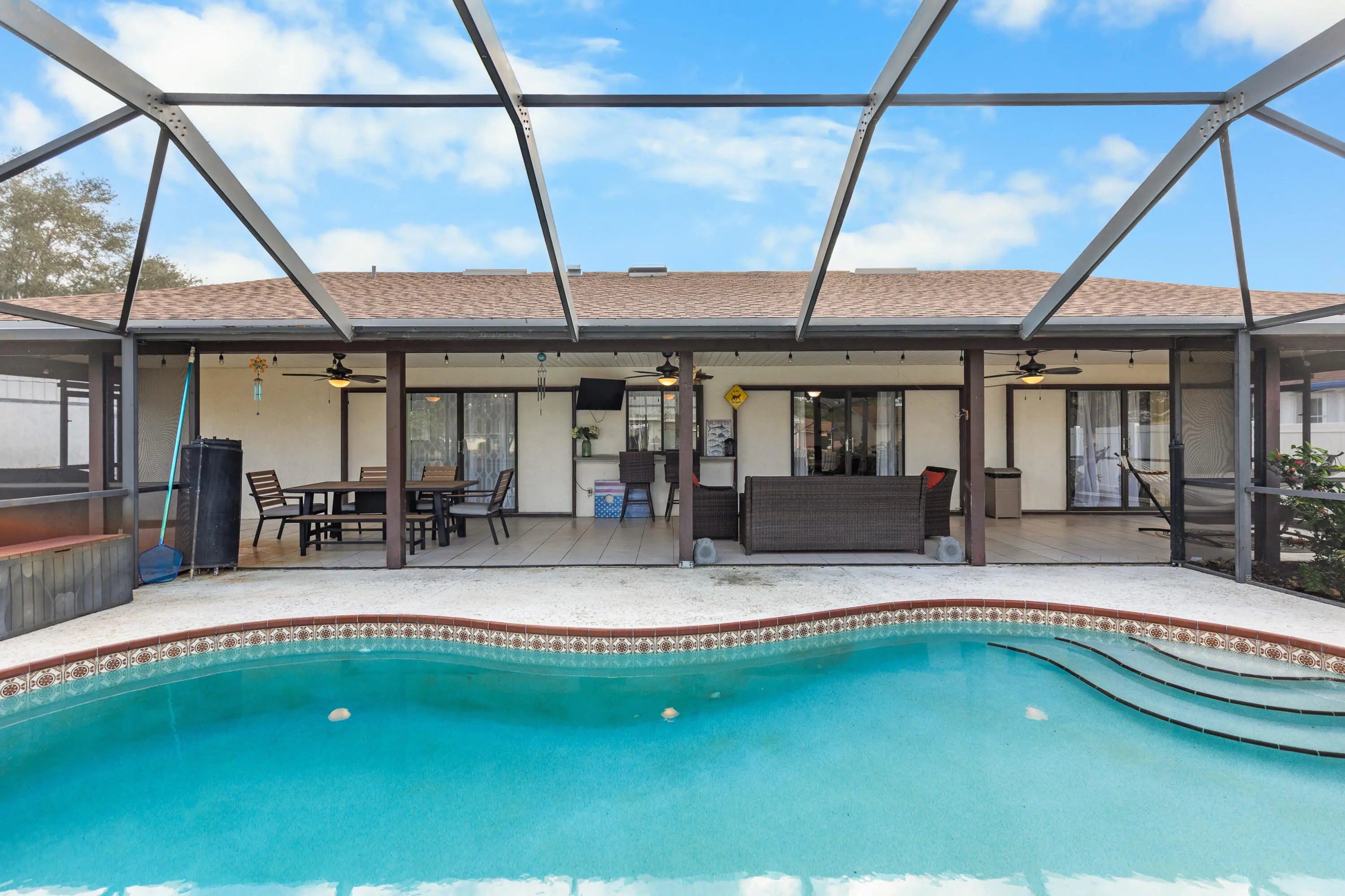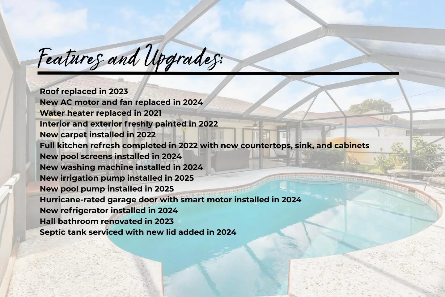 Step into this beautiful CBS (Concrete Block Stucco) Pool Home with NO HOA - park your RV, boat, or toys wherever you would like! Miss the rain while bringing in the groceries under the large covered front porch, and end the night relaxing under the oversized back patio watching the game or taking a dip in the screened in pool! Meticulously cared for, the list of new features is endless: 2023 ROOF, 2024 new AC motor & fan, 2021 WH, 2022 freshly painted, 2022 new carpet, 2022 full kitchen refresh with new counters, sink, and cabinets, 2024 new pool screens, 2024 new washing machine, 2025 irrigation pump, 2025 pool pump, and more. Schedule your own private tour to see this spacious and functional home, perfect for entertaining and living!