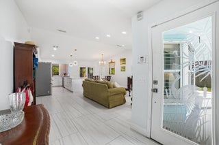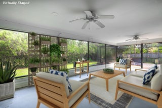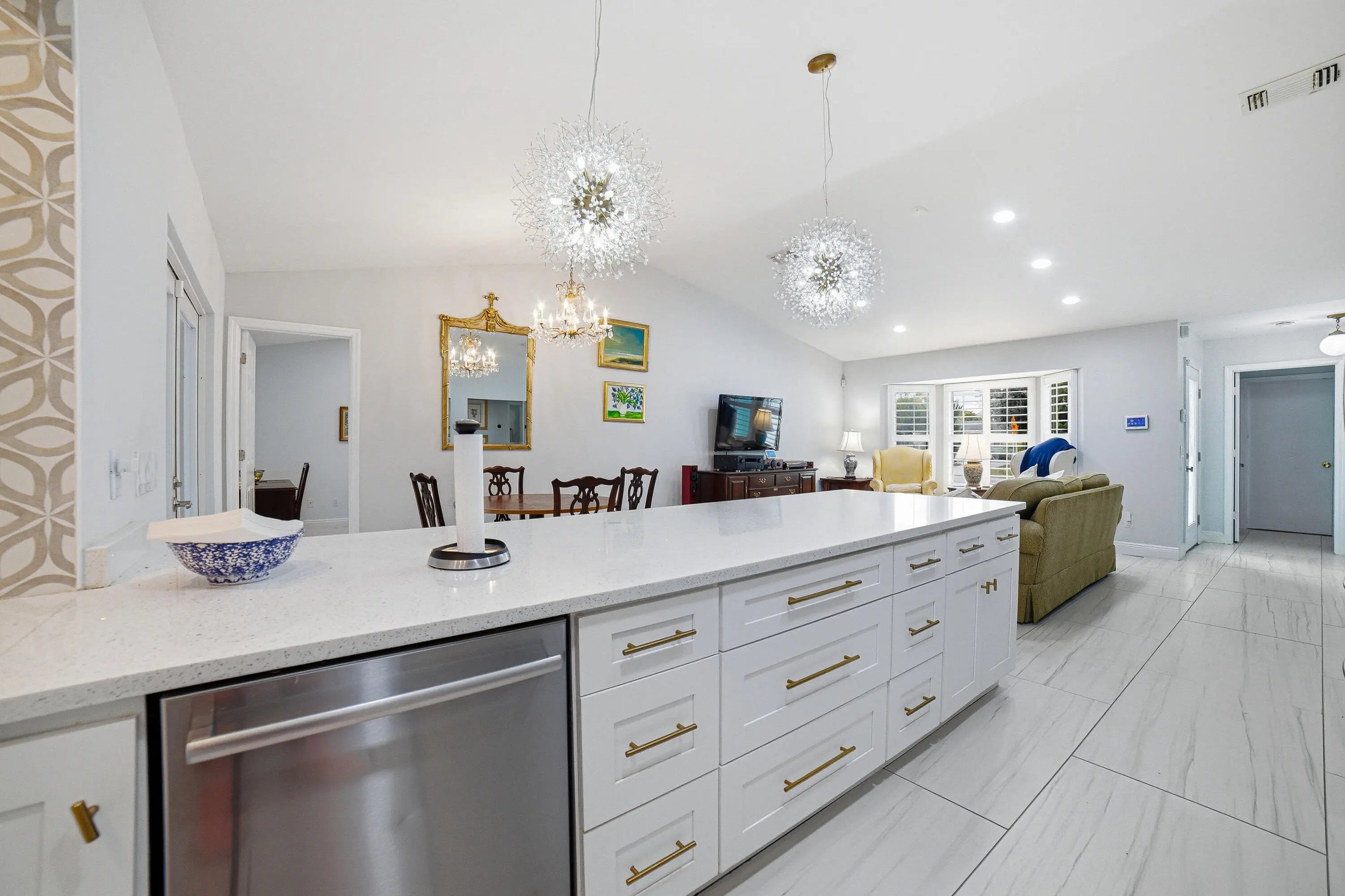 Beautifully Updated Home Designer Kitchen & Large Screened Patio An exceptional move-in-ready home offering a bright open-concept layout, stylish finishes, and exceptional indoor-outdoor living. Enjoy peace of mind with a 2023 roof, 2023 A/C, and newer garage door—providing long-term value and low maintenance.The heart of the home is the stunning chef's kitchen, featuring crisp white cabinetry, quartz countertops, stainless steel appliances, decorative tile backsplash, elegant gold hardware, and an oversized island—perfect for casual dining and entertaining. The kitchen flows seamlessly into the spacious living and dining areas, enhanced by recessed lighting, designer pendant fixtures, and sleek tile flooring. New Roof & A/C in 2023