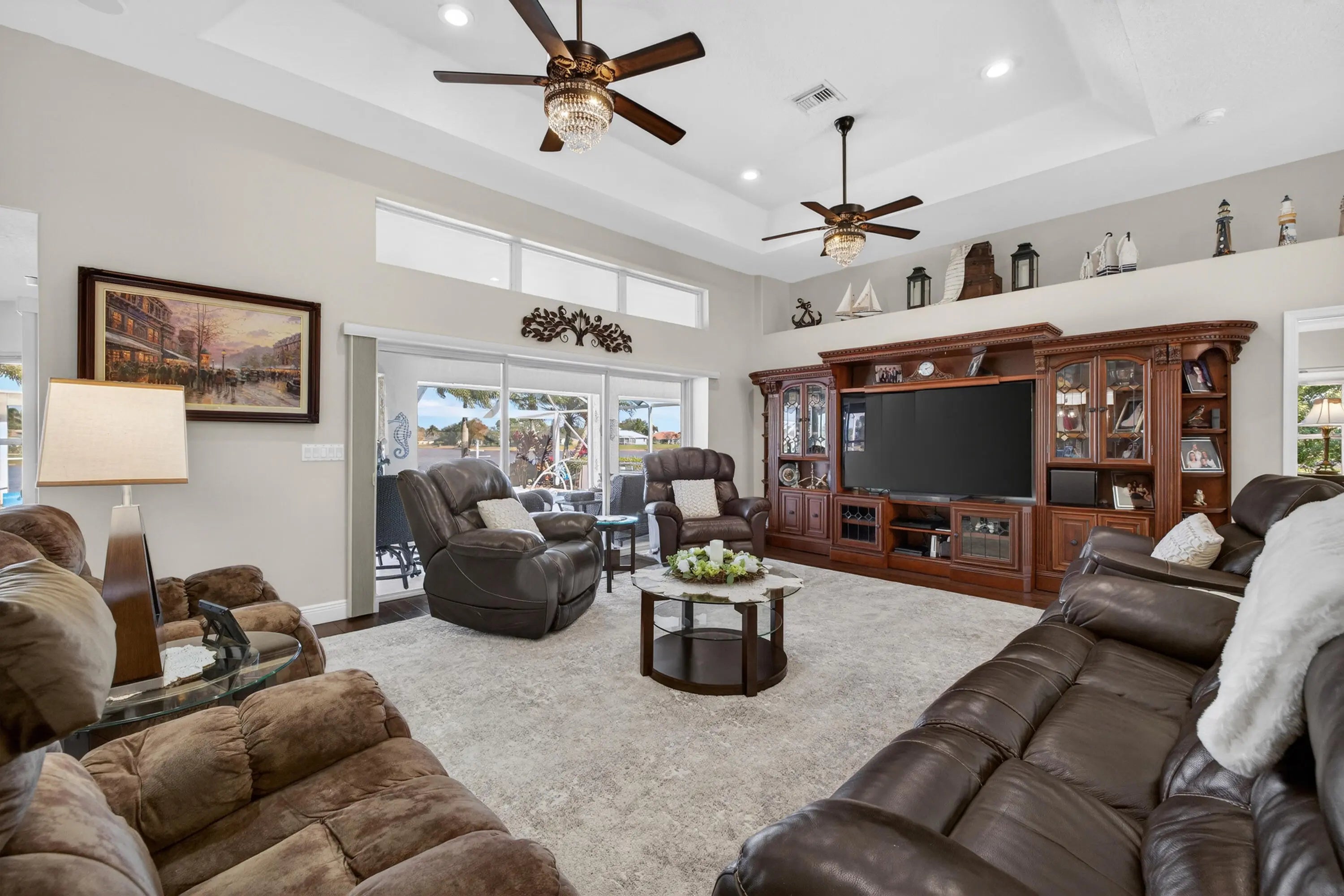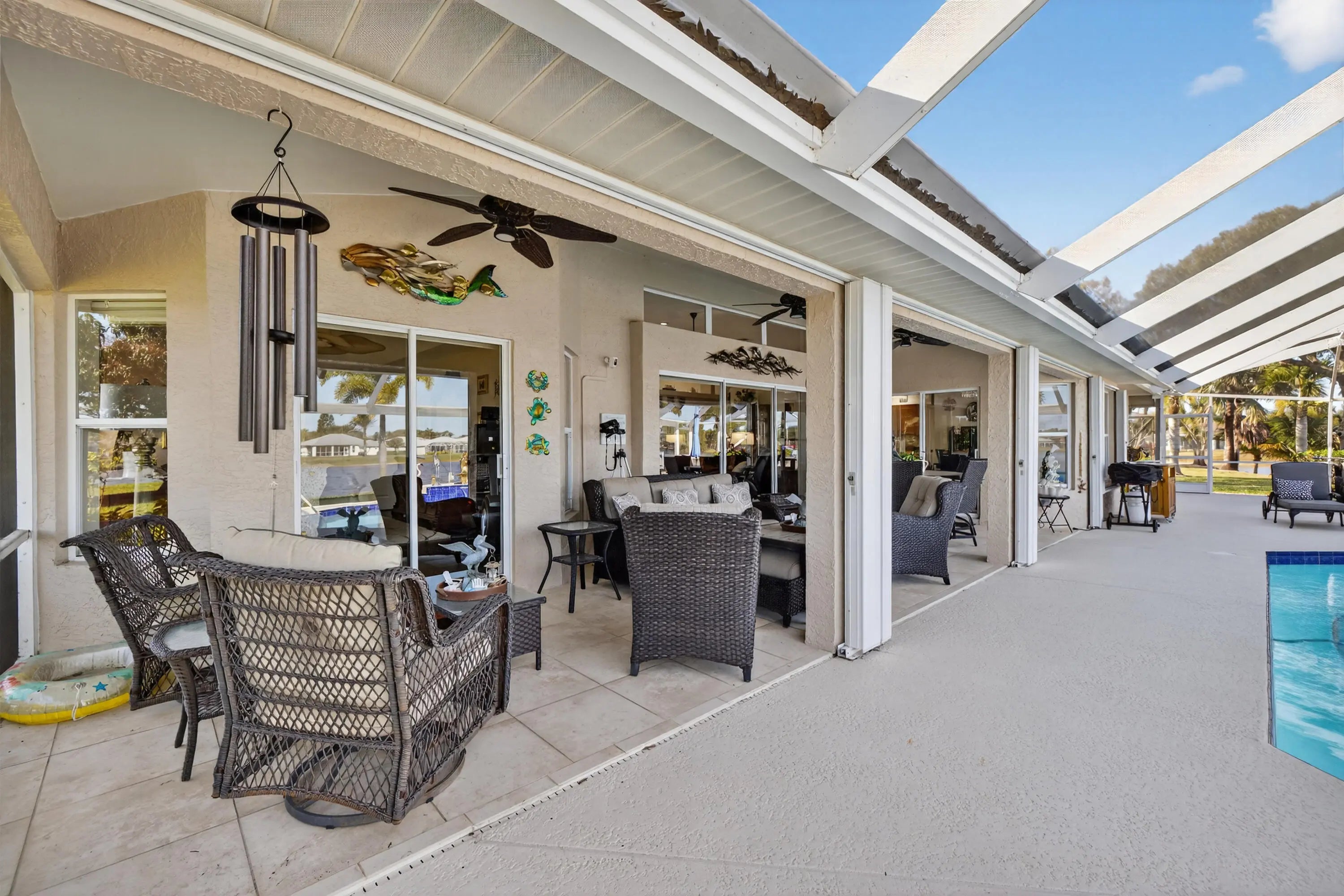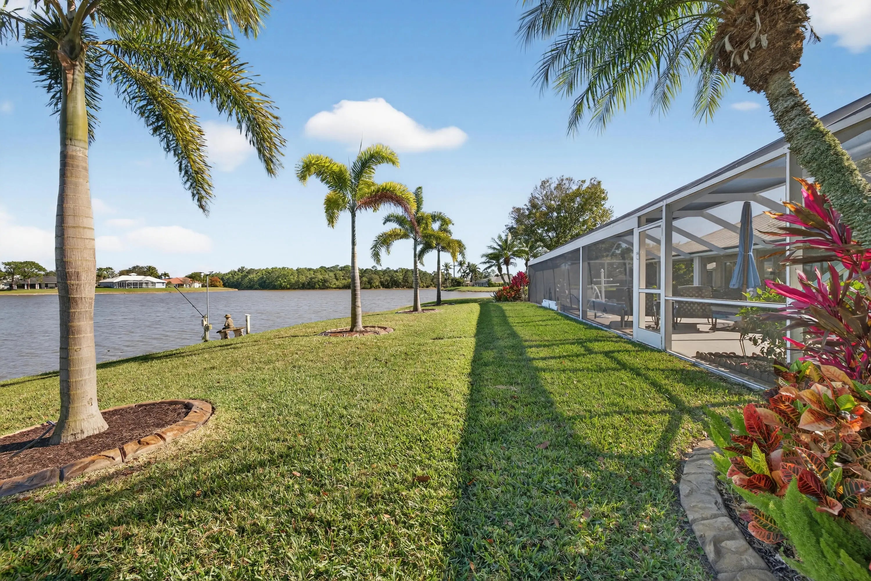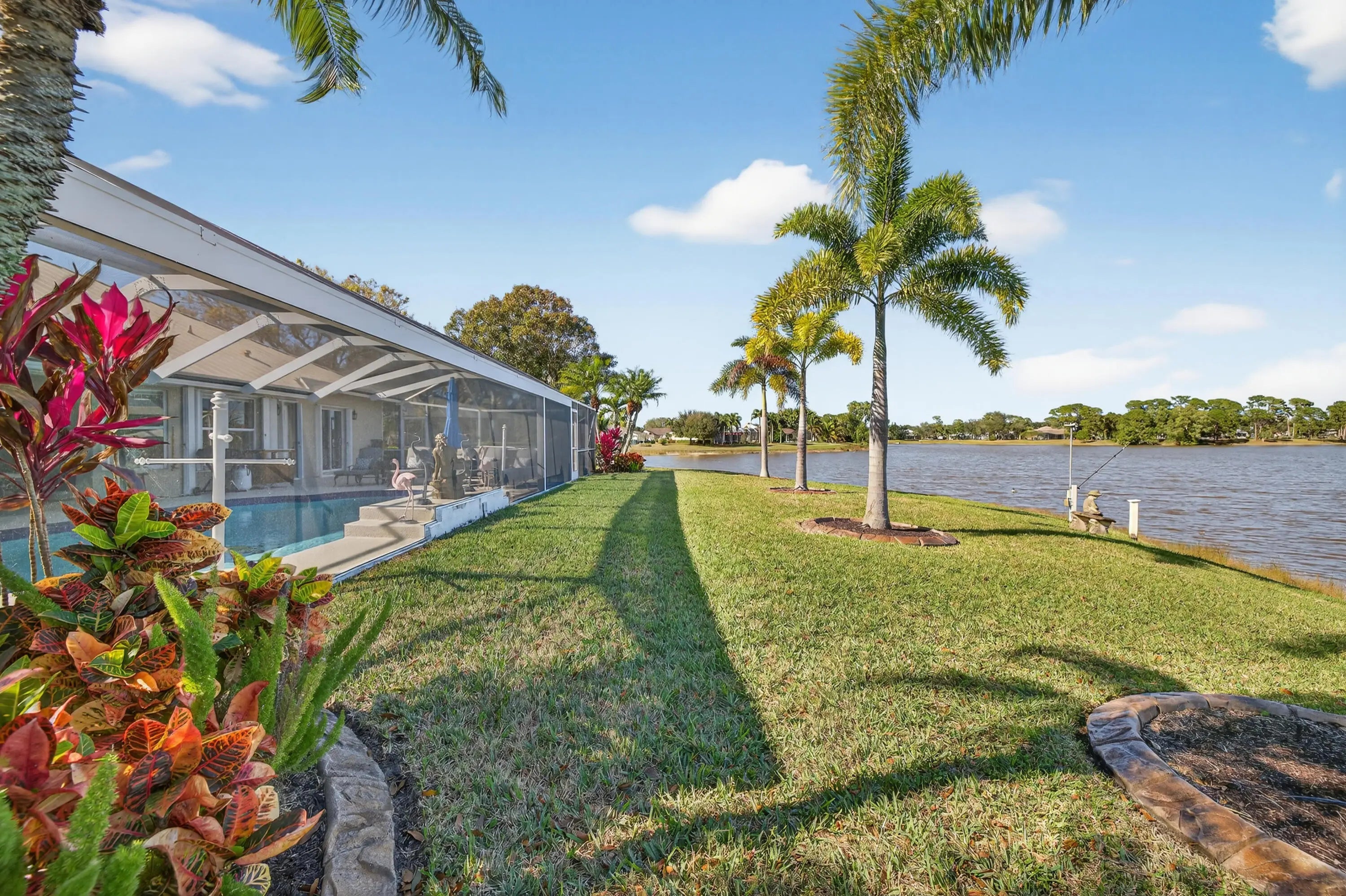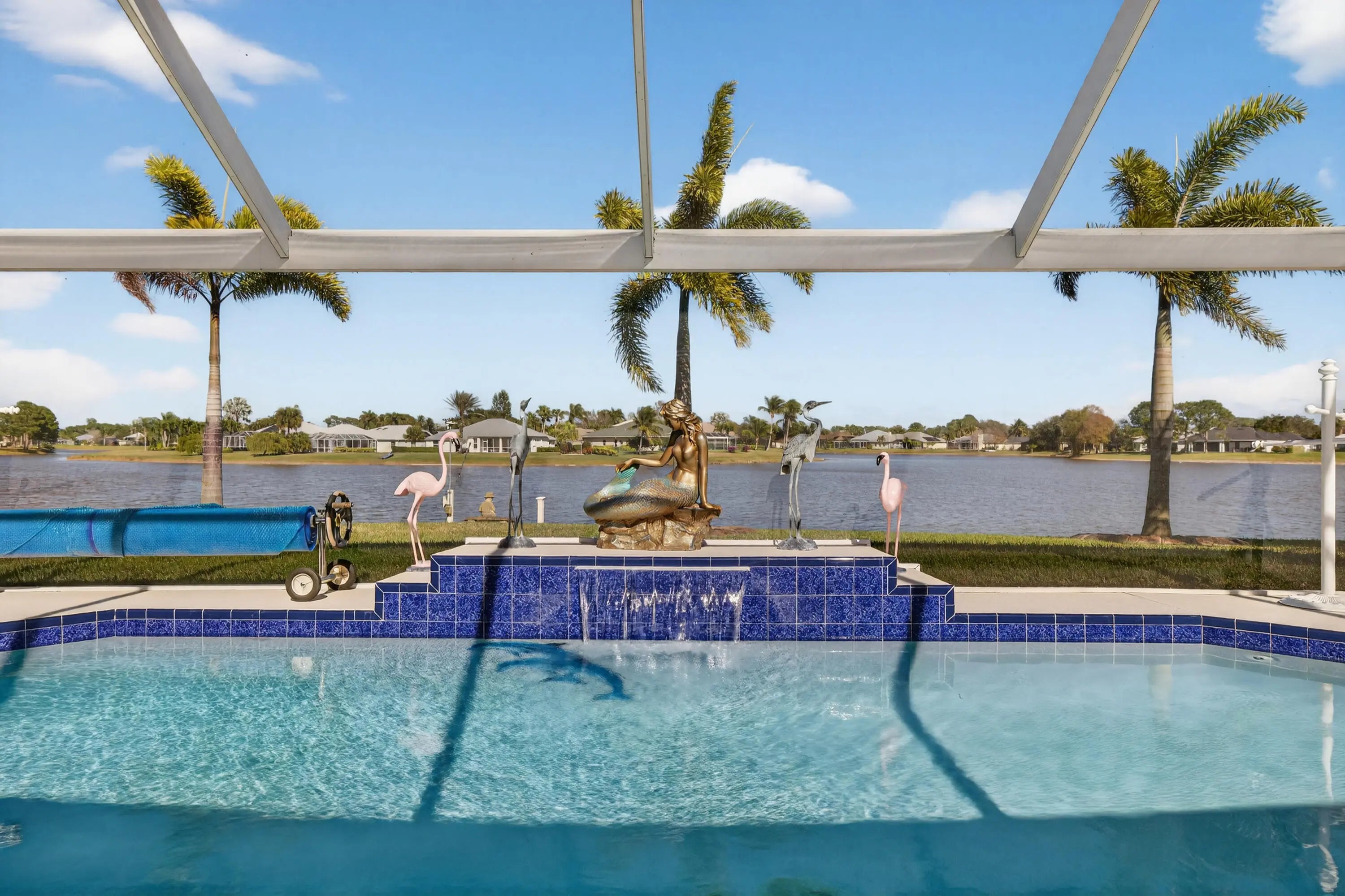 Welcome to your own lakeside sanctuary, where every day feels like a getaway. Nestled at the end of a quiet cul-de-sac, this beautifully upgraded 1-story, 3-bedroom + den/office home offers the perfect balance of comfort, style, and Florida charm, all set on a rare ½-acre lakefront lot with panoramic water views. Step inside to discover light-filled living spaces with thoughtful updates throughout, including a brand-new spa-inspired primary bath with soaking tub, towel warmer, and separate shower. The open-concept layout flows effortlessly from the great room (featuring elegant tray ceilings) to the sleek, upgraded kitchen complete with Samsung satin steel appliances, granite countertops, double oven, solid oak cabinetry, and a trash compactor. Hosting is a breeze with sliding pocket doors that open fully to a freshly resurfaced cool-deck patio and a sparkling heated saltwater pool, recently refinished with new tile and enhanced with panorama screens for unobstructed lake views. A convenient poolside half-bath adds function to the fun. Additional highlights include: Den/office with Murphy bed for flexible guest space Oversized 2-car garage with storage cabinets and attic access New metal roof (2017) Honda Generator Lush custom landscaping and exterior lighting Concrete block construction for lasting peace of mind Freezer in Garage Stays Accordion Shutters Throughout Heated Salt Water Pool Pool Resurfaced including new Tile Patio Enclosure re-screened and painted New Samsung Satin Stainless Appliances Custom Closet Organizers New Hurricane Proof Mahogany Front Door New Ceiling Fans and Lighting Laundry Room Upgraded with Cabinets and Sink Resurfaced Driveway 6" Baseboards Throughout Solid Oak Cabinets in Kitchen Premium 1/2 Acre Waterfront Lot Home Warranty Located in a private gated community with scenic water views and storage area for your RV or Boat. This home isn't just a place to live, it's a place to thrive. Whether you're sipping morning coffee by the lake, entertaining poolside, or simply enjoying the serenity of your surroundings, this home delivers a lifestyle that's as elevated as it is effortless.