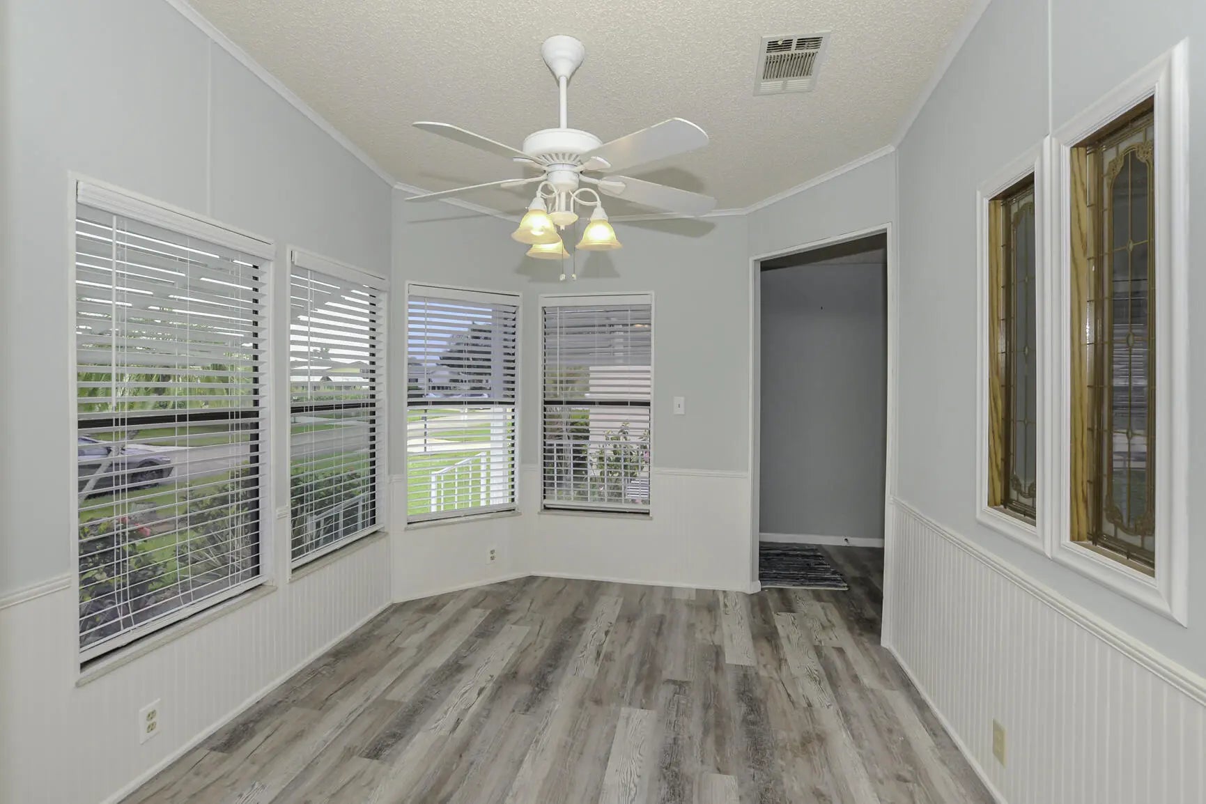 SEASON FINALE PRICE IMPROVEMENT! LAND OWNED & on the Lake! No land lease saves you over $700 per month. This home has new flooring throughout, updated bathrooms, freshly painted on the outside, new vapor barrier, tie-downs, insulation, pipes and ducts. Savanna Club is a resort lifestyle affordable community for Active Adults. Partial list of amenities include golf, tennis, pickleball, horseshoes, shuffleboard, bocce ball, 3 clubhouses, 3 pools, hot tubs, saunas, fitness rooms, playhouse, organized activities and events - you won't be bored. Low HOA fee includes all of this, plus cable, internet , sewer and trash pickup. County only taxes. Make an Offer!