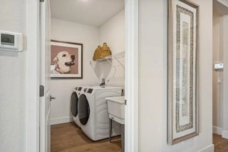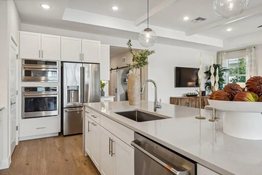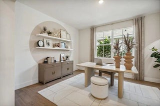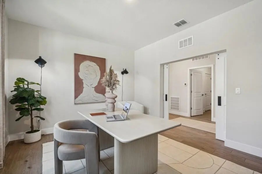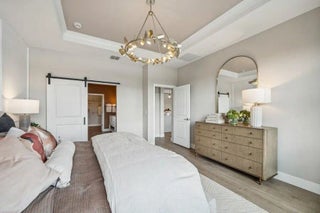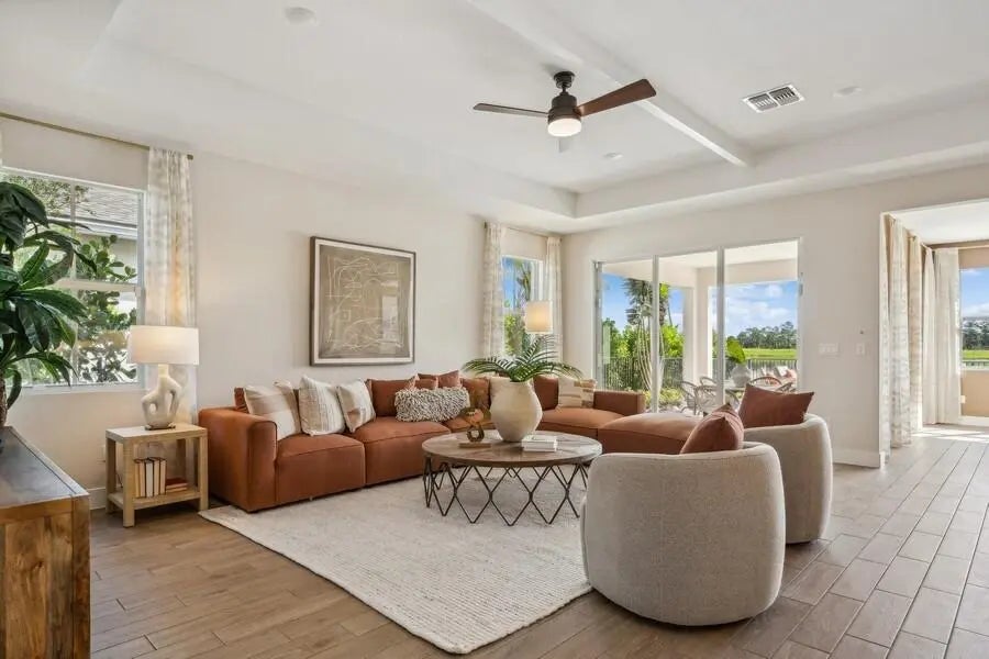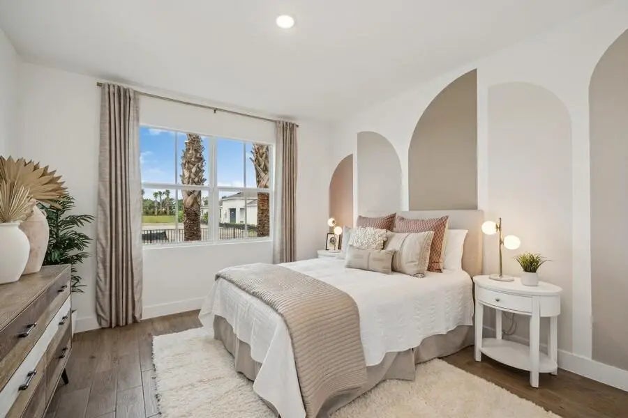 This Kelly model offers stunning water views and a serene backdrop for everyday living. Showcasing a designer-curated Loft look, the home features porcelain wood-look tile throughout and an elegant chef's kitchen with white cabinetry, Statuary Classic quartz countertops, a large island, and a spacious pantry—perfect for entertaining. The spacious great room includes sliding doors that open to a beautiful covered patio, creating seamless indoor-outdoor living. A private home office provides a quiet space for working from home. The luxurious primary suite features triple windows that fill the space with natural light, while the relaxing primary bath offers a spacious shower and walk-in closet. The covered patio is ideal for outdoor entertaining while enjoying peaceful lake views.