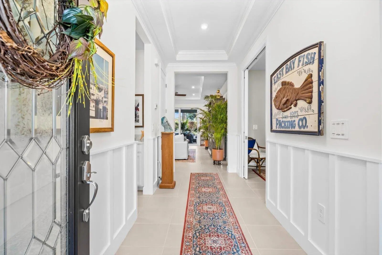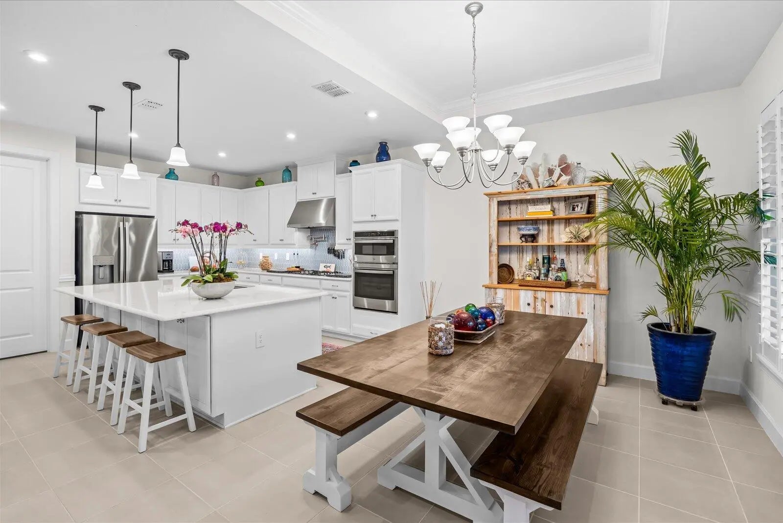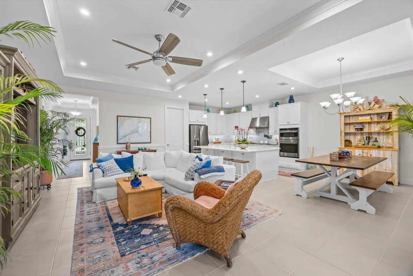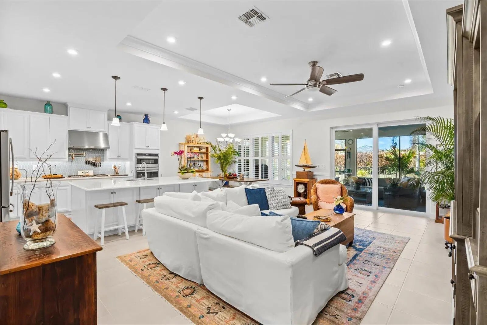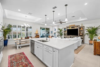 Built 2021 | 2 Bedroom, 2 Bathroom + Den Home in Tradition. This well-maintained home offers a clean, modern layout and excellent condition throughout. Tile flooring with no carpet, plantation shutters, tray ceilings with crown molding, board and batten accents, and custom painted to create a polished, low-maintenance interior. The open-concept kitchen features quartz countertops, stainless steel appliances, gas cooktop with a pot filler, wall oven and microwave, and a large center island ideal for everyday living and entertaining. The primary suite is spacious and well appointed, complemented by a comfortable guest bedroom and a versatile den with custom built-in bookcase and desk. An extended screened lanai enhances indoor-outdoor living and includes two natural gas hookups for future outdoor cooking. The fully fenced, tropical landscaped backyard offers privacy and room for a pool. Additional features include impact windows and doors, epoxy-coated garage flooring, and an outdoor generator hookup. Located in the Tradition area of Port St. Lucie, residents enjoy access to resort-style amenities, a modern clubhouse, and an active lifestyle within a 55+ community. Showing by appointment only.