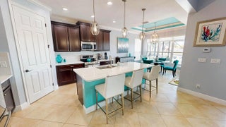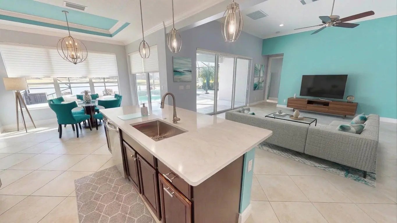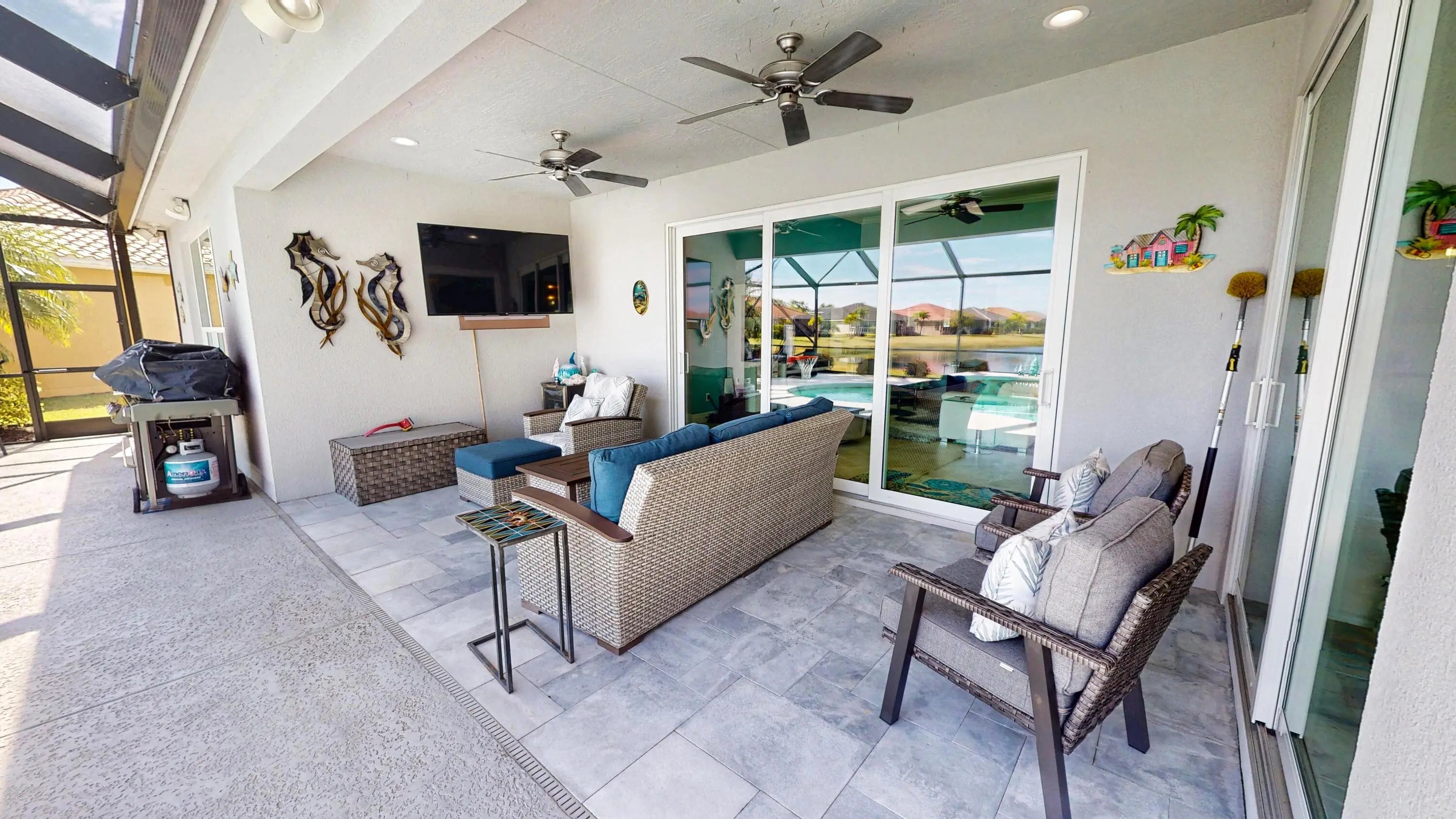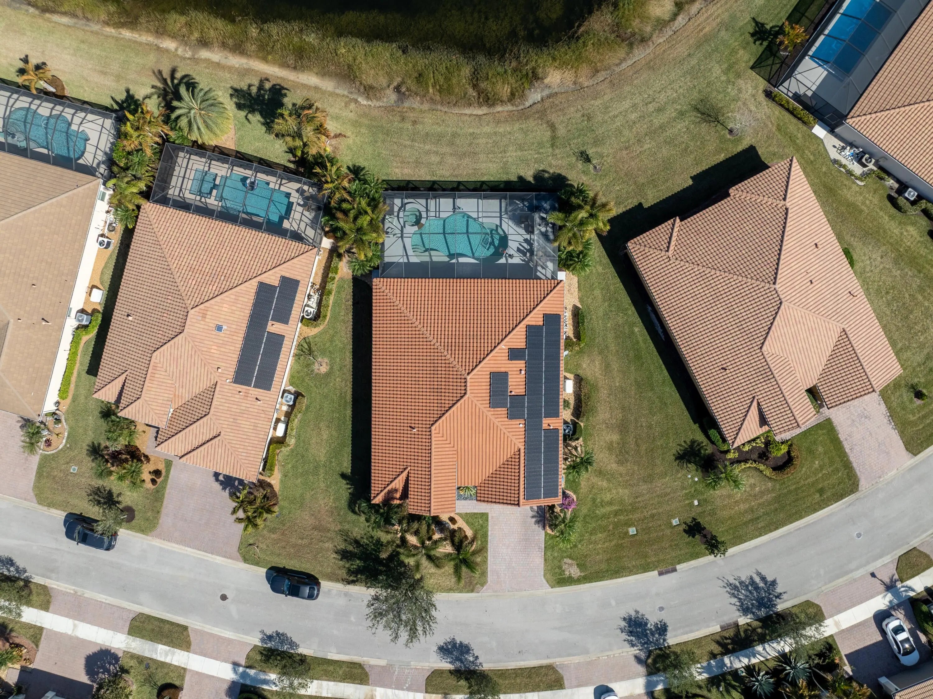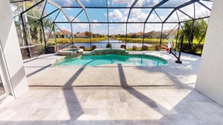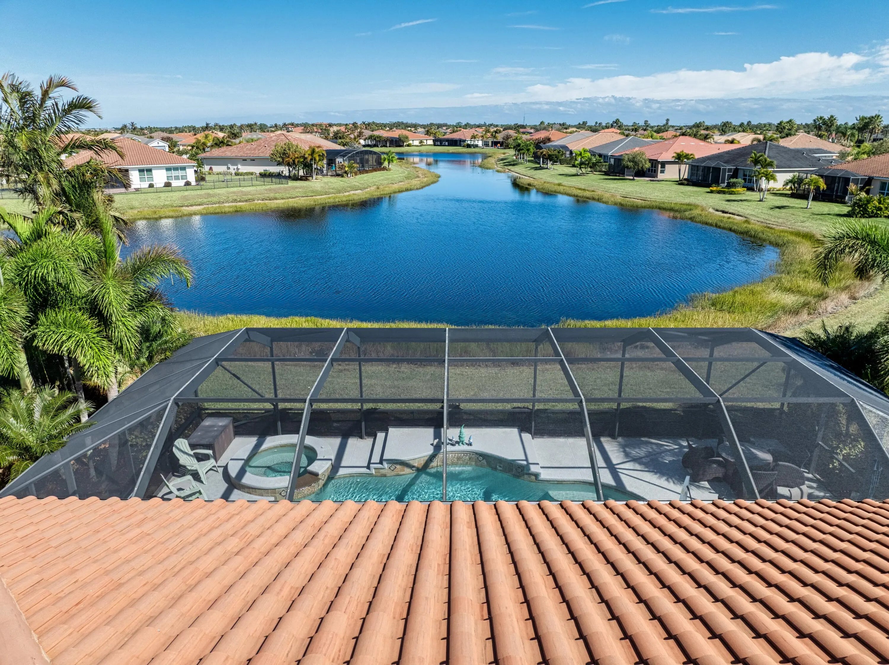 Stunning 4-bedroom, 3-bath home with den and a resort-style pool overlooking a breathtaking long lake view. This meticulously upgraded residence offers a blend of luxury and efficiency, featuring impact glass windows, a tile roof, whole-house generator, solar panels, new A/C, tankless water heater, full house water filtration system, and newer washer/dryer—all designed for peace of mind and modern living. The heart of the home is a gourmet kitchen showcasing high-end countertops, premium cabinetry, top-of-the-line lighting and fans, and an open layout that flows seamlessly into the family room and dining area. Every main living space is framed by panoramic views of the screened lanai, sparkling pool with spa and water feature, travertine flooring, and the picture-perfect lake beyond. The oversized primary suite is a private retreat with plantation shutters, custom walk-in closets, his-and-her vanities, and an expansive walk-in shower. Bedrooms two and three are located near the front of the home with a shared bath perfectly positioned between them. The fourth bedroom is versatile, ideal for guests or a home office, with a nearby full bath featuring a sleek seamless glass shower door. Additional upgrades include Toto toilets throughout, designer finishes, and thoughtful details at every turn. From the stunning lake views to the impeccable upgrades, this home delivers luxury living at its finest.
