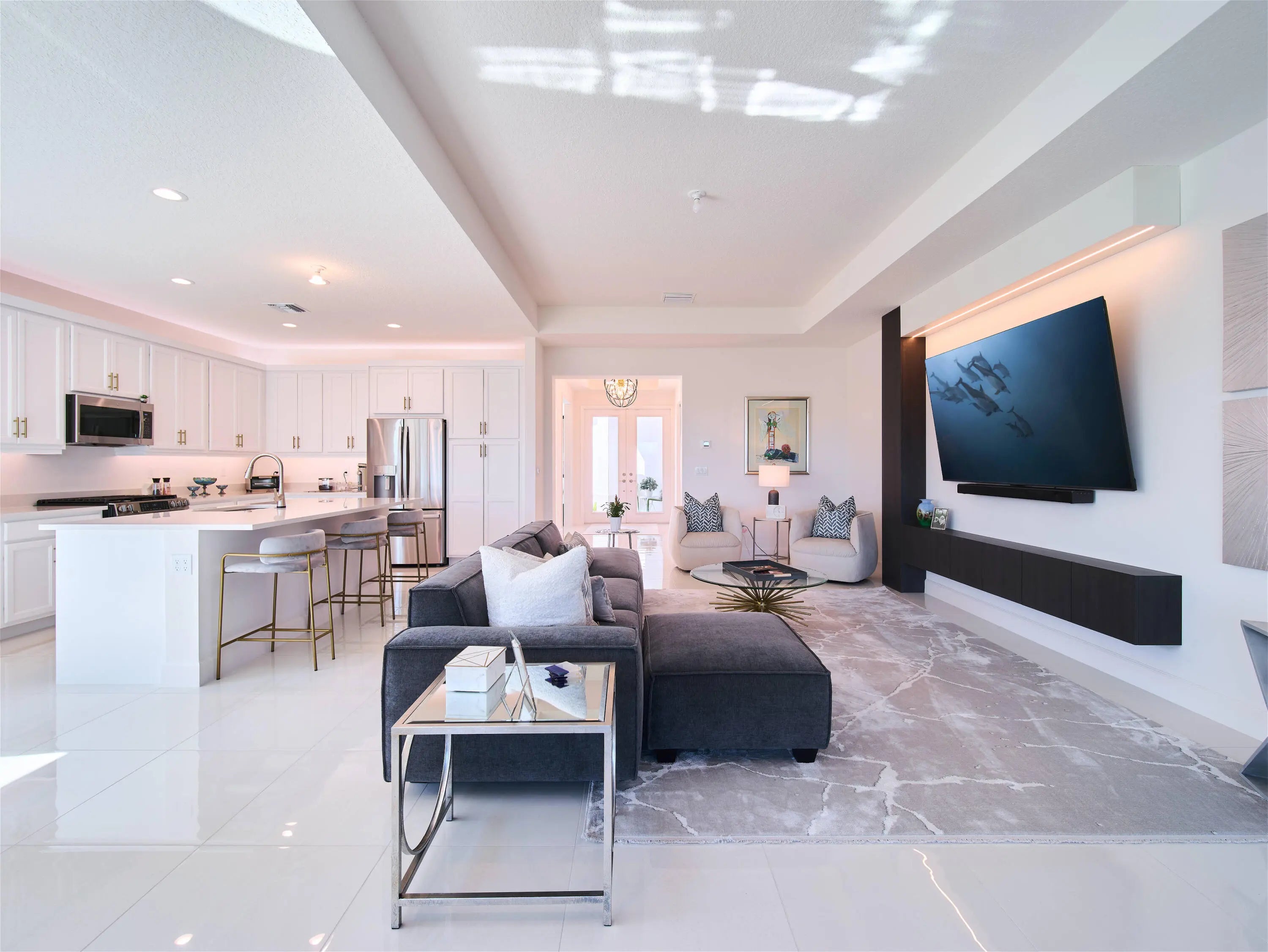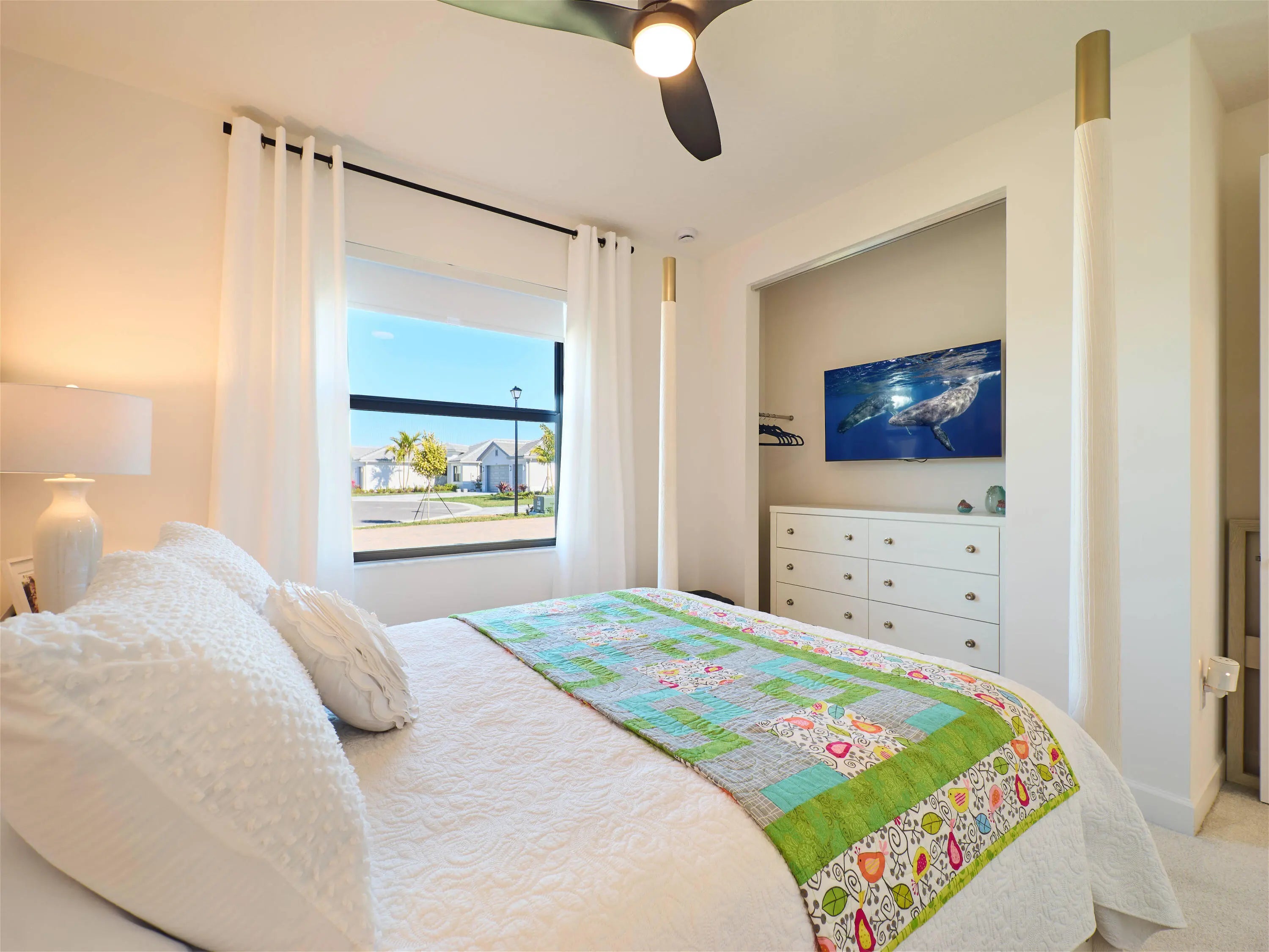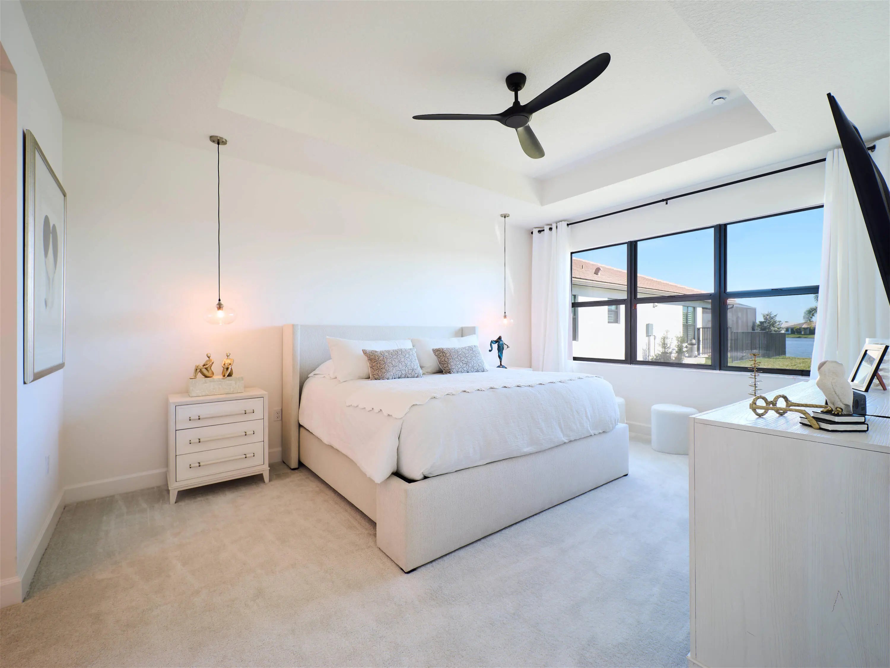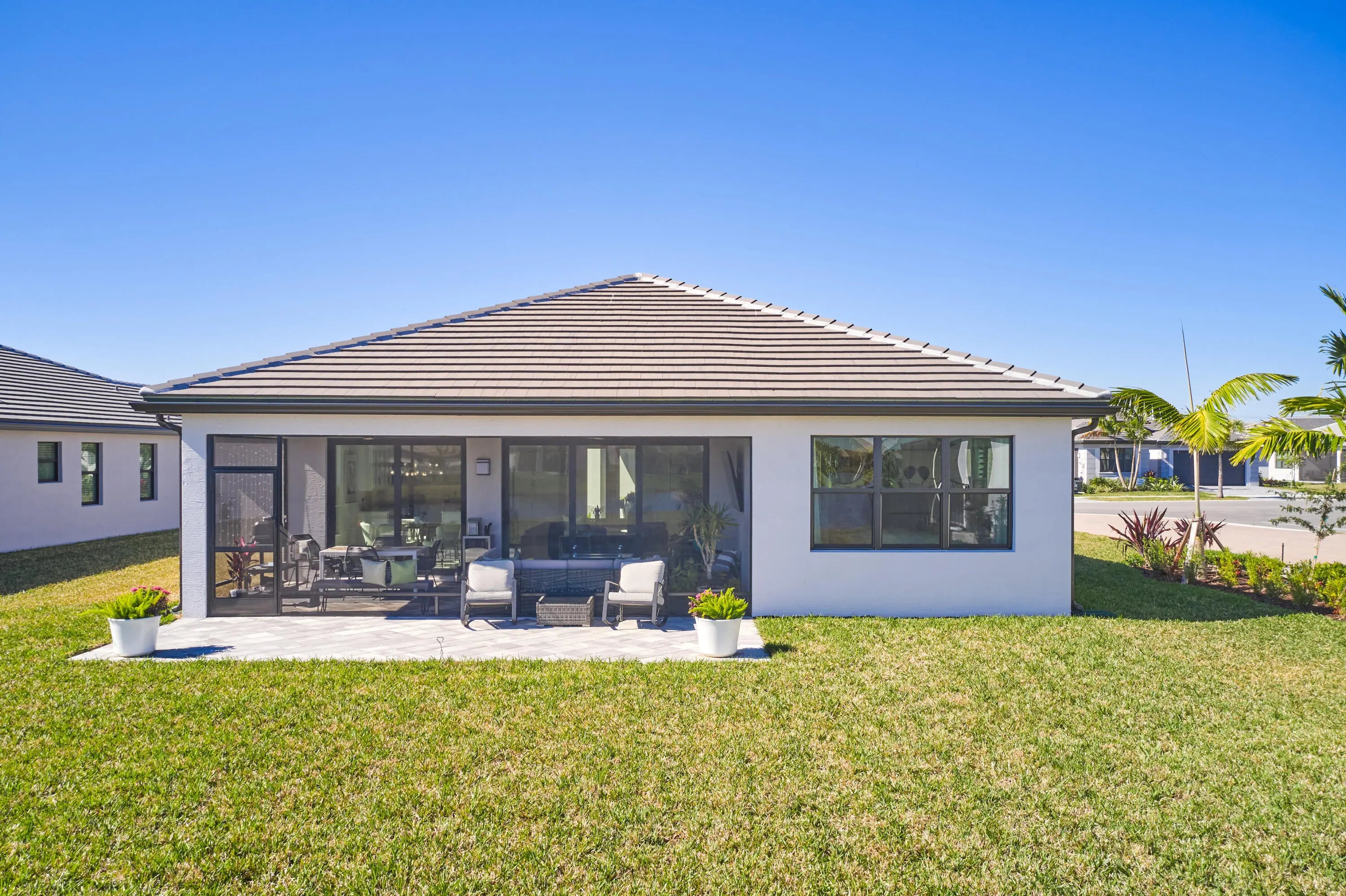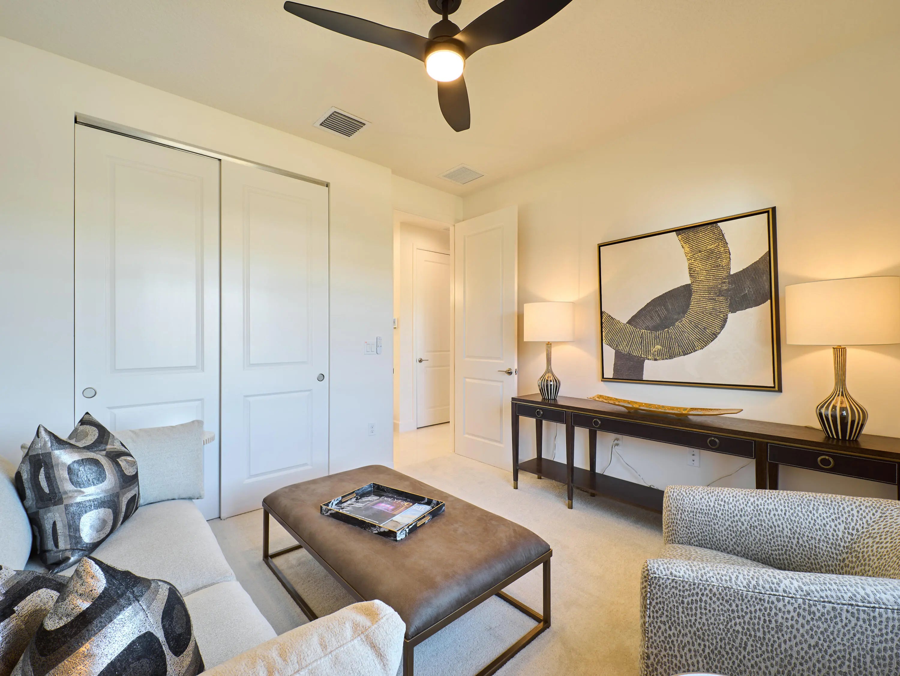 Stunning and better than new! This 2025-built residence in the prestigious Valencia Parc at Riverland is the epitome of ''picture-perfect'' living. Showing like a true model, this 3-bedroom plus den, 2.5-bathroom Palazzo home offers a rare combination of high-end interior luxury and an expansive outdoor footprint that is hard to find. Step through the elegant glass entry doors to find an open-concept sanctuary featuring large polished tile flooring and upgraded finishes throughout. The gourmet kitchen is a chef's dream, boasting bright white cabinetry with gold accents, quartz countertops, and a large social island. High-end GE appliances, premium over/under-mount lighting, and custom built-ins for the pantry make this space as functional as it is beautiful. The light-drenched living and dining areas feature soaring tray ceilings and massive sliders that lead to your private oasis. Retreat to the primary suite, where you'll find oversized windows with custom treatments and a luxurious en-suite bathroom complete with mirrors to the ceiling, a frameless shower with floor-to-ceiling tile, and a sparkling chandelier. The exterior is truly the "crown jewel" of this property. Enjoy serene, long lake views from your east-facing backyard, one of the largest in the community. The oversized covered and screened lanai has been upgraded with extended pavers and dual modern fans, providing the perfect spot for morning coffee or sunset entertaining. Enjoy access to the 34,000 sq ft clubhouse, boasting a grand social hall, state-of-the-art fitness center, card rooms, a café with indoor and outdoor dining, a resort-style pool, a covered patio with a fire pit, a sports lounge, and a full-time lifestyle director dedicated to enhancing your experience. Riverland, a 4,000-acre master-planned community, offers an unparalleled lifestyle. 1 Residents enjoy a 16-acre Sports & Racquet Club, a 51,000 sq ft Wellness & Fitness Center, a 5-acre Arts & Culture Center with an 11,550 sq ft Creativity Hub, multiple city parks, and a future Town Center, making this an exceptional place to call home.