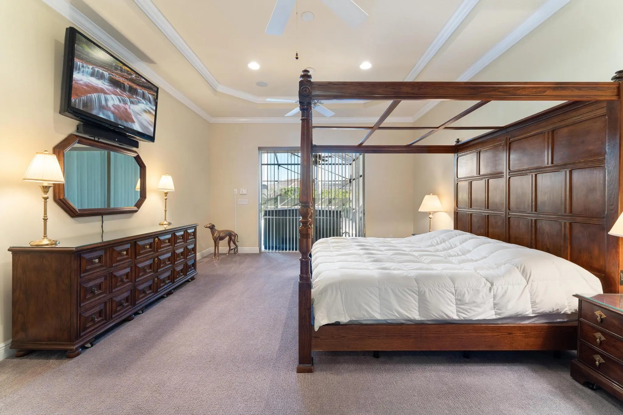 Welcome to this well-maintained 3-bedroom, 3.5-bath home with a 3-car garage and open, functional layout. Features a screened-in pool ideal for year-round enjoyment and accordion shutters for added storm protection. Major upgrades include a full-house gas generator, gas water heater, crown molding throughout and a premium metal roof (installed in 2025 and cost $100,000 value) providing durability, efficiency, and insurance benefits. Spacious living areas with abundant natural light make this home move-in ready. A solid, well-equipped property offering comfort, security, and long-term value. Jacuzzi, outside tv and tv in primary suite convey.