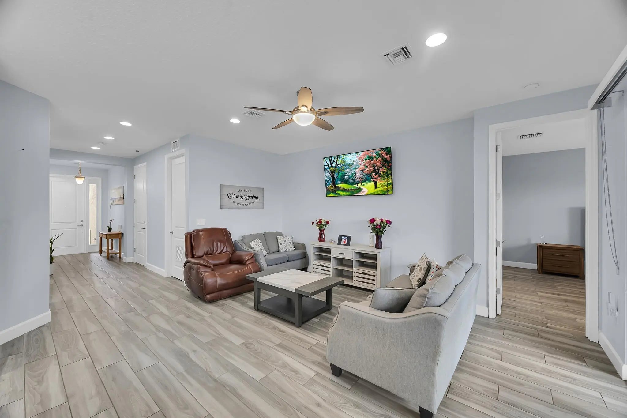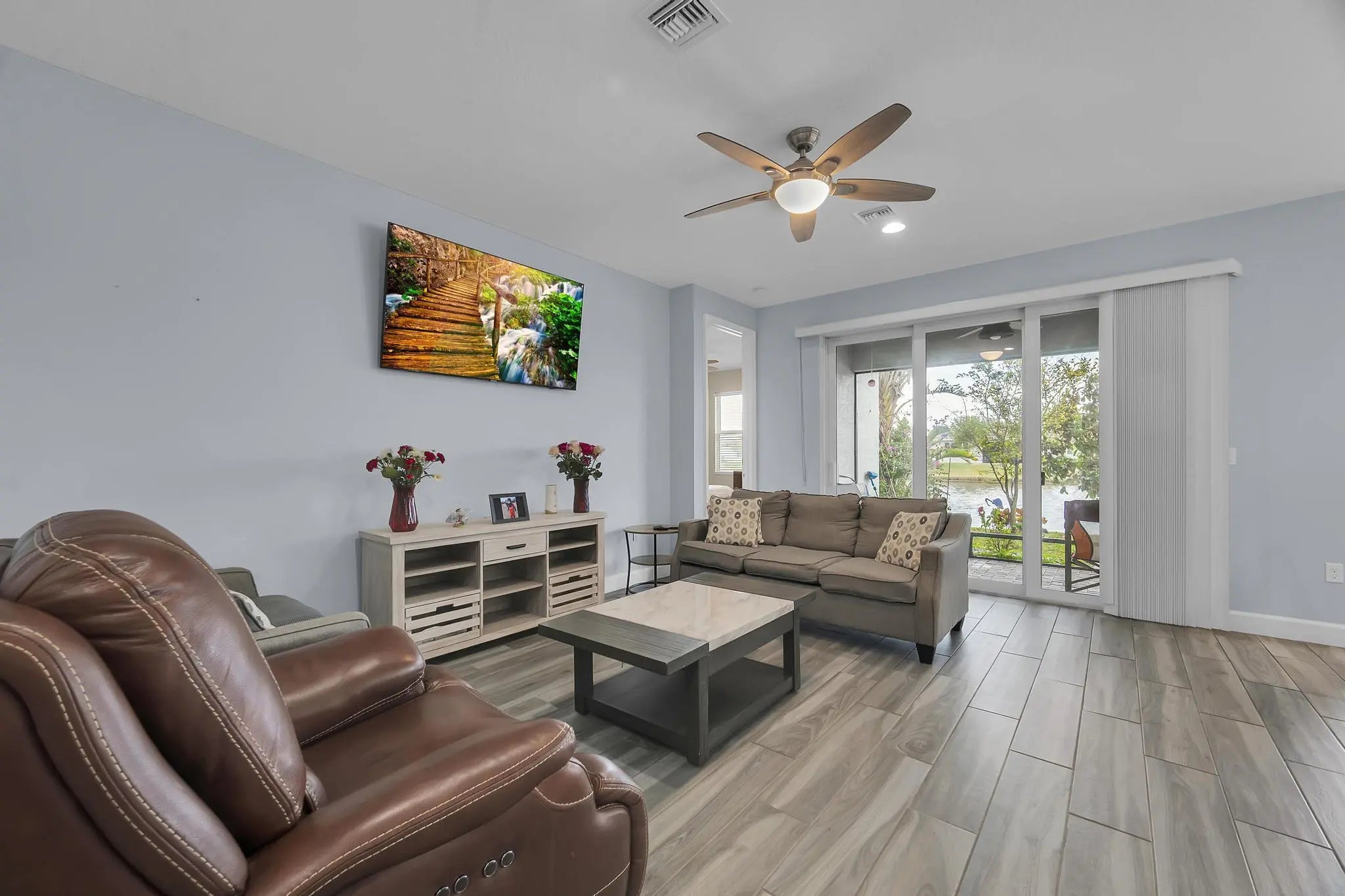 Welcome to 12127 SW Jasper Lake way in beautiful Port Saint Lucie, a 2019 lakefront home in a sought-after 55+ community with lawn care included. Enjoy peaceful water views and maintenance-free living. This well-maintained home With 2 spacious bedrooms, 2 full baths + a den. Features impact windows throughout & added recessed lighting for a bright, modern feel. No carpet, tile flooring throughout. Both baths offer shaded shower windows; guest bath has a walk-in shower and the primary bath features full mirrors. Upgraded kitchen with full backsplash and extended cabinetry. Water softener, hard-wired smoke alarms, and plantation blinds. Resort-style, Residents enjoy an impressive lineup of amenities • Basketball • Bike & Jog Paths • Billiards • Pool • Café/Restaurant • Clubhouse • Fitne