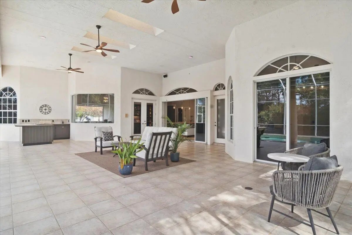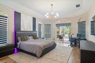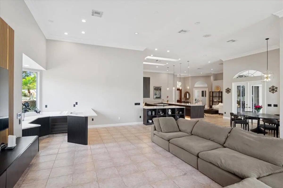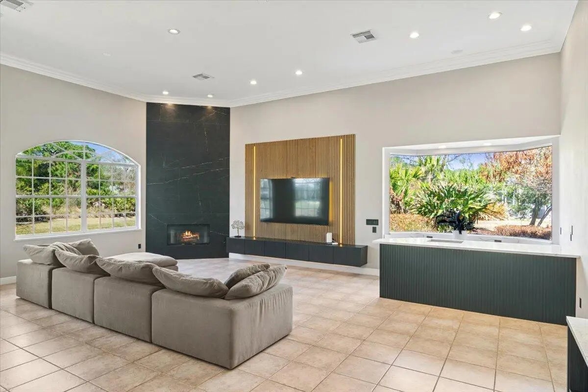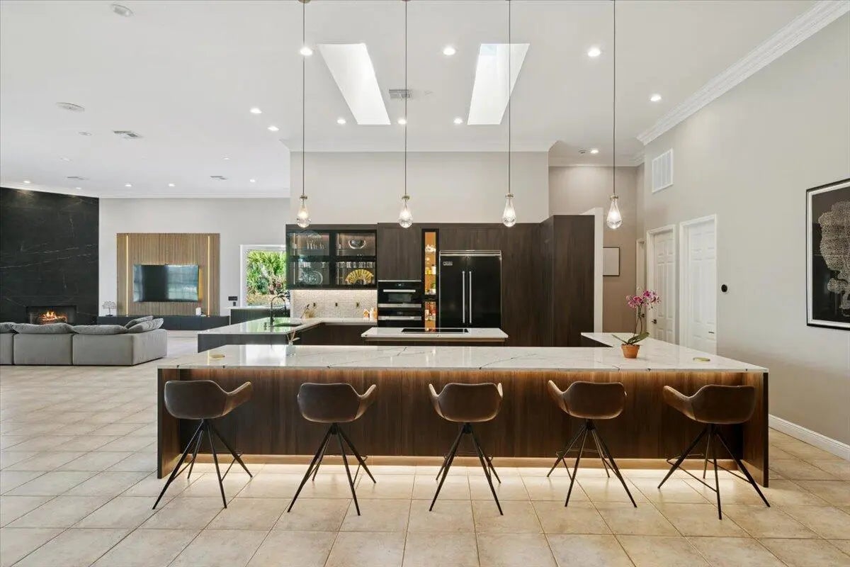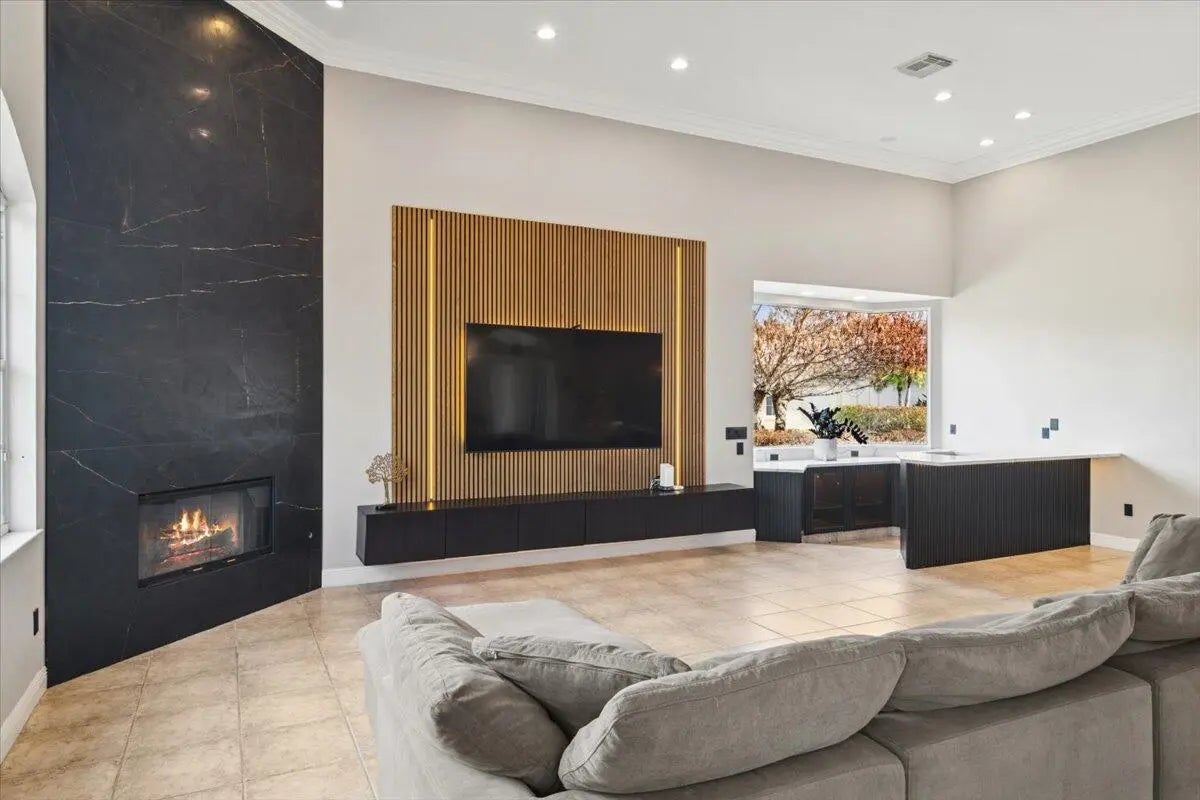 Experience elevated modern living in this fully designer-renovated 5-bedroom, 4.5-bath residence (5th bedroom currently configured as a private office) with a 3-car garage and exceptional indoor-outdoor entertaining spaces. No detail has been overlooked in this extensively upgraded smart home featuring LED lighting throughout interior and exterior spaces, Home Assistant integration, and 2025 Google Nest smart thermostats. The 2024 custom-designed chef's kitchen is a true showpiece, anchored by a dramatic 16' x 8.5' L-shaped island finished in Pompeii Diamante quartz. Custom Gola handleless cabinetry includes touch-latch access, soft-close drawers, aluminum-frame glass doors, Blum Aventos Servo-Drive lift systems, motorized drawer systems, and an integrated motorized waste pull-out. Premium appliances include a Miele 36" induction cooktop with 36" downdraft ventilation, Miele Pure Line wall oven, Miele speed oven, and a Viking 42" built-in refrigerator. Additional highlights include a Kraus Bellucci workstation sink, under-cabinet LED lighting, RH Raindrop pendants, dual pantry storage areas, and pop-up island outlets with USB A/C and induction charging. The primary suite offers a true luxury retreat with tray ceilings, a custom LED feature wall, wood-look tile flooring, sliding glass doors with pool access, and custom walk-in closets with integrated LED lighting and motion sensors. The fully renovated 2025 primary bath showcases 48" porcelain tile, a freestanding 67" soaking tub, dual travertine sinks, floating LED-lit vanity cabinetry, matte black Kohler designer faucets, and an oversized walk-in shower featuring frameless 120" glass panels, rain head and multifunction shower system, thermostatic precision valve, low-profile LED-lit curb, and illuminated surround. A smart bidet toilet with heated seat, auto open/close, auto flush, and drying system completes the spa experience. The living room centers around a stunning 14' floor-to-ceiling porcelain slab fireplace feature wall and custom 85" media wall with integrated ambient lighting. Bose in-ceiling speakers and dedicated indoor/outdoor audio zones enhance the entertainment experience. A newly completed 2025 custom bar area features quartz countertops, contemporary black slat panel detailing, a two-drawer refrigerator, and LED accent lighting. Outdoor living is equally impressive with a 2023 saltwater pool system, 2023 heater replacement, and 2025 pump. The fully equipped outdoor kitchen includes a 2025 Kenyon 30" electric grill, dual electric burners, stainless storage drawers, and sink. LED patio downlighting, driveway lighting, and new ceiling fans enhance the covered entertaining space. Additional upgrades include brand new Zebra shades throughout (2026), USB A/C outlets in all bedrooms, custom LED-lit laundry room cabinetry with Blum Aventos hardware, and a 2024 Samsung AI washer and dryer. This is a rare opportunity to own a meticulously upgraded, technology-forward luxury home designed for both elevated everyday living and large-scale entertaining